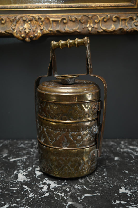 Vintage Brass Tiffin Carrier | Hand-Engraved 3-Tier Food Container with Handle