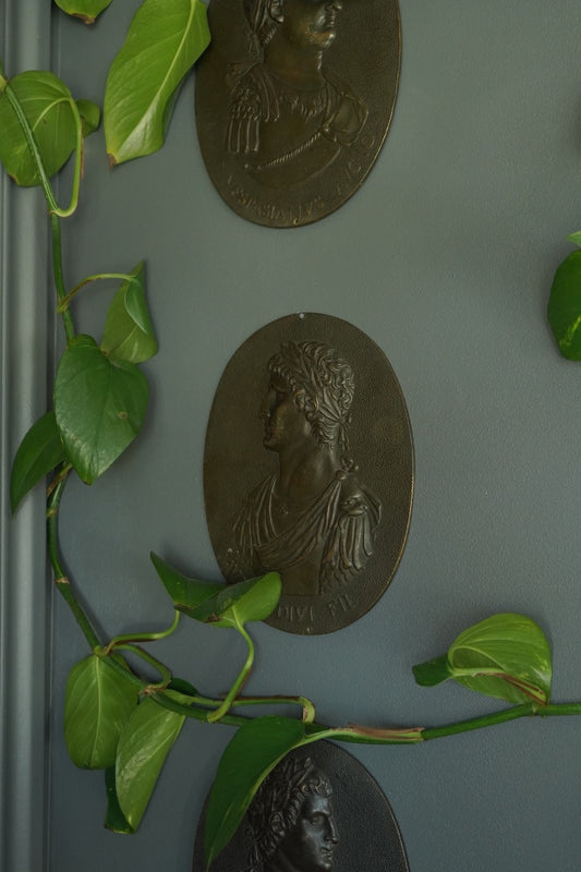 Set of 3 Antique Grand Tour Bronze Portrait Plaques – Roman Emperors Vespasian & Augustus, 19th Century Italian