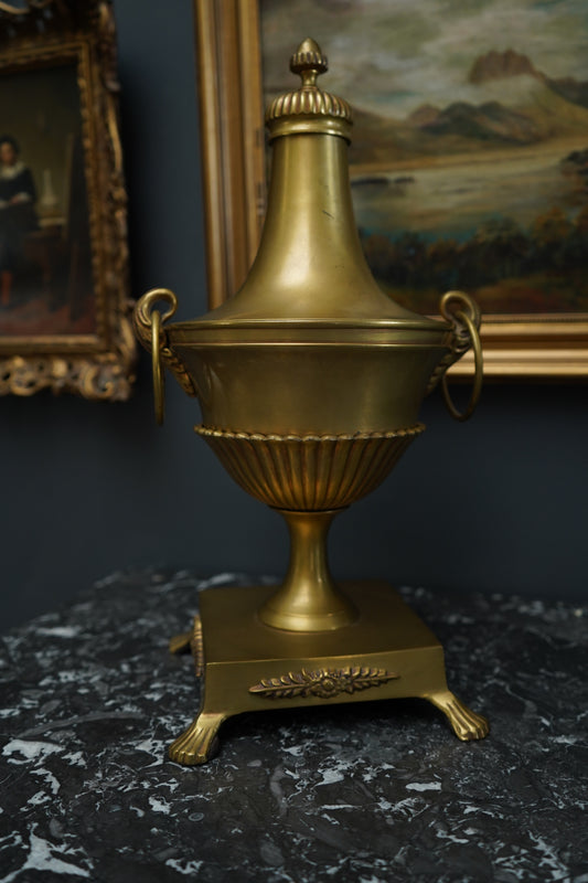Antique Neoclassical Brass Urn with Lid and Laurel Motifs – Late 19th Century Decorative Mantel Piece
