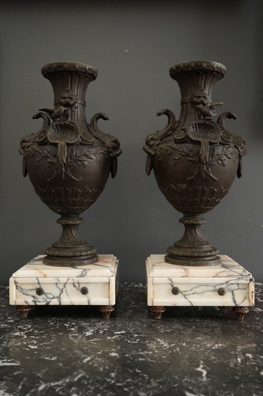 Pair of 19th Century French Napoleon III Style Spelter & Marble Urns