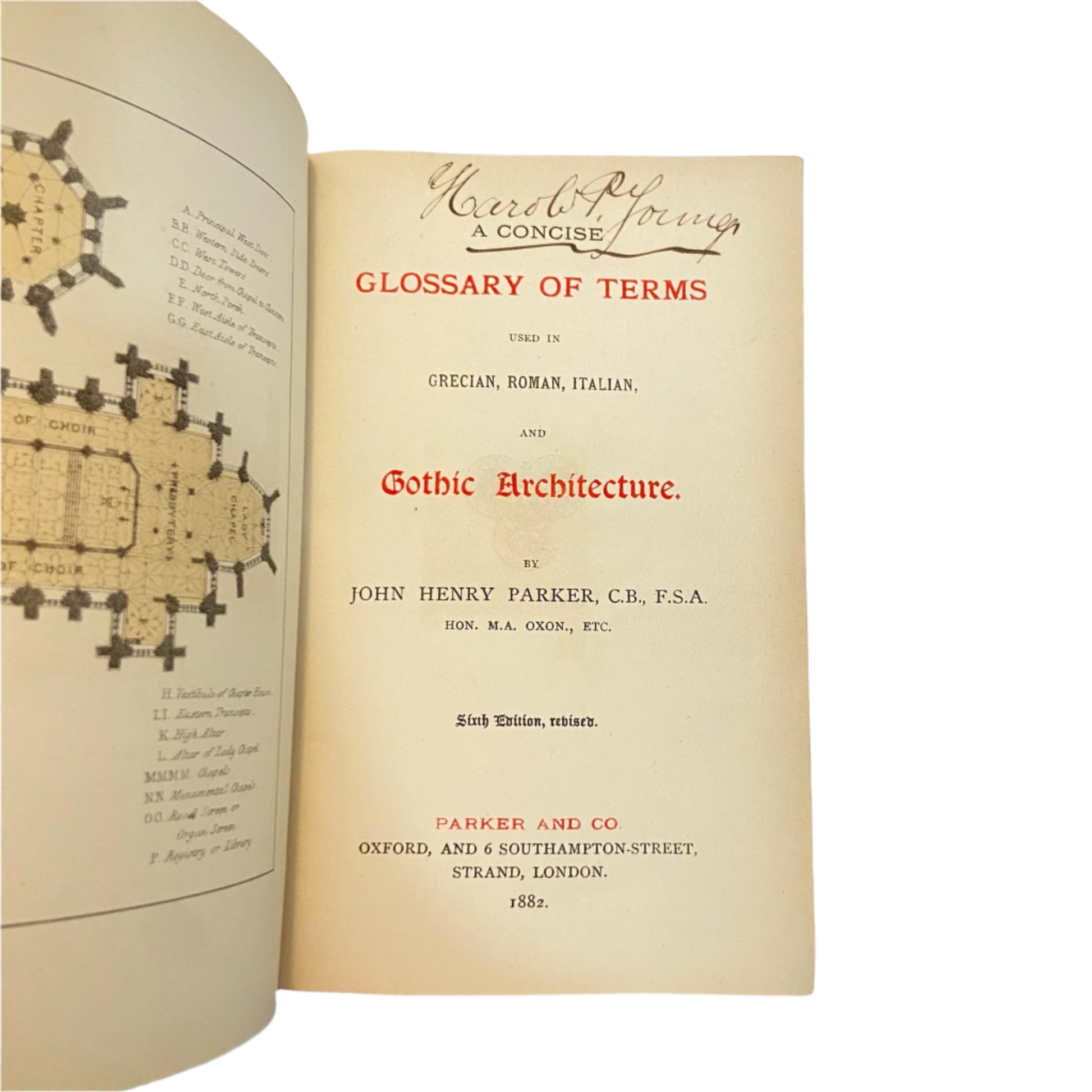 This is a beautiful and collectible 1882 edition of A Concise Glossary of Terms Used in Grecian, Roman, Italian, and Gothic Architecture by John Henry Parker, C.B., F.S.A., published by Parker and Co. in Oxford and London. Written during the height of the Victorian Gothic Revival, this glossary served as a practical and scholarly reference for students, architects, and antiquarians seeking to understand and accurately use architectural terminology. Parker, a prominent archaeologist and historian, compiled the glossary to make the complex vocabulary of classical and medieval architecture accessible to a growing audience eager to preserve, study, and emulate historical styles—especially those seen in cathedrals, churches, and public buildings. The book was part of a broader 19th-century movement to document and celebrate Britain’s architectural heritage with scholarly precision, and this revised sixth edition reflects the period's passion for cataloguing and restoring historic design elements.