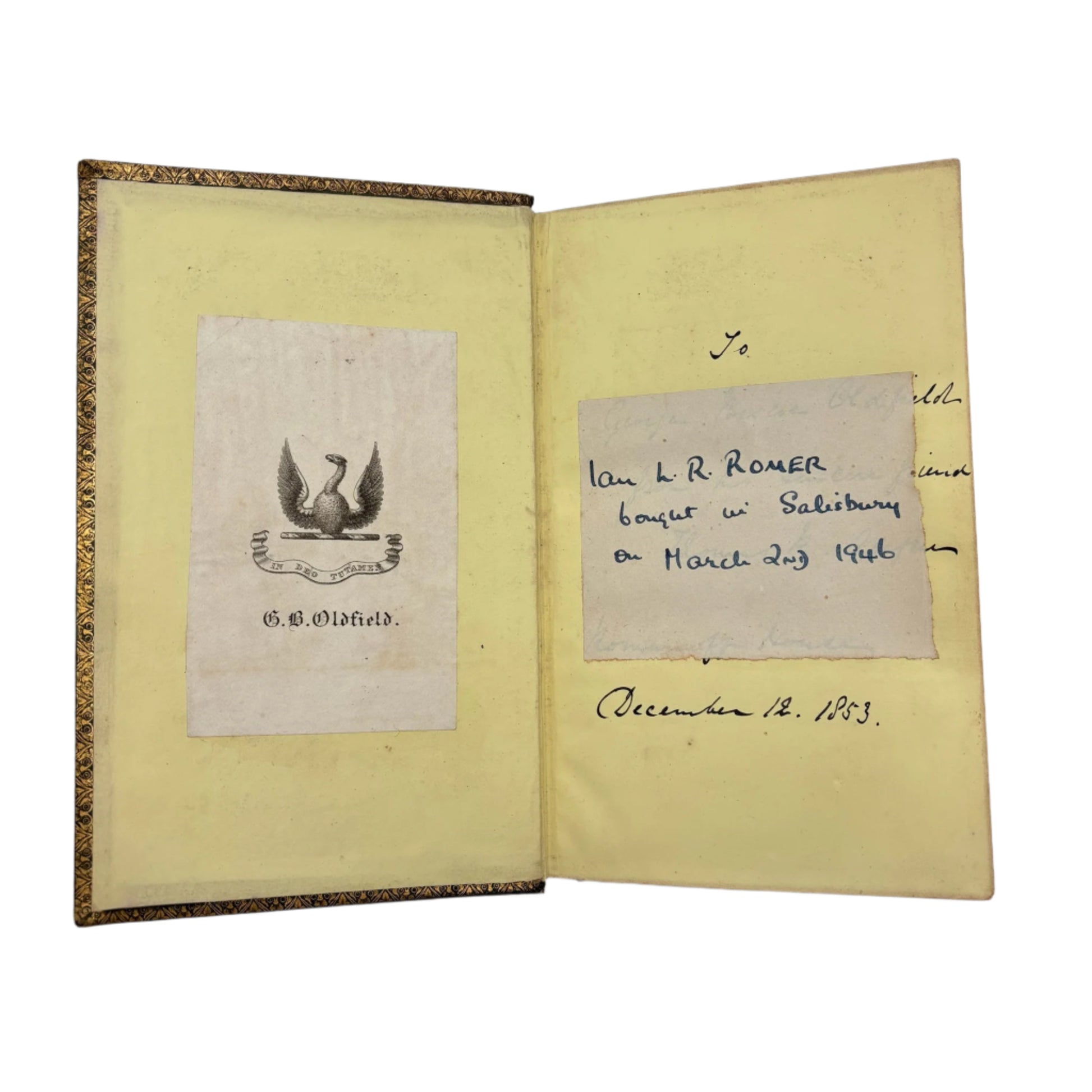 This antique book is in very good condition for its age and shows gentle, natural wear that adds to its charm. The green morocco leather binding remains sturdy with light rubbing to the spine ends and corners, while the gilt decoration on the covers and spine is still bright and eye catching. The gilt page edges are clean and glowing. Inside, the pages show the warm age toning typical of mid nineteenth century paper with scattered foxing around some of the engraved plates. The hinges are secure and the binding remains tight. The book retains a printed bookplate and two handwritten ownership notes that add to its historical appeal. Overall, it is a well preserved and highly decorative Victorian volume.