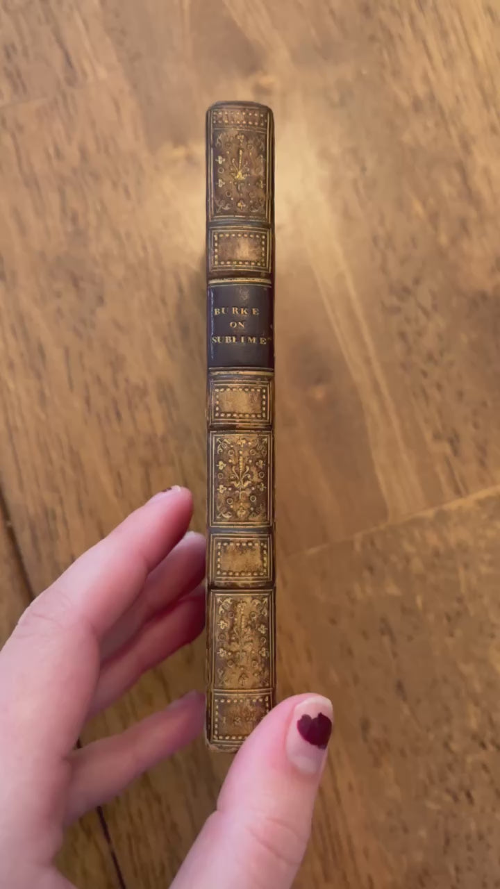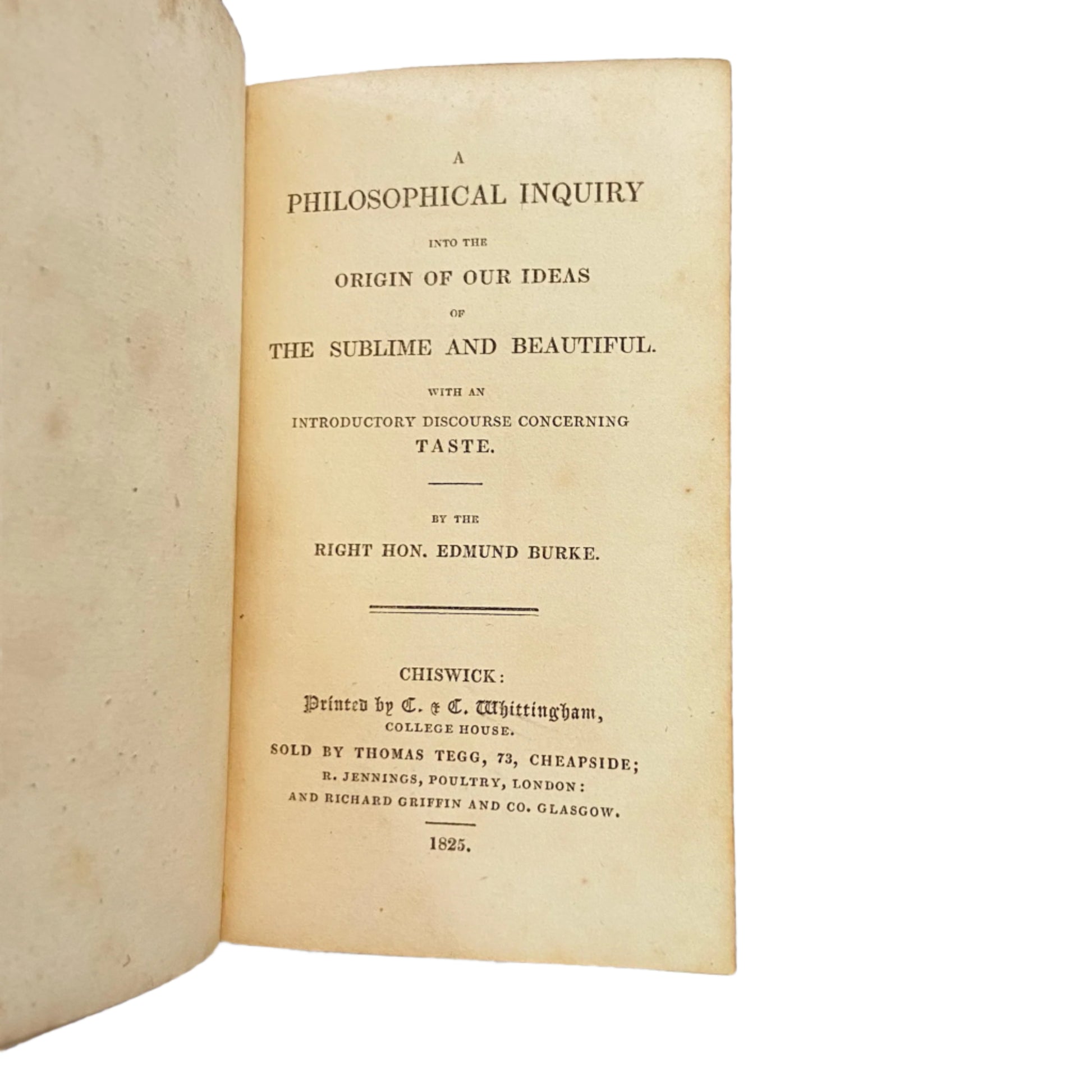 This 1825 edition of A Philosophical Inquiry into the Origin of Our Ideas of the Sublime and Beautiful by Edmund Burke is a beautifully bound and intellectually important work in the world of art, literature, and design. First published in 1757, Burke's writing explores how beauty and the sublime affect us differently, laying the foundation for the Romantic movement and shaping how we think about emotion, contrast, and sensory experience. This edition was printed by C. & C. Whittingham in Chiswick and features a finely engraved frontispiece depicting a classical allegorical figure with cherubs beneath a rainbow. The binding itself is a showstopper: full polished olive-toned calf leather with richly tooled gilt borders and delicate gilt leaf corner motifs on both boards. The spine is intricately decorated with gilt floral tooling and features a black leather title label reading “Burke on Sublime.” Marbled endpapers, decorative gilt dentelles, and a tight, elegant presentation make this book just as beautiful to display as it is to read. Burke’s reflections on aesthetics remain relevant today and offer insight into the emotional power of art, architecture, and design. Whether you’re a collector, decorator, or simply love antique books with depth and beauty, this volume is both meaningful and stunning.