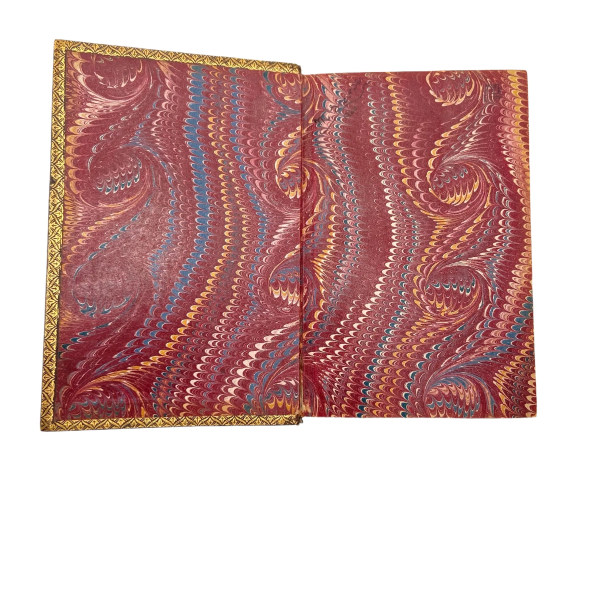 Bound in full deep brown morocco leather, the book features fine gilt tooling and dentelle turn-ins, giving it a regal and elegant presence. The all-edge gilt pages catch the light with a warm golden shimmer, while the marbled endpapers in rich red, gold, blue, and white provide a dramatic visual counterpoint. The interior pages include a series of engravings and highly stylized type, a hallmark of mid- to late-Victorian book design. Rossetti’s critical perspective, combined with Milton’s monumental poetry, creates a rich literary experience that reflects the intellectual culture of 19th-century Britain and its reverence for classical English literature.