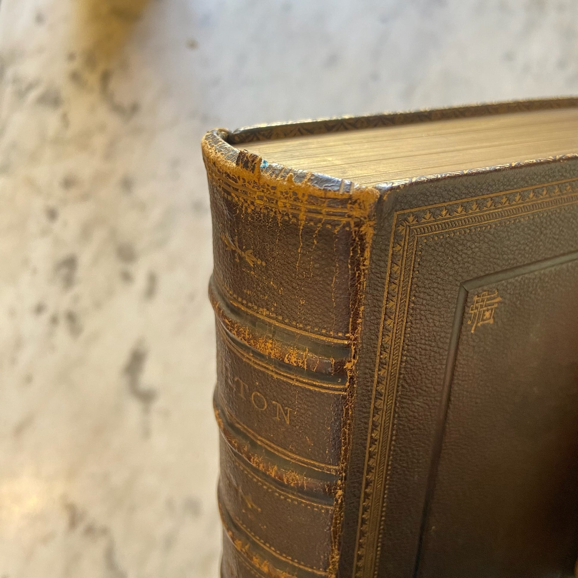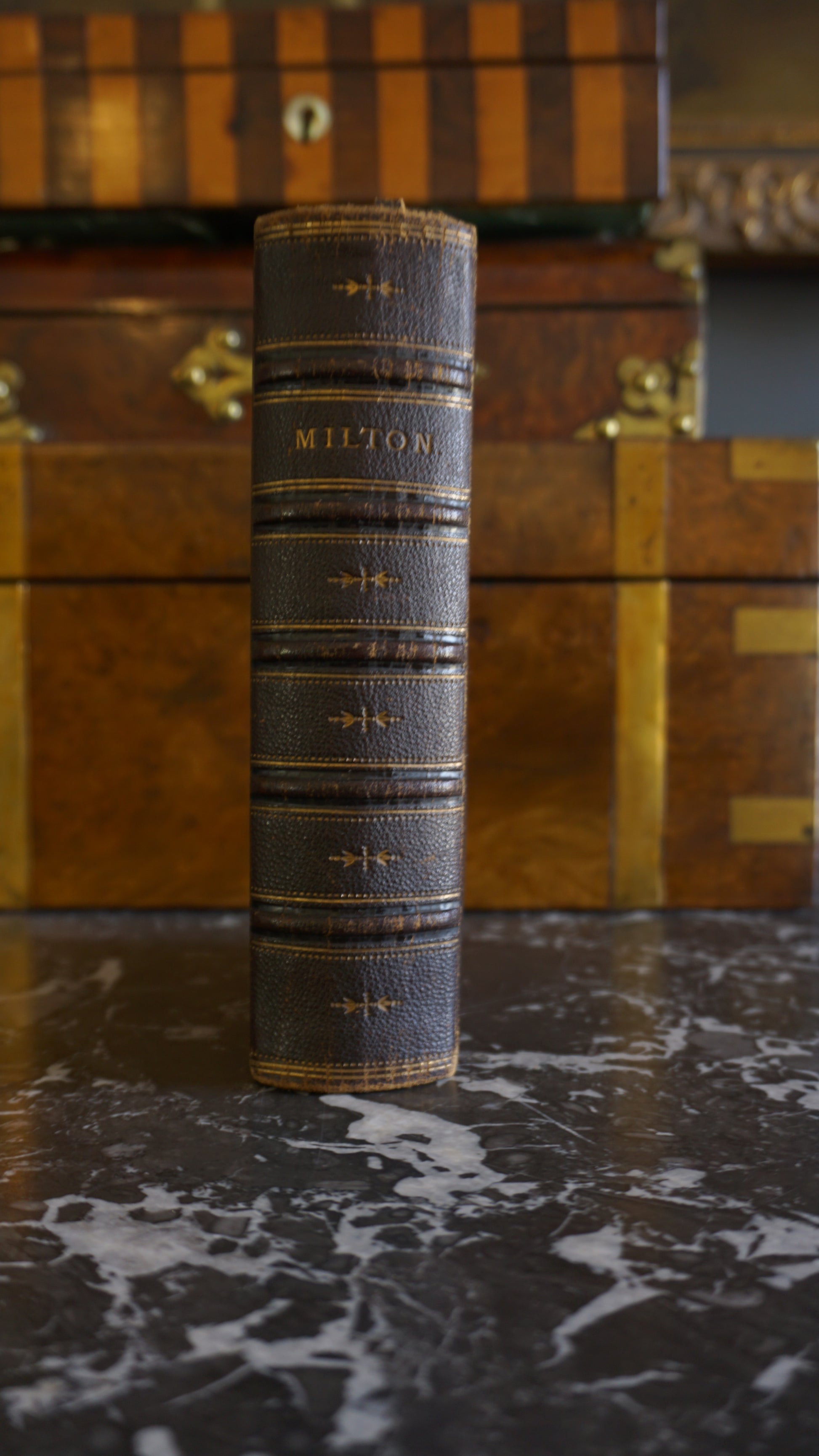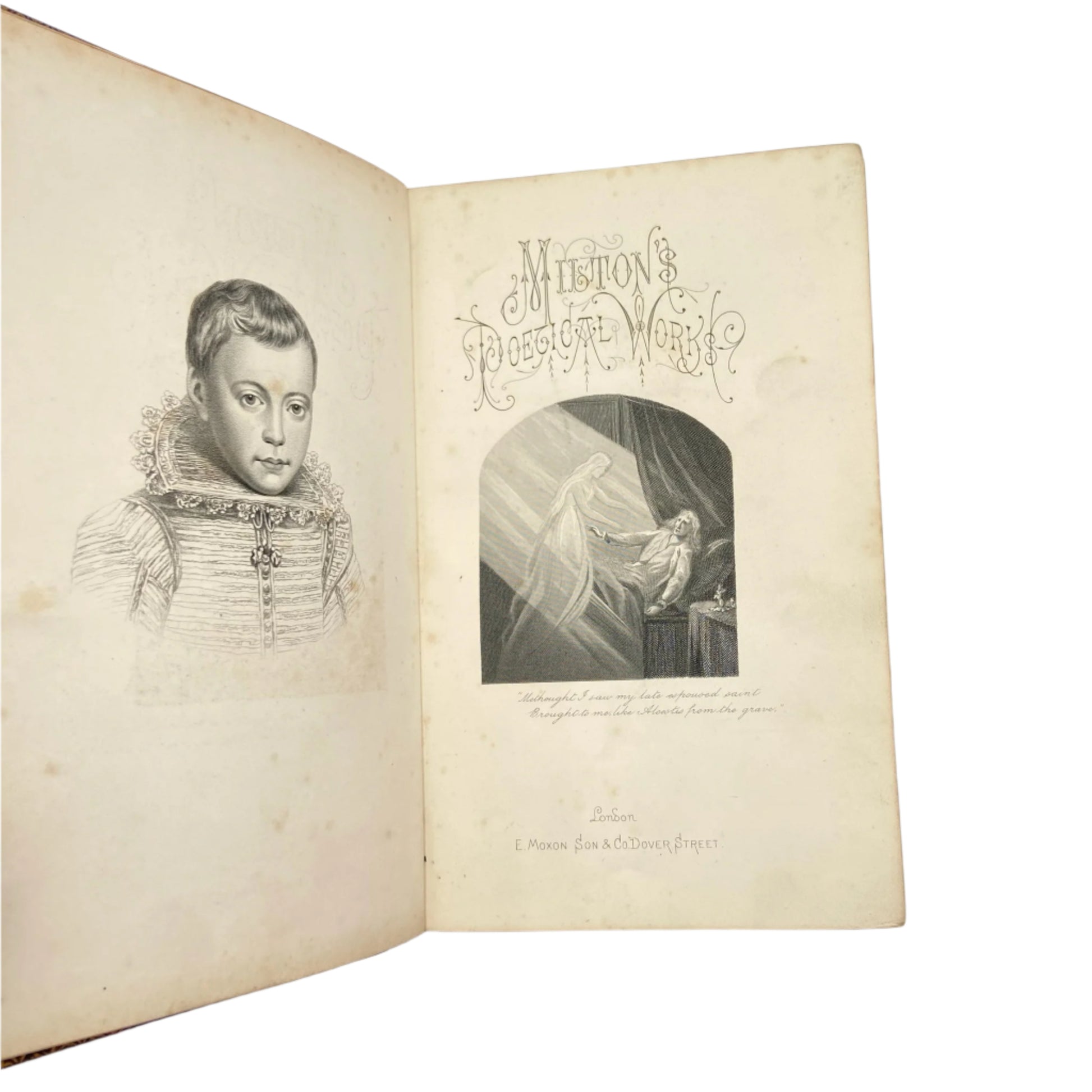 This beautifully bound 19th-century volume of The Poetical Works of John Milton is a stunning example of Victorian book craftsmanship. Edited by William Michael Rossetti and illustrated by Thomas Seccombe, this edition was published by E. Moxon, Son & Co., Dover Street, London, and includes an engraved title page and frontispiece portrait. Rossetti, a key figure in the Pre-Raphaelite movement, adds a layer of literary and artistic weight to the publication through his editorial work and critical memoir.