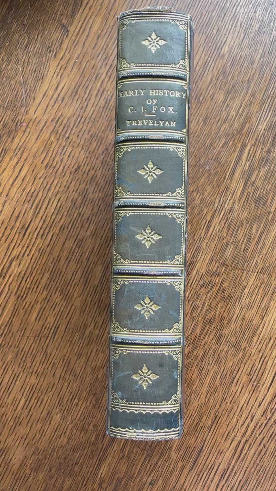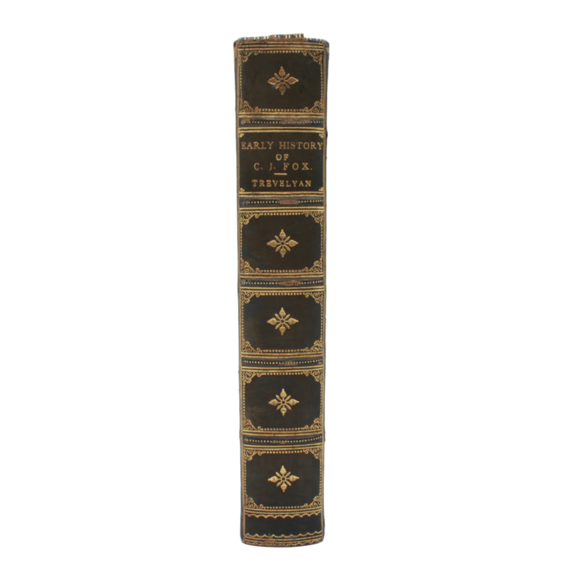 The binding is a fine example of a full or near-full leather presentation, with the front board displaying a gilt-stamped crest—likely from a school or institution that awarded the book as a prize. Gilt tooling along the board edges and around the spine compartments adds an ornate touch, and the raised (or faux-raised) bands divide the spine into panels decorated with floral or geometric motifs in gold. A gilt title, “Early History of C. J. Fox” and the author’s surname, “Trevelyan,” appear on the spine. This style of binding, often referred to as a “prize binding,” was popular in prestigious British schools and colleges, lending a sense of ceremony and durability to volumes intended as academic awards.