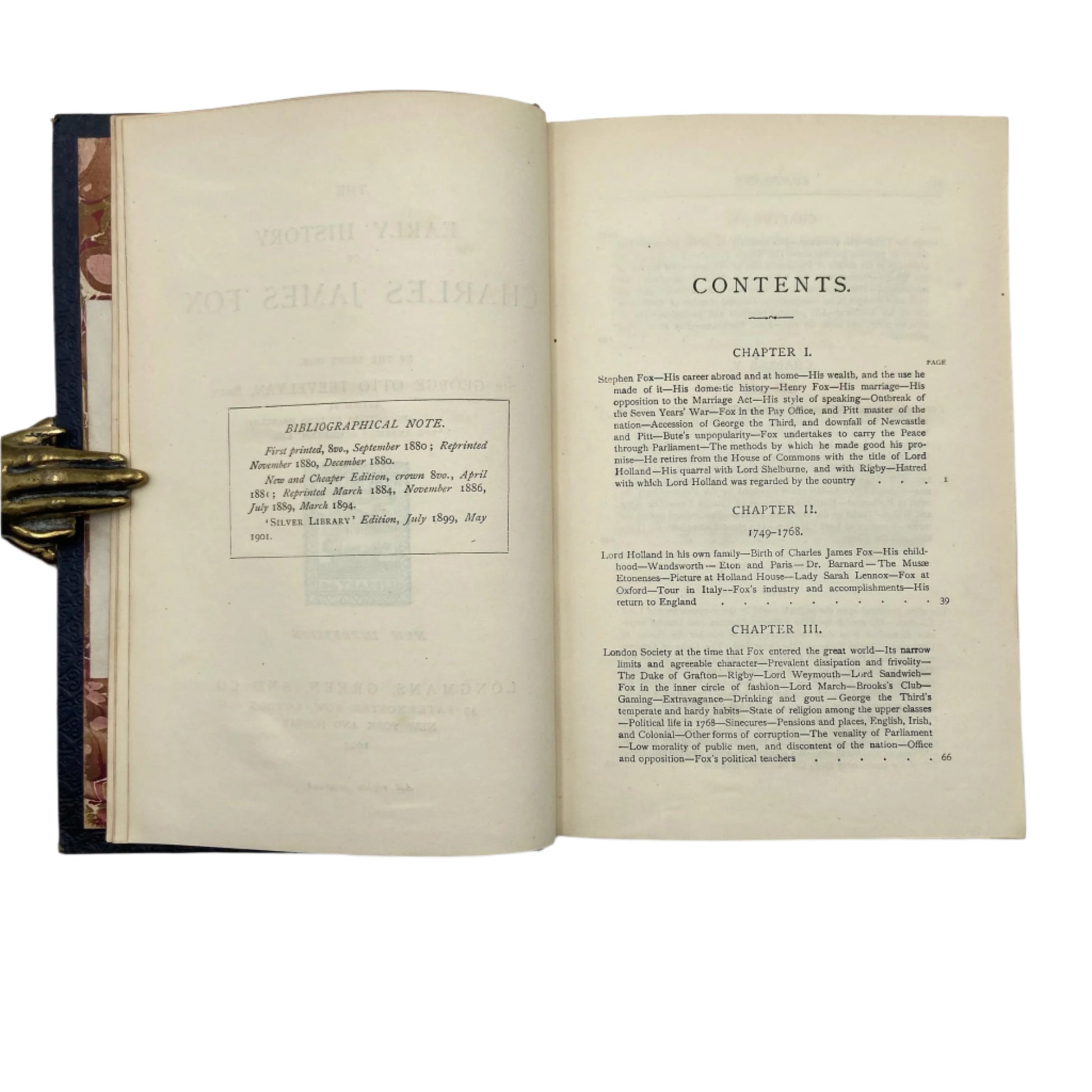 This copy of The Early History of Charles James Fox by Sir George Otto Trevelyan was published in 1901 by Longmans, Green, and Co. at 39 Paternoster Row, London, in what is labeled a “New Impression.” The book focuses on the formative years of Charles James Fox (1749–1806), an influential British Whig statesman known for his eloquence in Parliament, his advocacy of individual liberties, and his opposition to royal power. Trevelyan, a historian and statesman himself, sought to examine Fox’s political beginnings, family background, and early parliamentary career, highlighting how Fox’s ideas and personality were shaped by the tumultuous political climate of late 18th-century Britain. The work is both a scholarly biography and a broader commentary on the political, social, and intellectual environment that influenced Fox’s development into one of the most prominent liberal voices of his era.