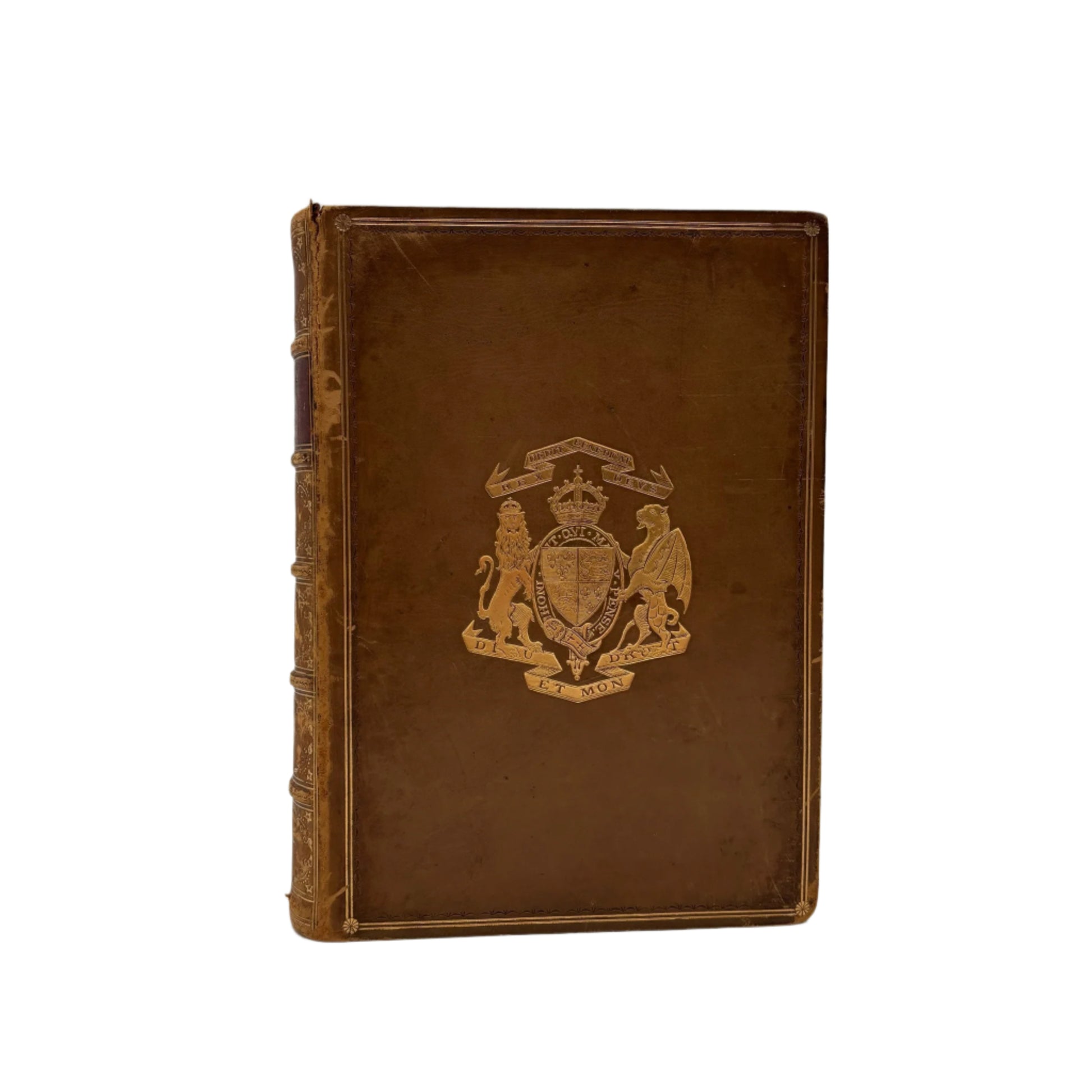This volume is in very good antique condition with gentle, expected signs of age. The full polished calf binding shows light rubbing at the corners and edges, a few natural surface marks, and a small chip at the head of the spine. The gilt royal arms crest remains bright and striking, and the spine gilt is still crisp with only minor wear. The joints are firm and the book opens well without looseness. The marbled endpapers and marbled fore edge show attractive, well preserved color with only light toning. The interior pages are clean overall with slight foxing near the prize plate but no major staining or damage. All illustrated plates are present and retain strong clarity. The book presents beautifully and remains both a collectible and highly decorative example of late Victorian binding work.