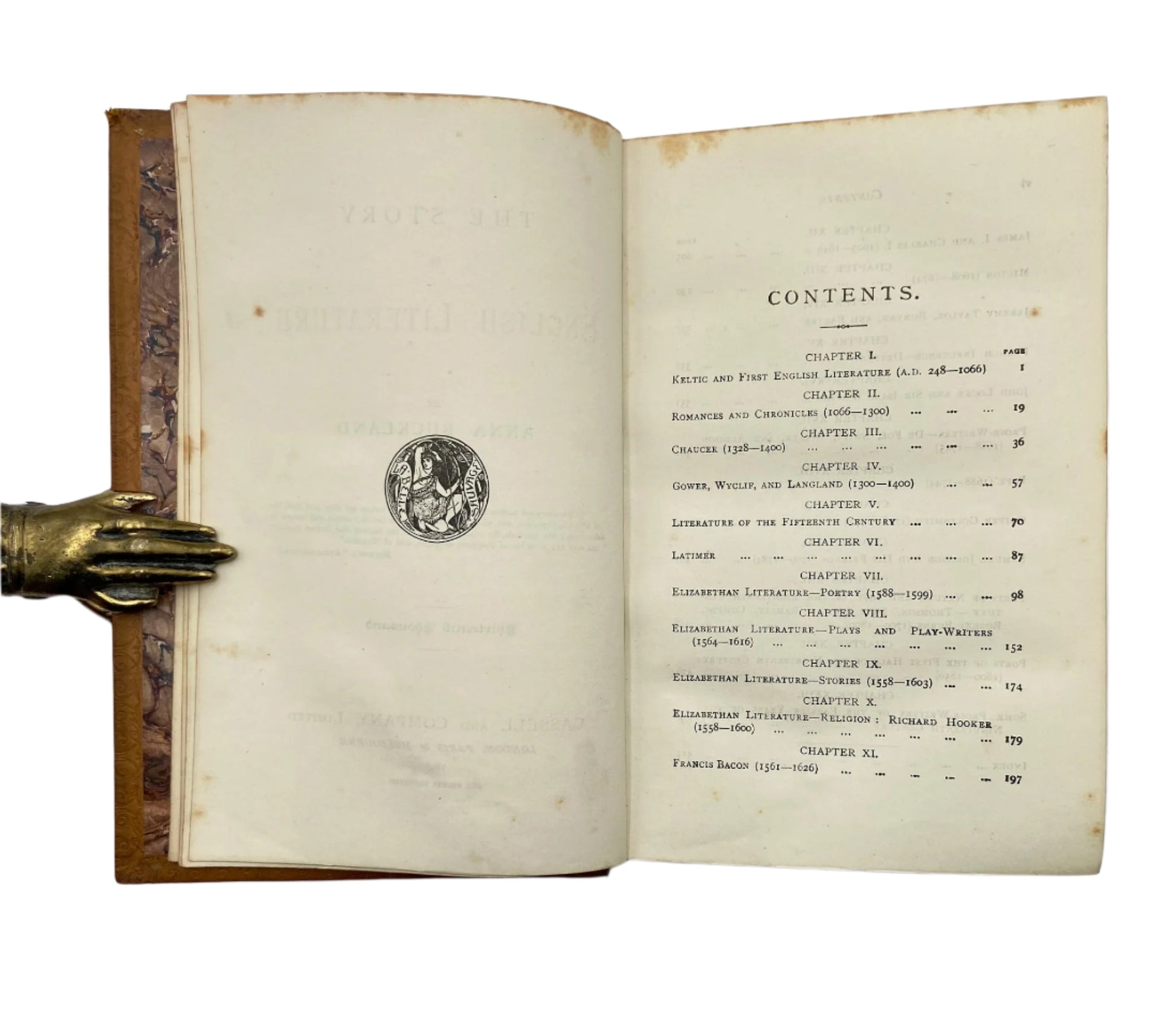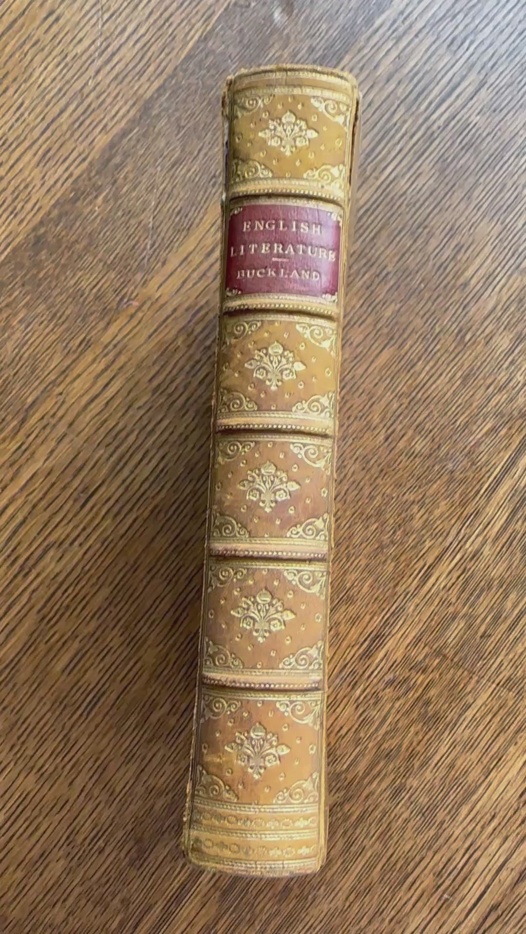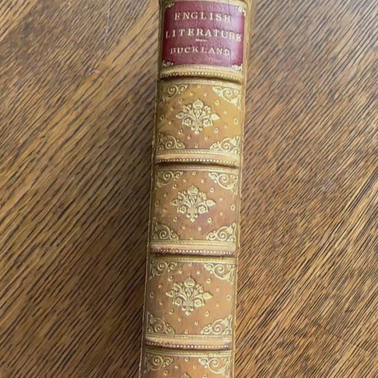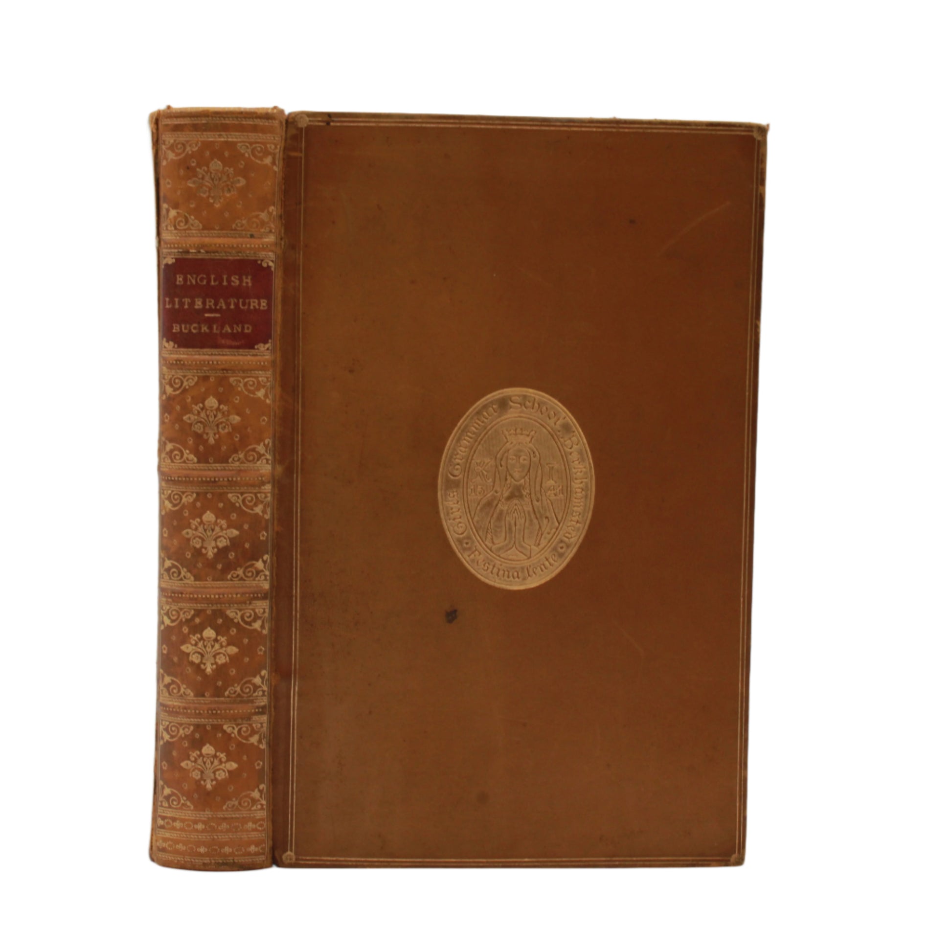 This late 19th-century edition, 1895, of The Story of English Literature by Anna Buckland offers a clear overview of English literary history, covering key authors like Chaucer, Shakespeare, and the Romantics. Designed for students and general readers, it traces major literary periods from medieval times to the Victorian era. The book features an elegant full leather binding with a gilt school crest and marbled endpapers, reflecting its use as a prize or presentation volume. It provides an engaging and easy-to-follow introduction to the development of English literature.