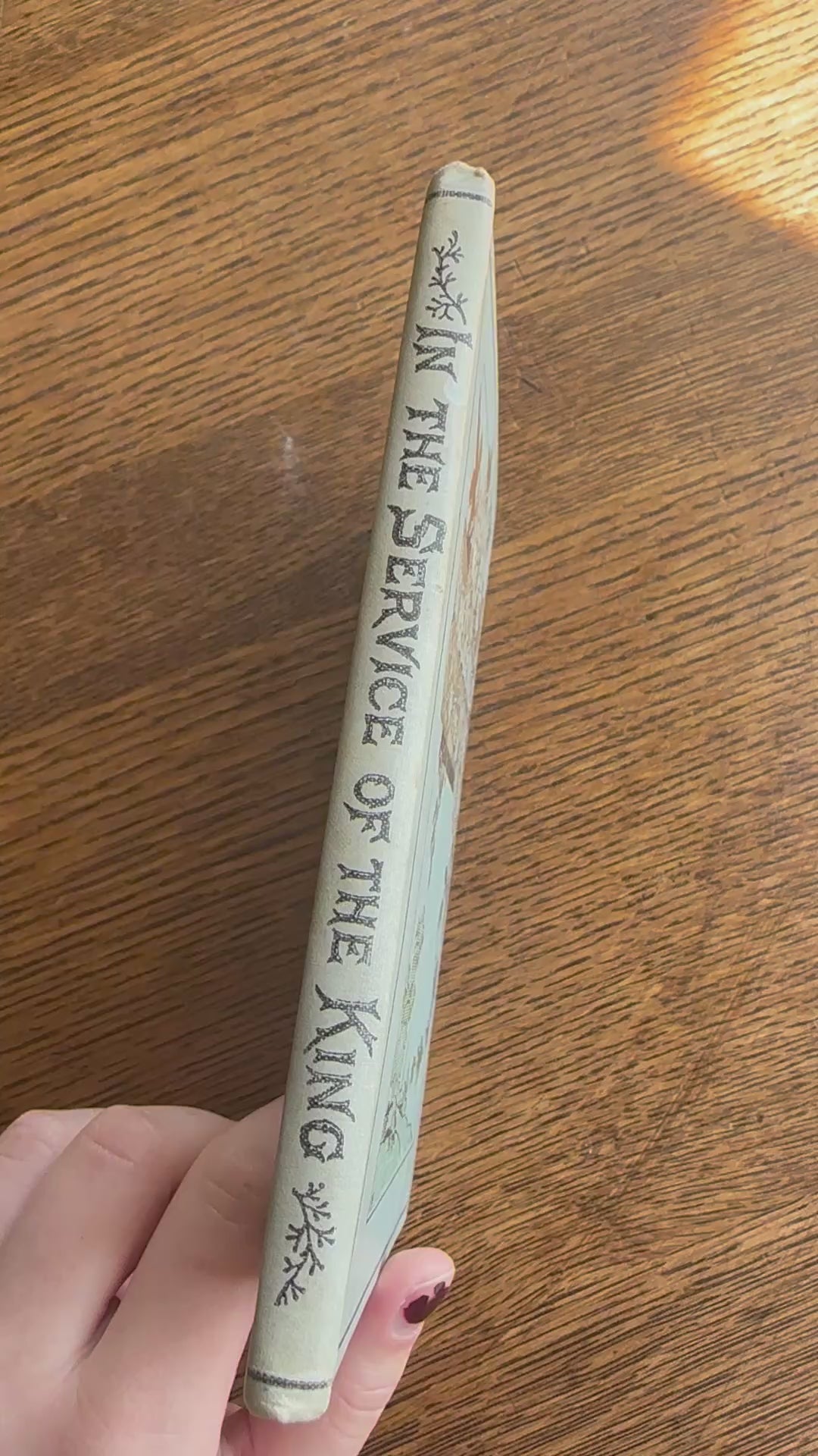 From the photographs, the binding is particularly striking. The pale green cloth cover is decorated with a multi-colored floral design, including leaves and blossoms in warm, autumnal tones. The title, “In the Service of the King,” appears within a stylized cartouche, blending neatly with the surrounding botanical motif. This sort of chromolithographic-style stamping was common in late Victorian book design, especially for religious or gift-worthy publications, and it adds a layer of visual charm that complements the devotional content within.
