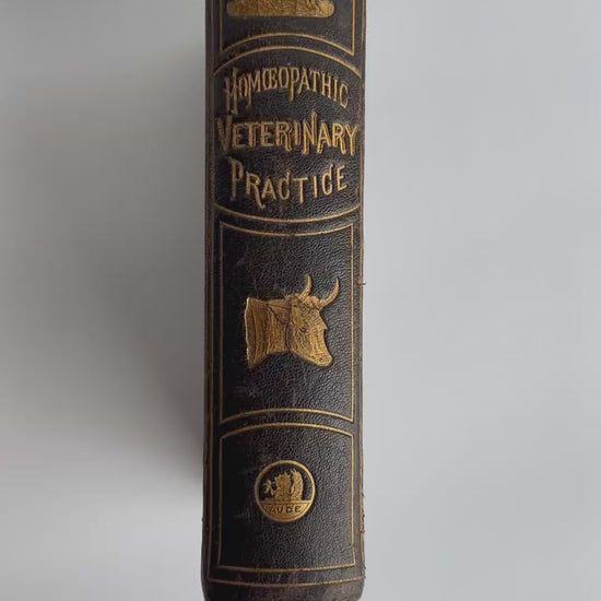 Published in 1881 by Boericke & Tafel, this antique veterinary manual offers a fascinating look into 19th-century animal care through the lens of homeopathy. Titled A Manual of Homeopathic Veterinary Practice, this second and enlarged edition was written to guide owners and caretakers of horses, domestic animals, and poultry in treating injuries, illnesses, and overall health using natural remedies. The book is richly illustrated with anatomical diagrams, including detailed plates showing how to determine a horse’s age by its teeth. Bound in handsome brown cloth with a black leather spine, the cover features gilt-stamped images of a horse and cow along with the title in ornate lettering. Red-stained page edges add a striking touch, making this book not only a conversation piece but a visual one as well. Whether you’re a veterinary history buff, an animal lover, or a collector of decorative antique books, this is a rare and compelling piece of agricultural history that bridges science, nature, and design.