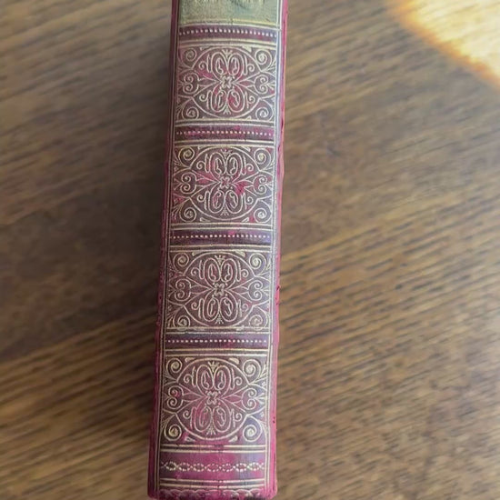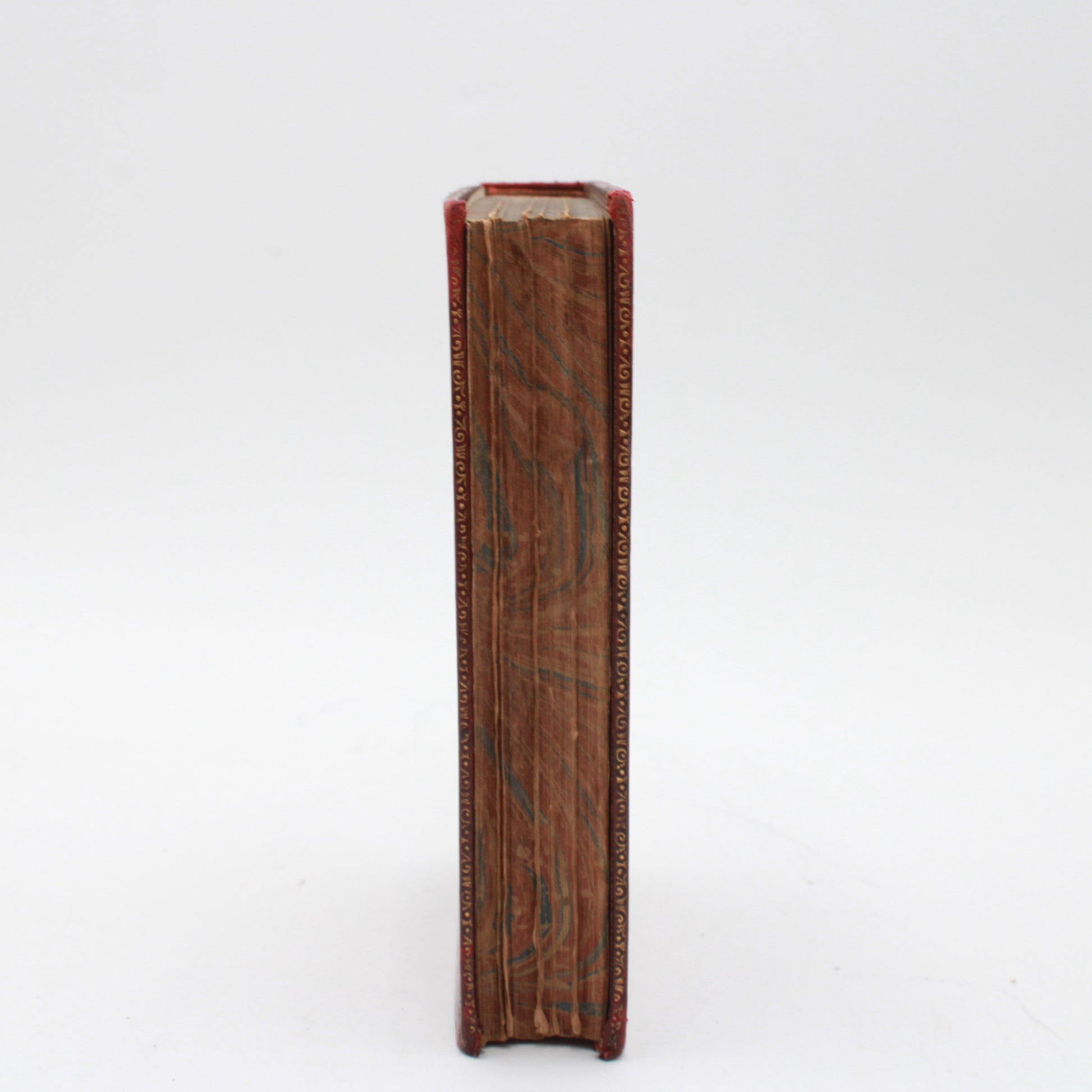 The volume is in generally good condition, the spine is showing major fading to the title plate and leather. The red leather boards showing some minor scuffs and slight darkening on the front, consistent with age and handling. The gilt crest and decorative borders remain bright, though there is some rubbing to the spine’s gilt compartments. Internally, scattered foxing is visible—particularly on the preliminary pages—but the text is otherwise clean and clearly legible. The hinges and binding are solid, indicating that the book has been well preserved, and the marbled endpapers retain their vibrant colors, lending an appealing visual touch to this historical prize volume.