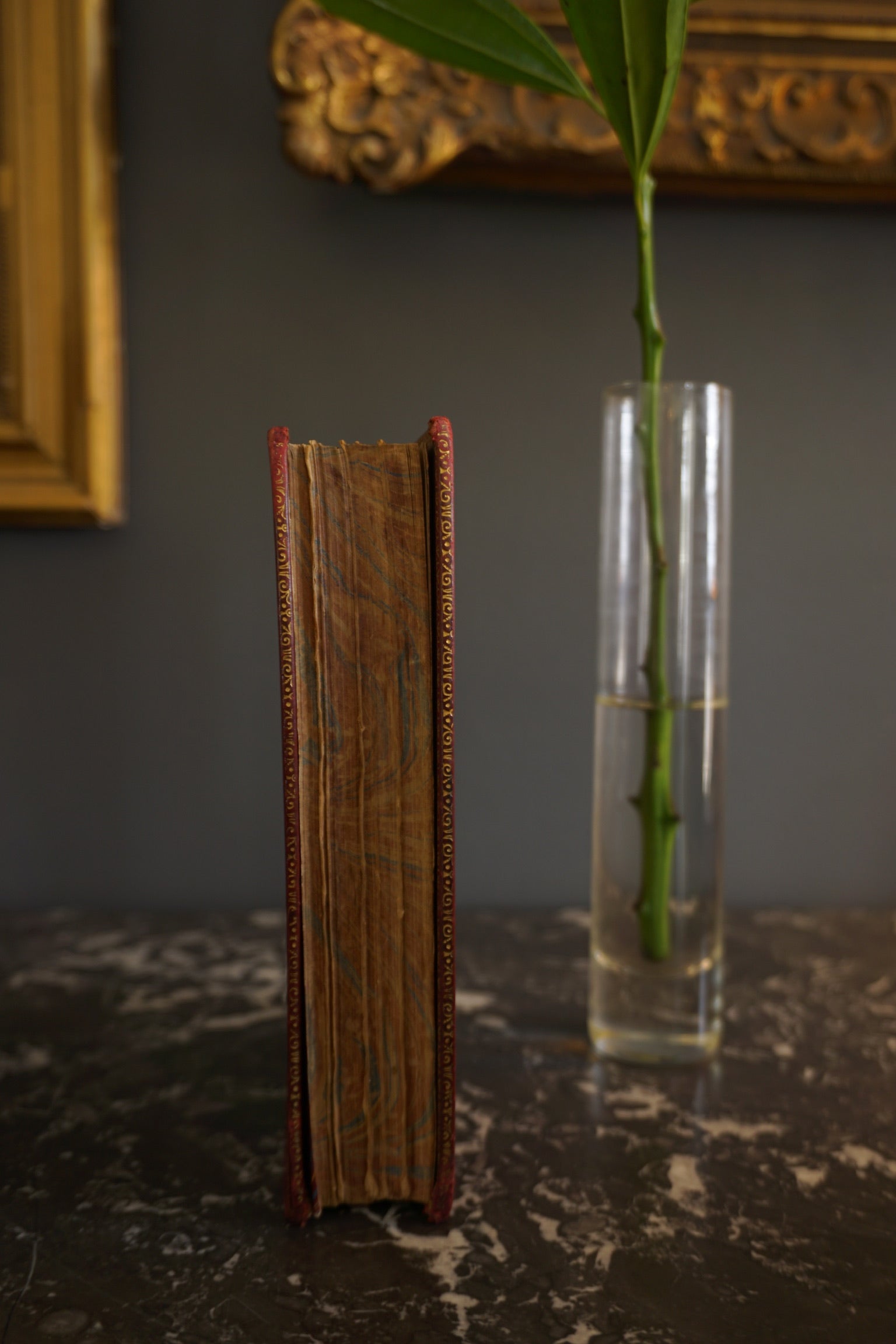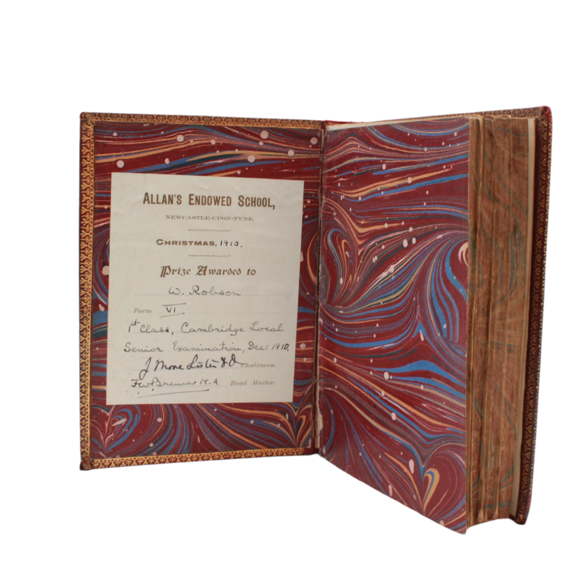 This particular copy features a red full-leather prize binding, stamped on the front with the crest of Allan’s Endowed School in Newcastle-upon-Tyne. Inside, a presentation label indicates it was awarded to a student in December 1910—highlighting the tradition of schools recognizing academic achievement with handsomely bound volumes of significant historical or literary works. The binding is decorated with gilt tooling around the edges of the boards and along the spine, which is divided into compartments with elaborate gilt floral motifs. Marbled endpapers add further elegance, reflecting a common practice in early 20th-century prize bindings to combine durability with aesthetic appeal.