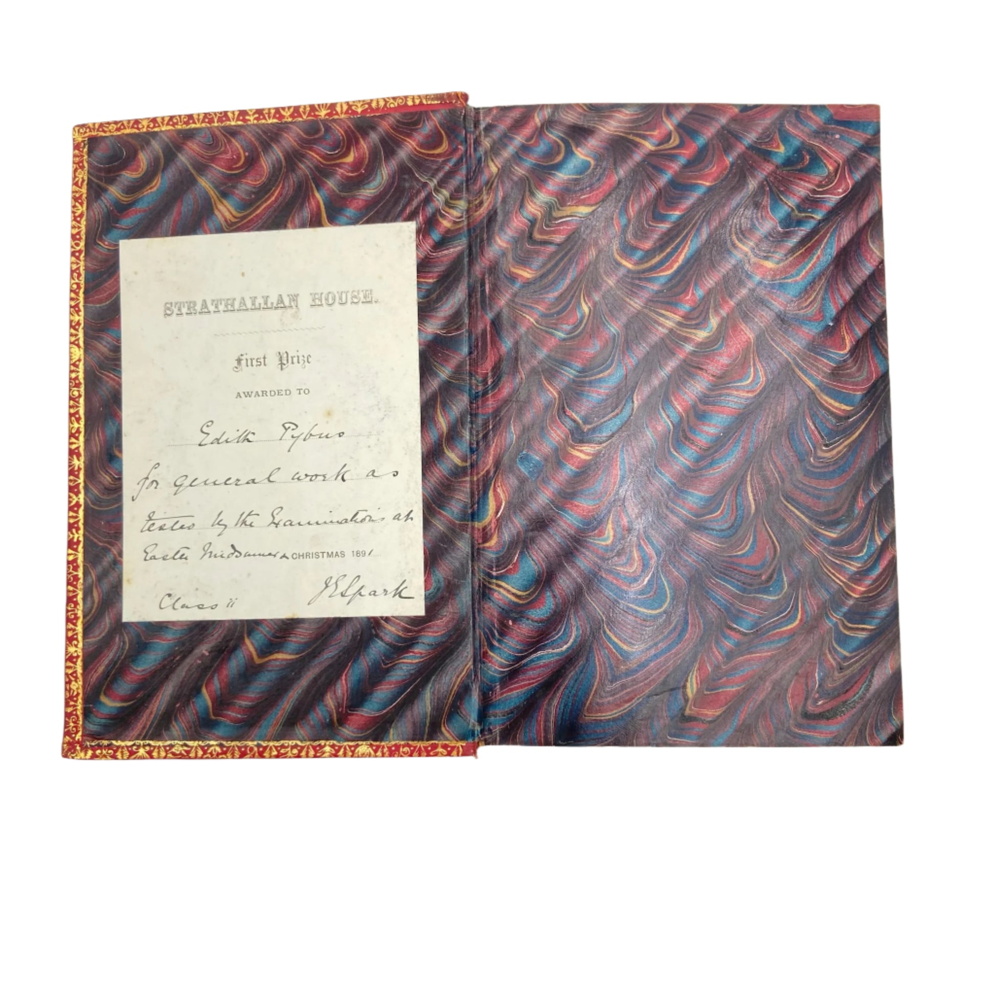 What sets this volume apart is its striking red full calf leather prize binding, featuring an elegant gilt-stamped emblem to the front board for South Kensington-Strathallan House, a well-known academic institution. The binding is richly tooled in gilt along the spine compartments and borders, with a black leather spine label and eye-catching marbled page edges that show beautifully when fanned. The raised bands and intricate gilt designs speak to the high level of craftsmanship expected of a presentation prize book during the late Victorian period.