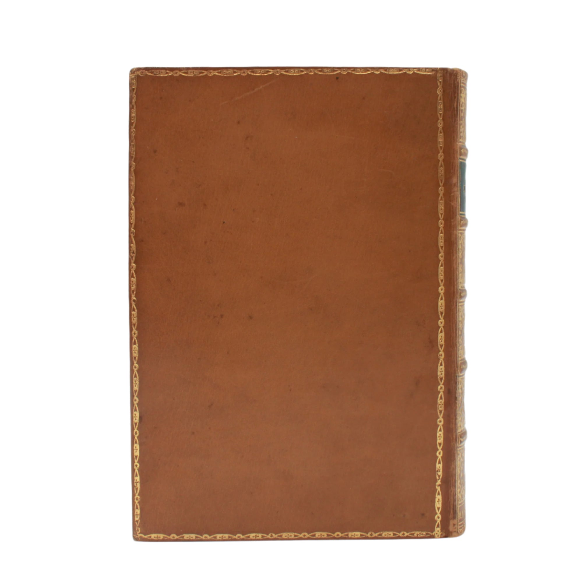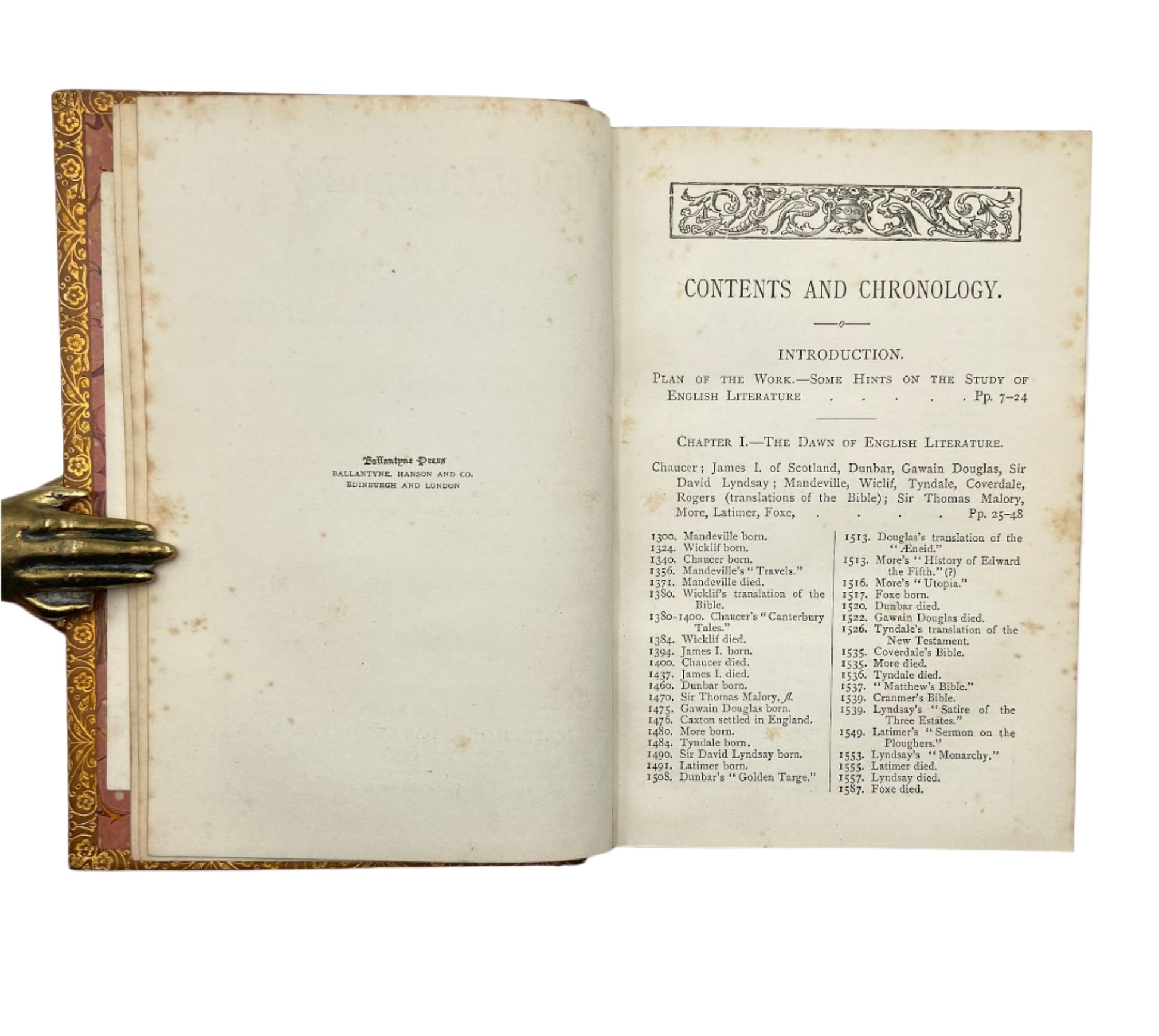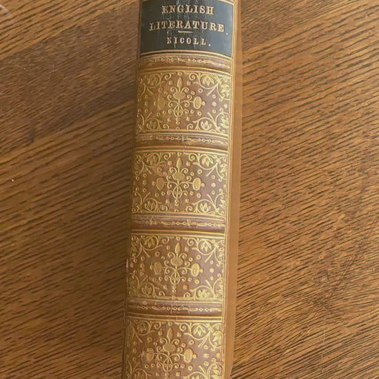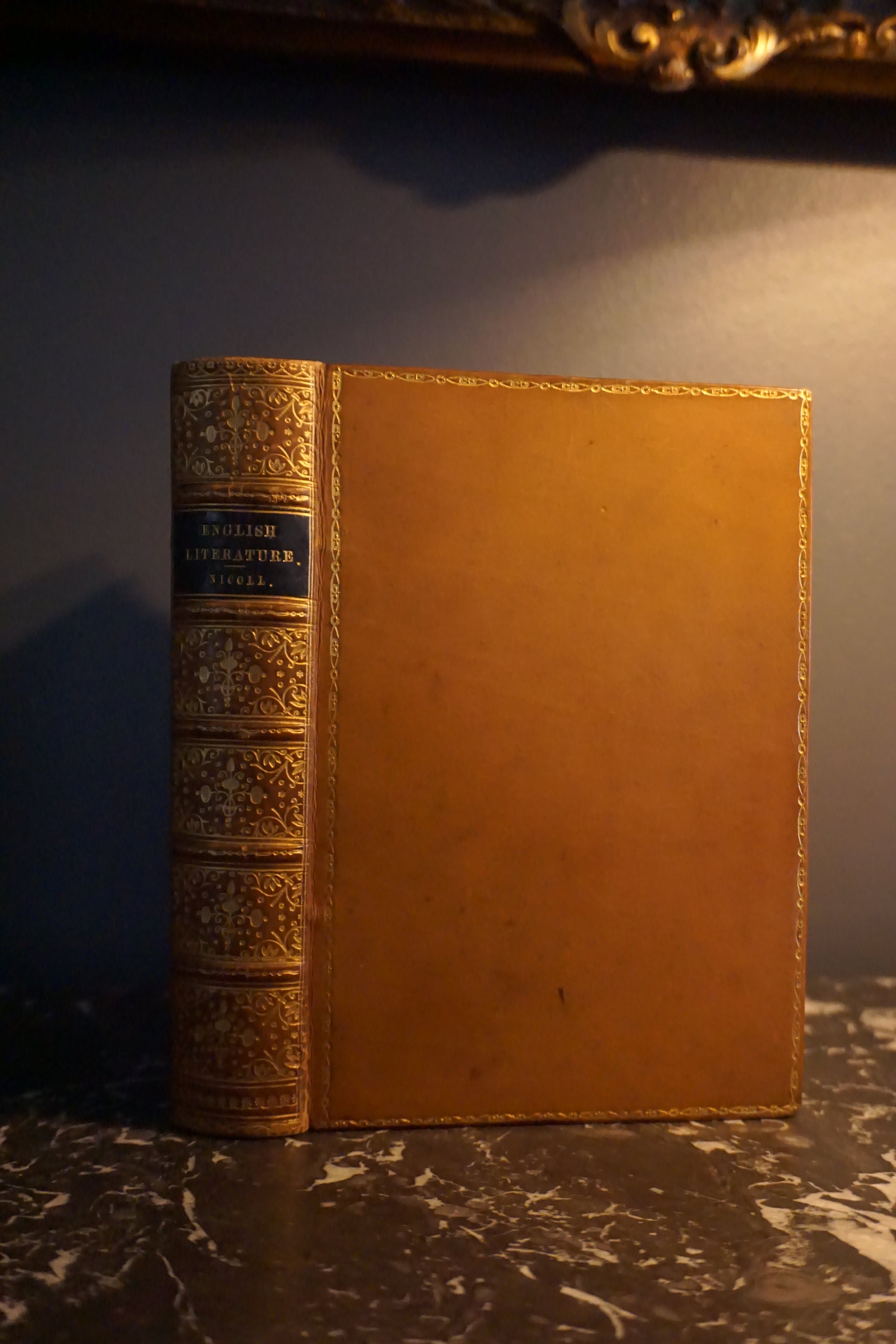 The volume is bound in full polished calf, featuring a simple yet elegant gilt border on the boards and elaborate gilt decoration in the spine compartments. A black leather title label reads “English Literature—Nicoll,” adding a refined contrast against the warm tan of the calf. Such prize or presentation bindings were common in the late 19th century, often used by schools or institutions to honor achievement. Inside, Nicoll organizes the text chronologically, highlighting key literary periods (e.g., Chaucer’s medieval verse, Elizabethan drama, the rise of the novel, and so forth) and focusing on prominent authors who shaped the evolution of English letters.