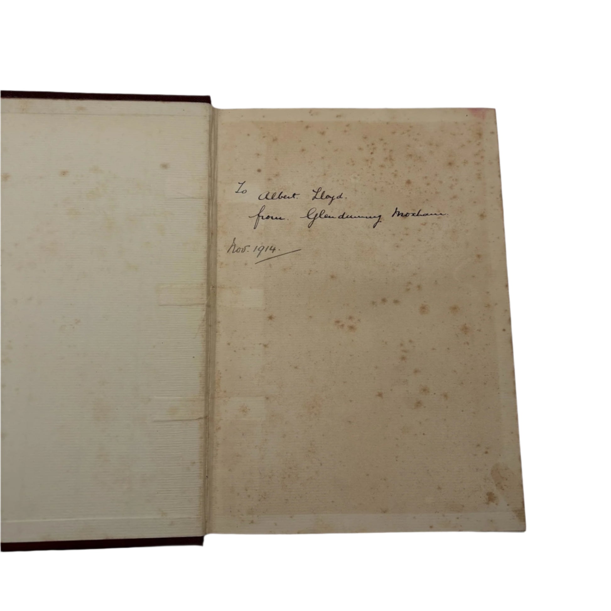 The book is well preserved for its age, bound in maroon cloth with gilt lettering that remains bright and legible. The spine shows gentle sunning and light rubbing at the edges, but the boards are firm and corners remain sharp. The hinges are strong and the text block is tight with no loose pages. The endpapers and early leaves show moderate foxing, particularly around the personal inscription, while the interior text and plates are clean with only even age toning.