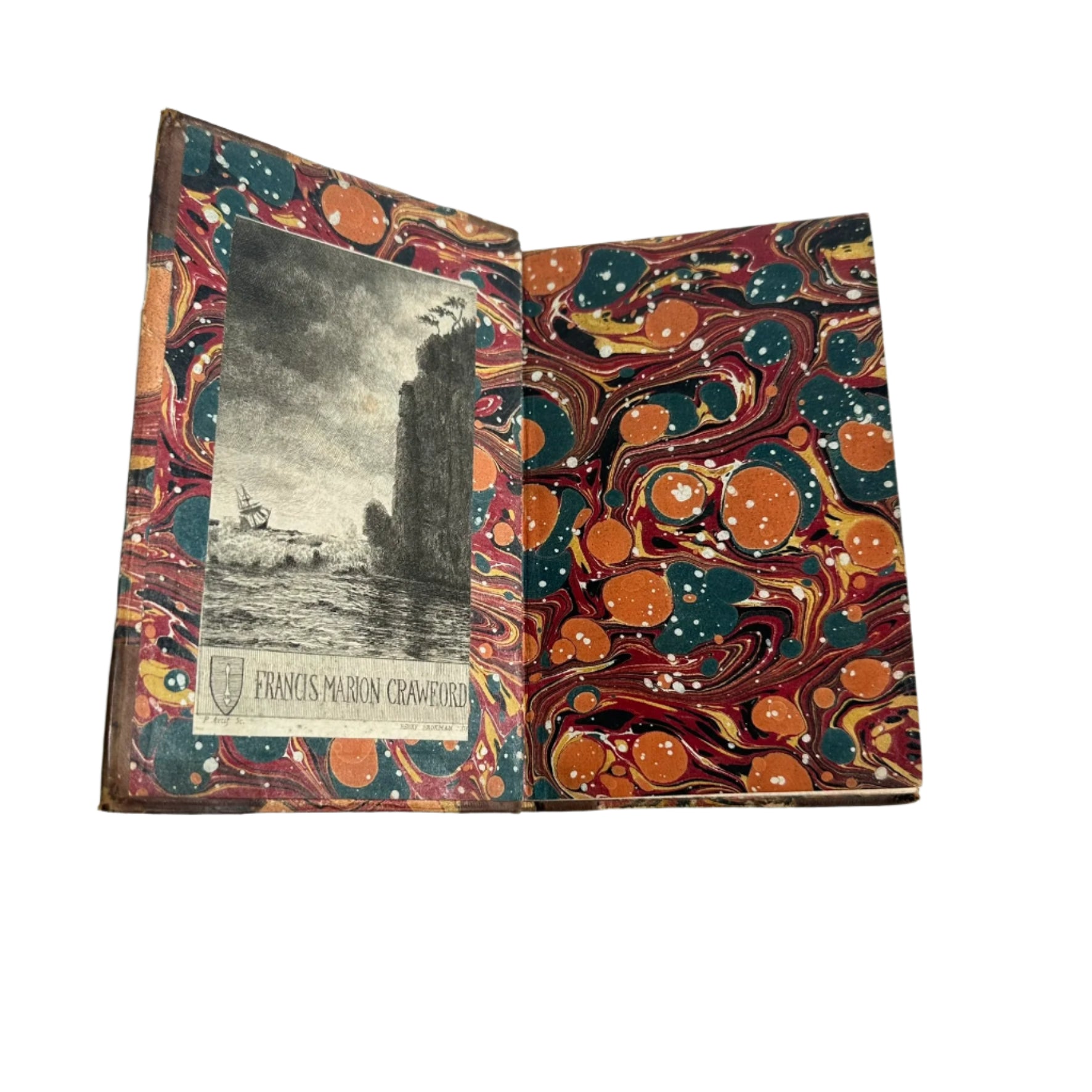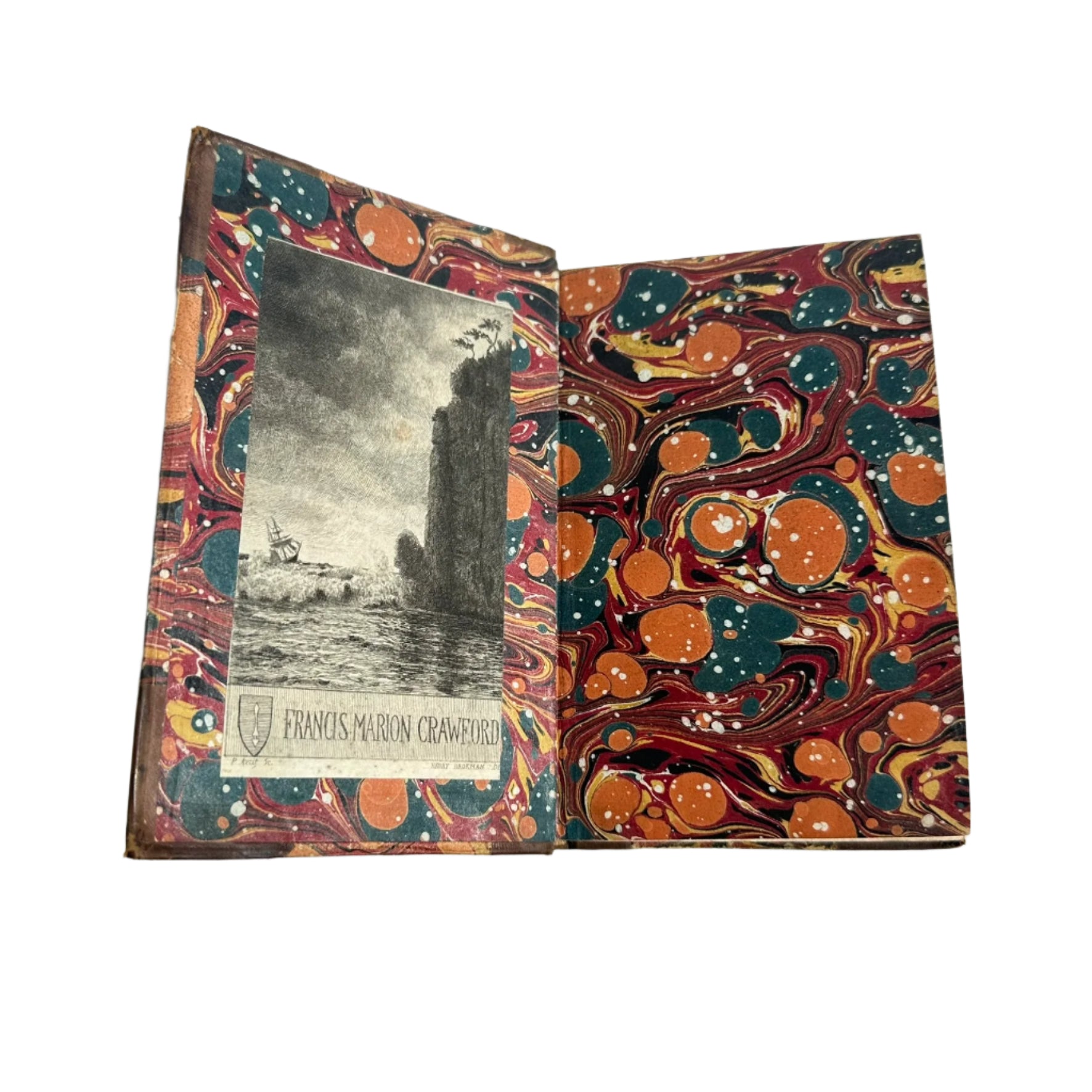 The book is elegantly bound with a richly gilt-decorated spine featuring five raised bands and a red leather title label, typical of high-quality bindings from the period. The marbled paper boards, paired with a quarter leather binding, add to its visual appeal, and the matching marbled fore-edges and endpapers show an attention to craftsmanship. A standout detail is the bookplate of Francis Marion Crawford, a well-known 19th-century American novelist, suggesting a notable provenance.