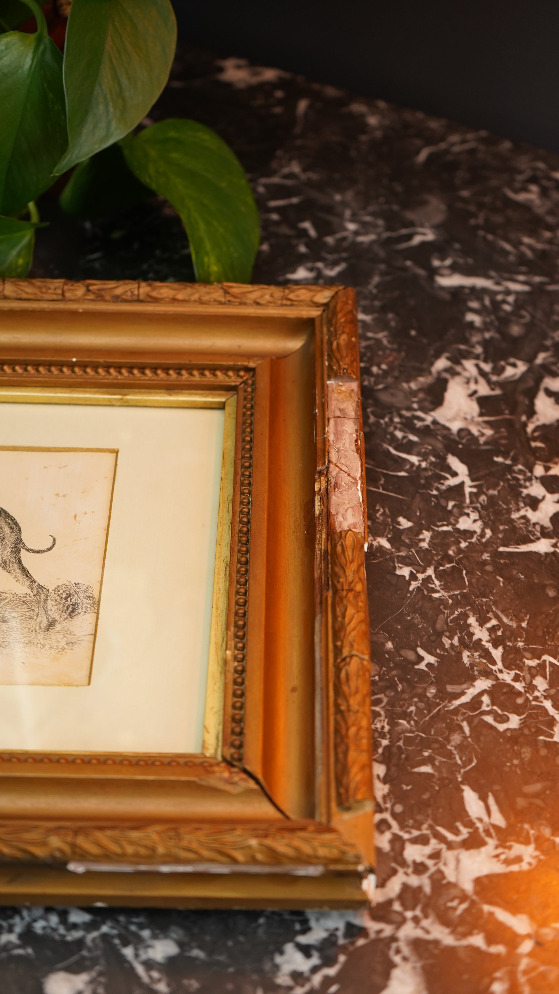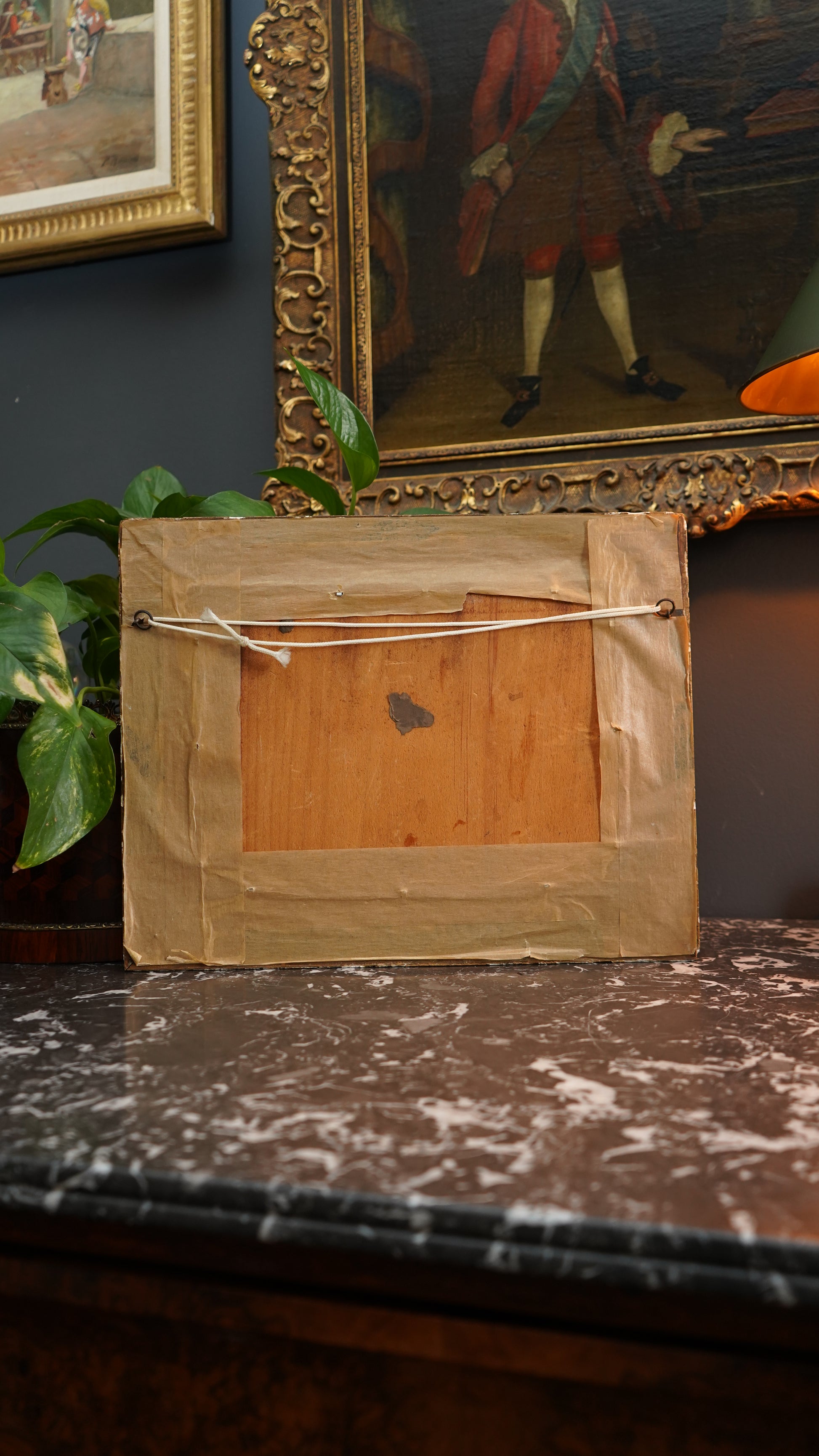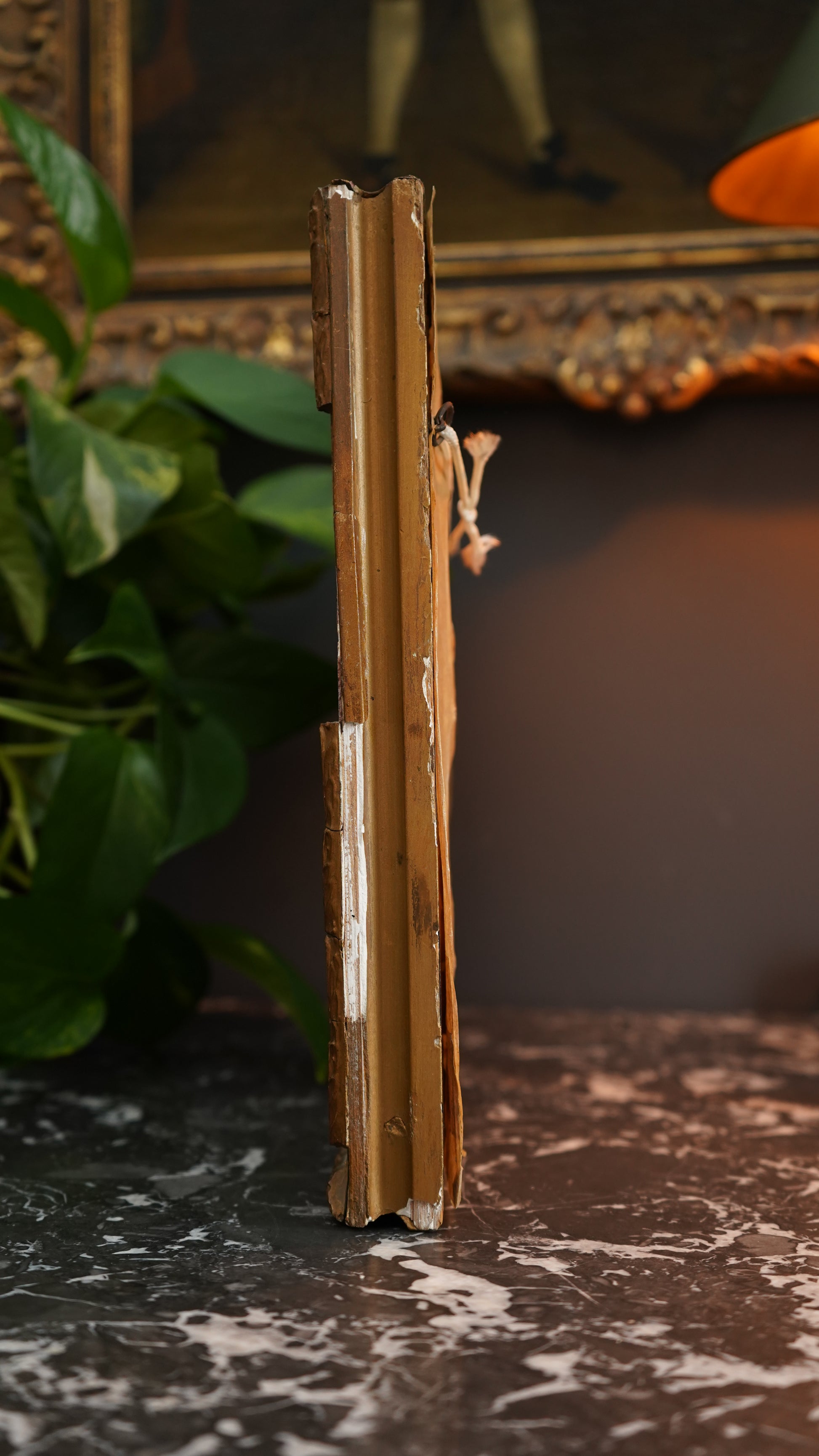 This particular example retains its rich, aged tonality with light foxing and mild paper wear consistent with age. The antique giltwood frame—likely a later 19th-century addition—features decorative beading and laurel-leaf motifs, showing age cracks and chipping along the edges that add to its period authenticity.