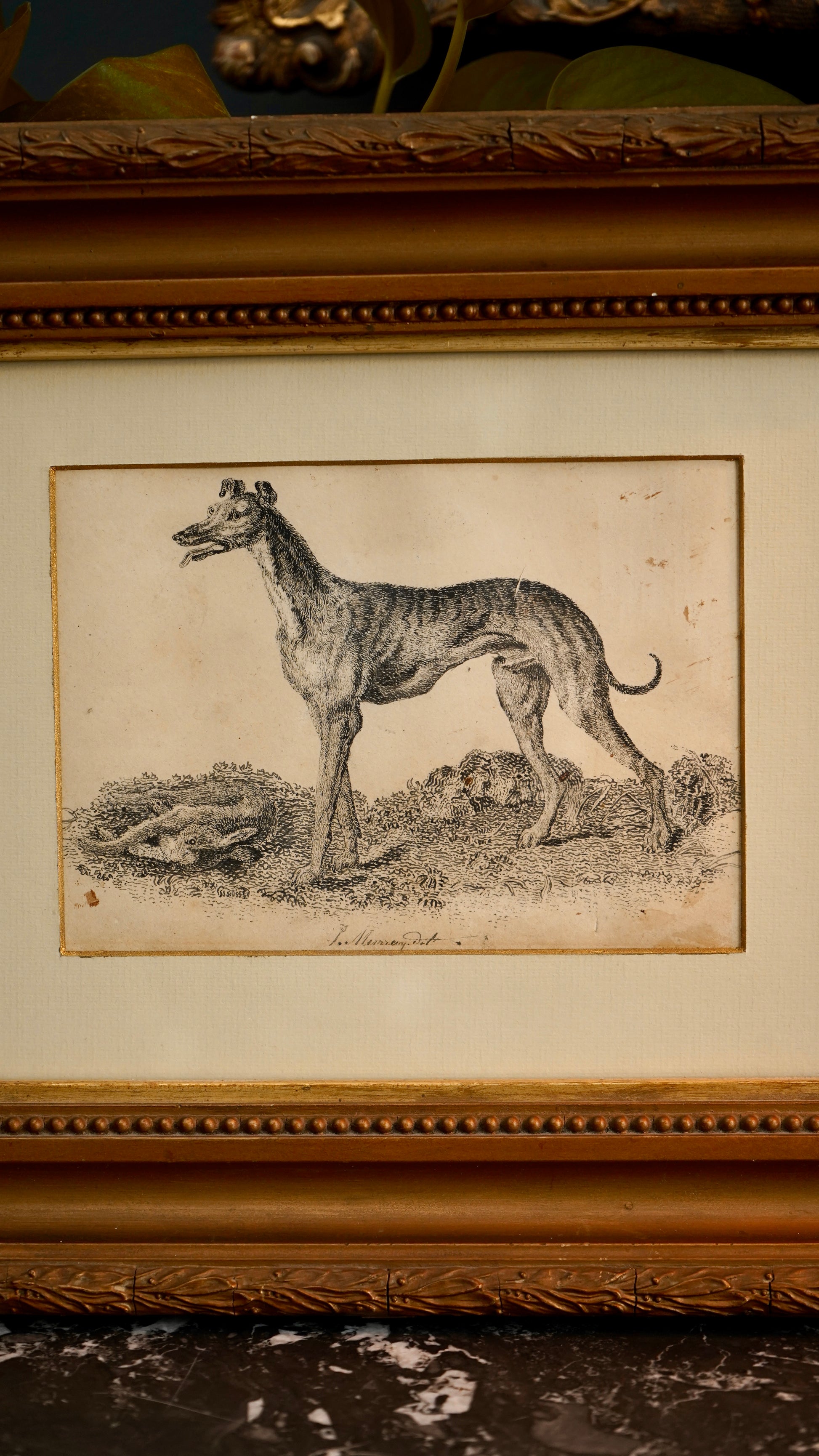 An 18th-century British sporting etching depicting a sleek greyhound standing proudly over its quarry, executed after the artist P. Murray (“P. Murray, delt.” inscribed lower left). This type of imagery was highly popular in late Georgian England, when the pursuit of coursing and the depiction of hunting dogs represented both status and skill.