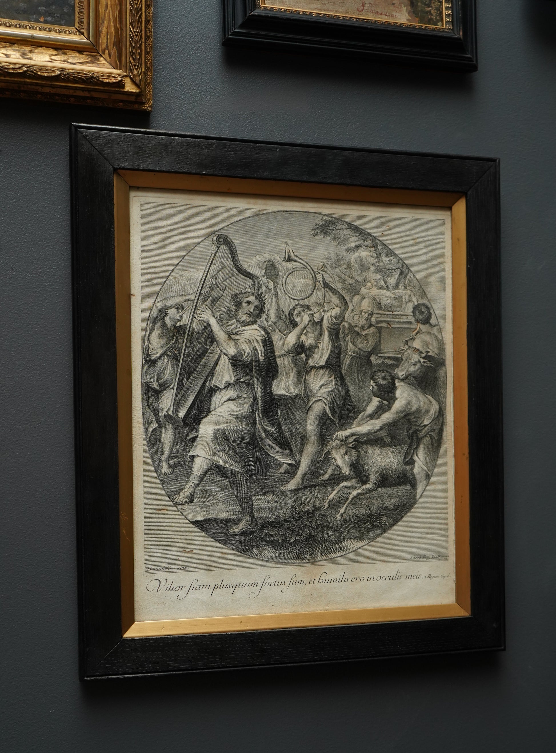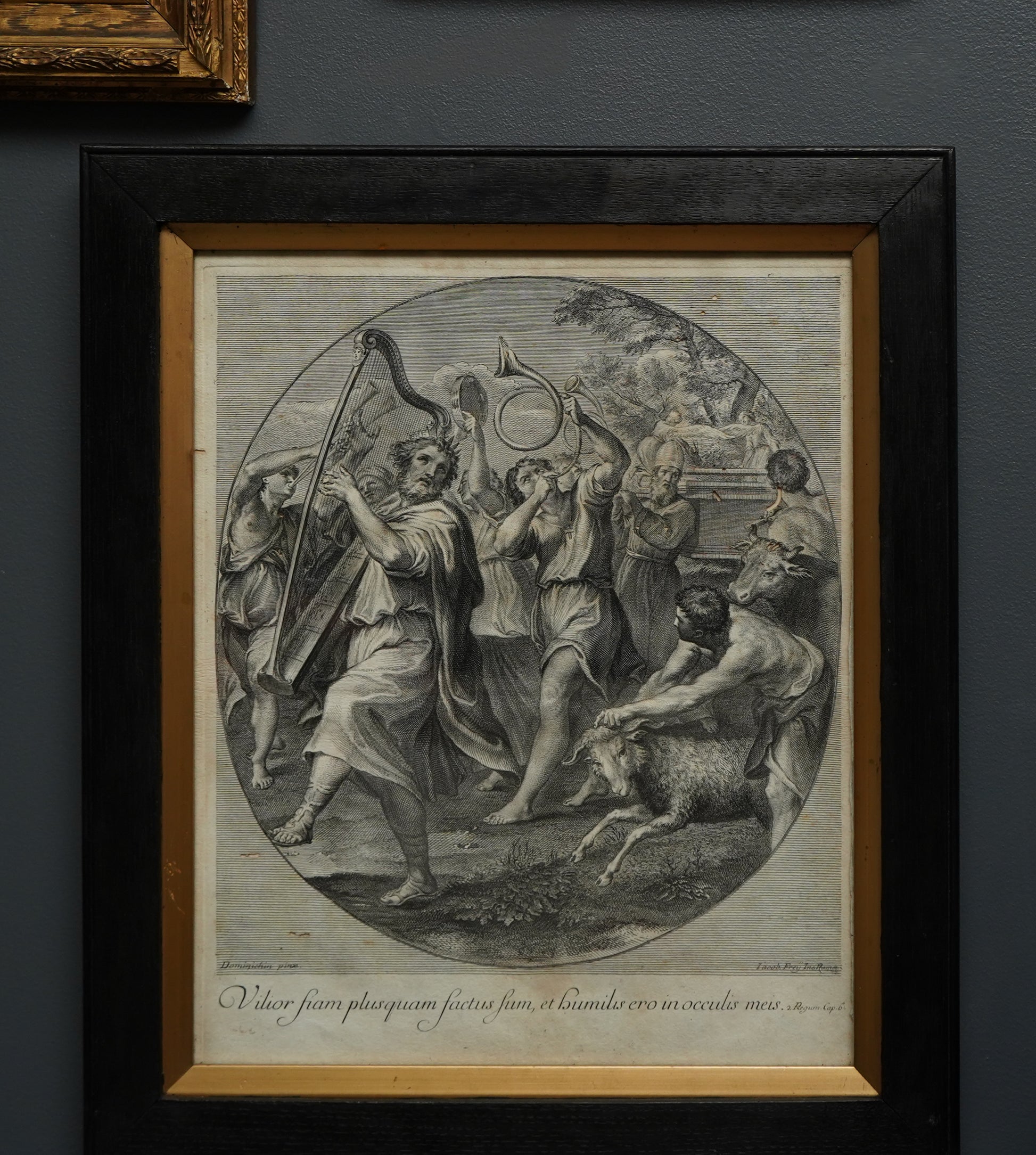 The scene depicts David’s victorious entry into Jerusalem after the defeat of Goliath. David plays the harp while surrounded by musicians and attendants, as a sacrificial lamb is prepared in the foreground, a rich composition that combines triumph with religious devotion. Frey was celebrated for his ability to capture the spirit of the painters he engraved, and this piece demonstrates his mastery of light, shadow, and dramatic movement.