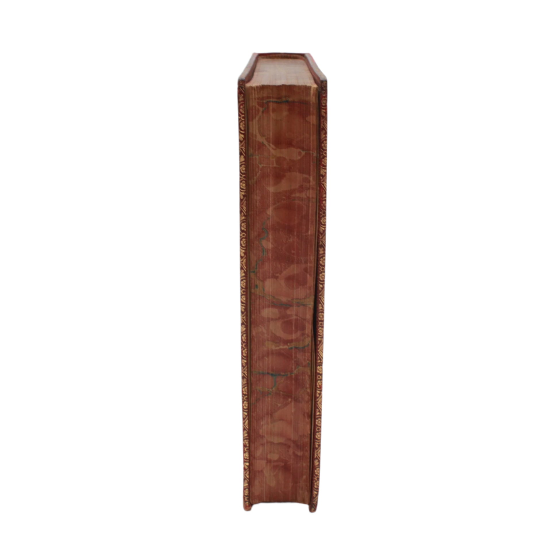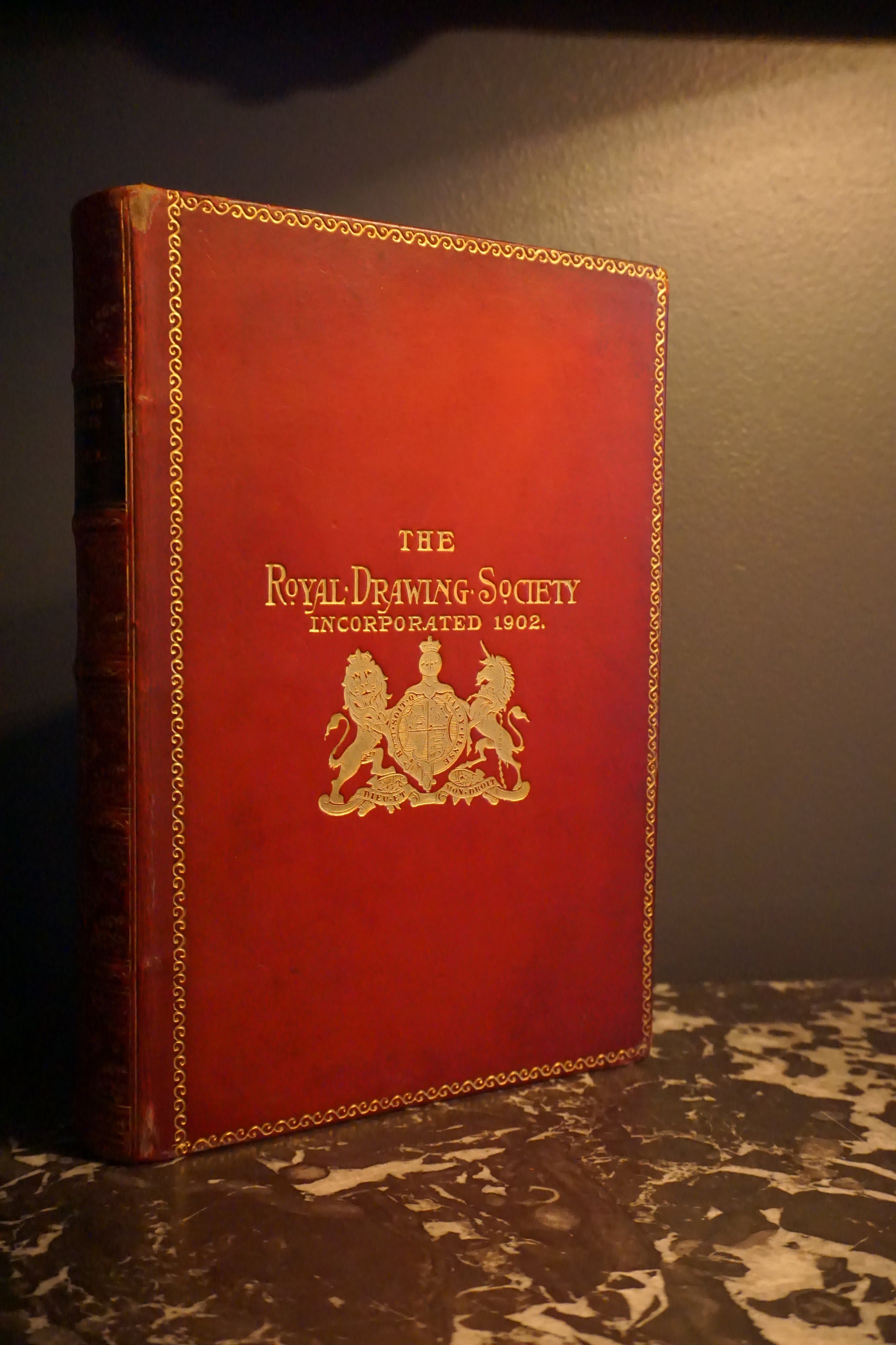 One of the most striking features of this copy is its red leather binding, which displays the gilt-stamped crest of “The Royal Drawing Society Incorporated 1902” on the front board. The spine is divided into compartments by raised or faux-raised bands, each compartment adorned with ornate gilt floral tooling. A black leather label with the title, “Highways & Byways in Sussex,” stands out amid the decorative gilt. This style of binding—often commissioned as a prize or presentation volume—reflects both the esteem in which the text was held and the tradition of awarding handsomely bound books in educational or artistic institutions. The combination of finely wrought leather and gold embossing underscores the volume’s status as an object of lasting value.