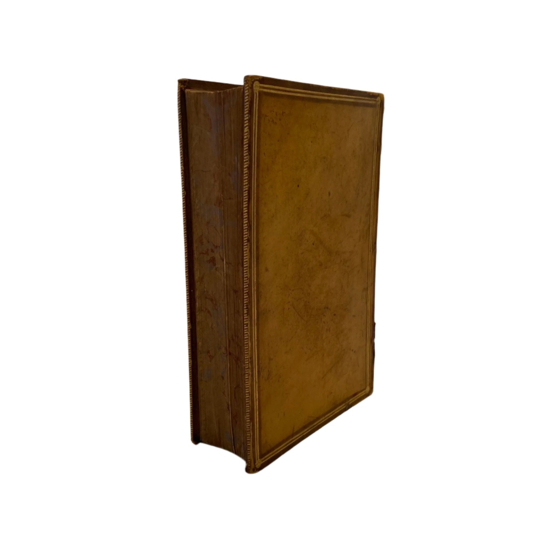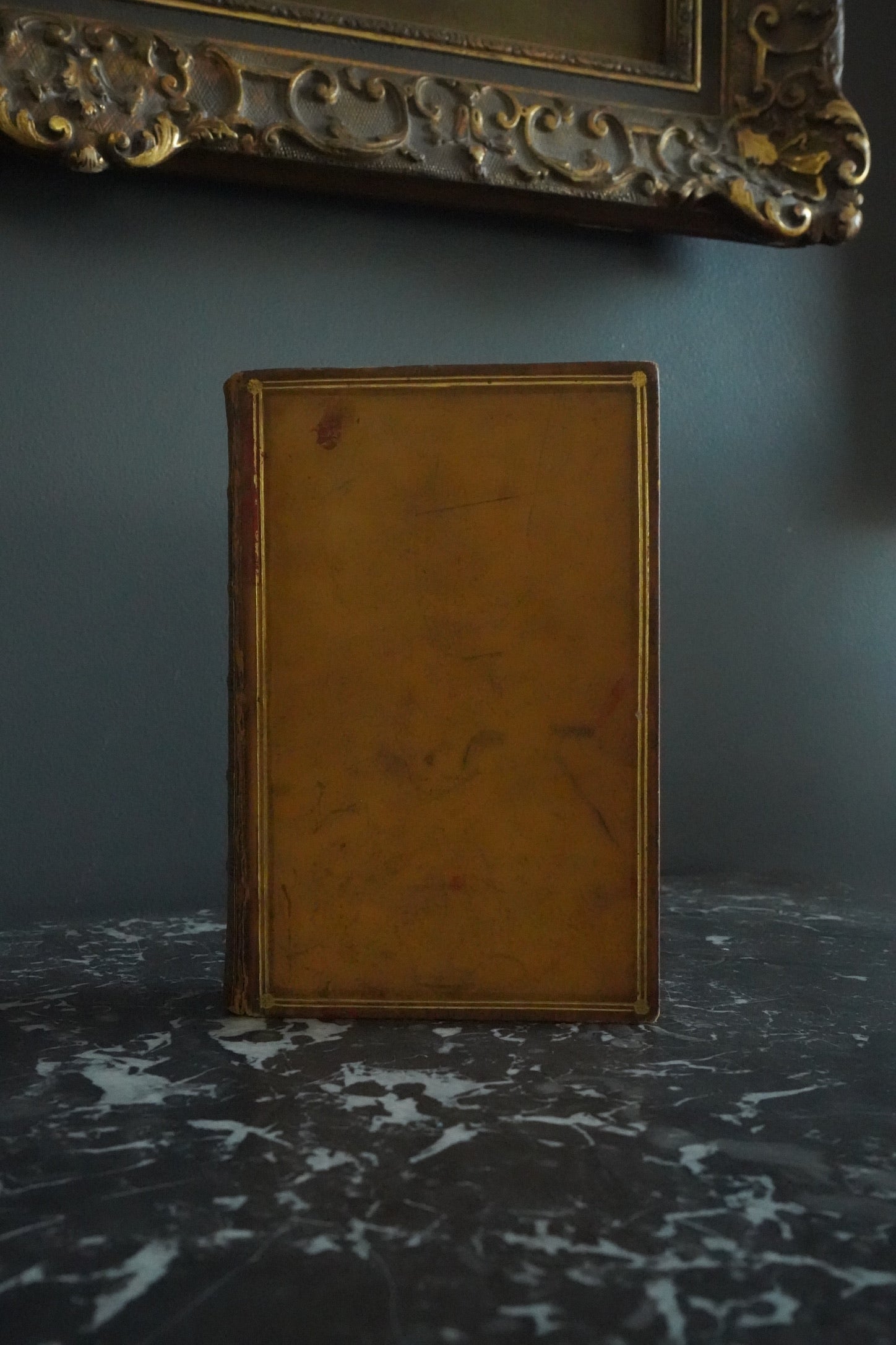 Condition-wise, the book is structurally intact but shows visible signs of age. The front hinge is cracked and partially split, though the board remains securely attached. The leather boards exhibit scratches, scuffs, and patches of discoloration, particularly on the front cover. Gilt detailing on the spine remains bright and attractive. The page edges retain their original marbled finish, and the interior pages are clean and legible with gentle age toning. Overall, it’s a handsome and richly detailed Victorian binding with a storied past—ideal for collectors of literary history or decorative antique books.