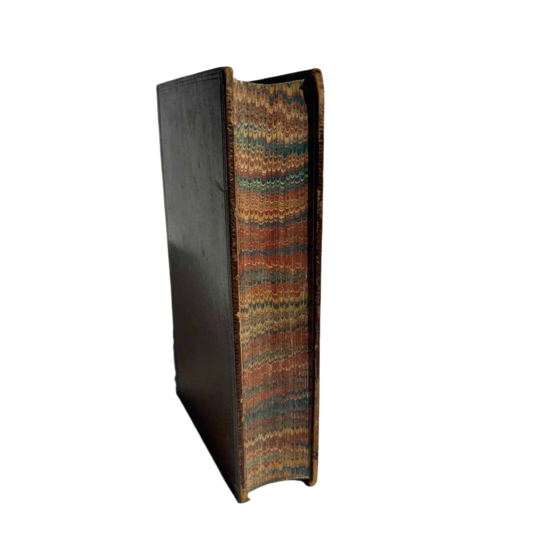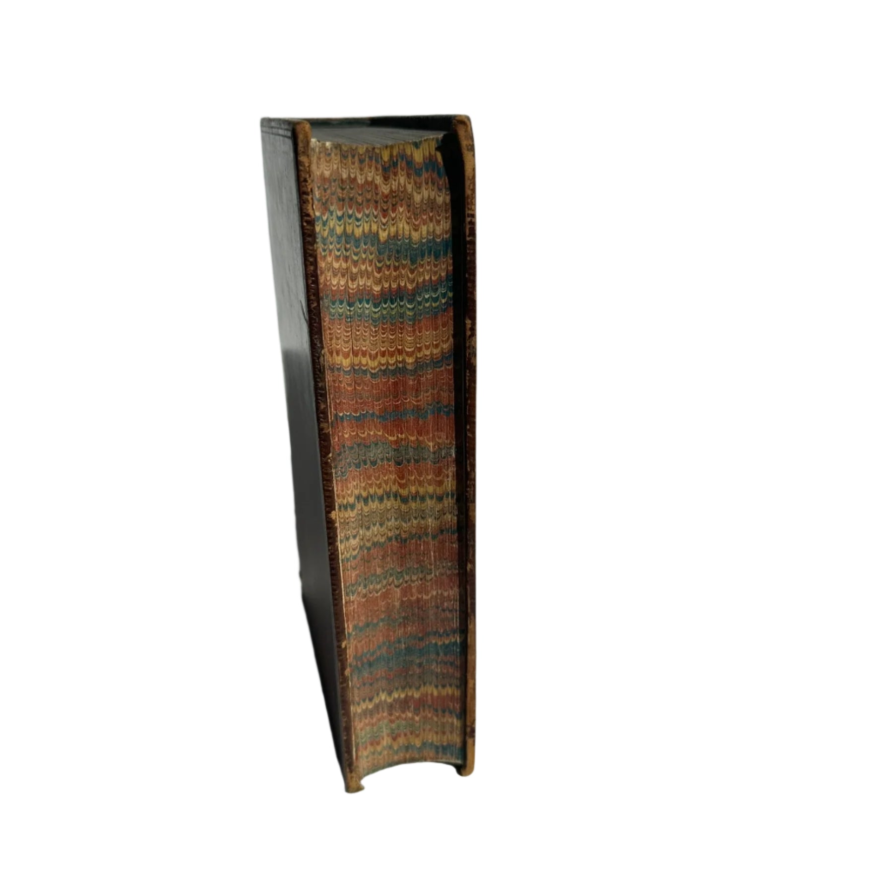 The book itself is finely bound in full polished calf leather, with a richly tooled spine decorated in gilt and accented by a red morocco title label. Five raised bands and intricate floral tooling speak to its craftsmanship, while the marbled page edges and sewn endpapers suggest it was produced for a refined readership or institutional use.