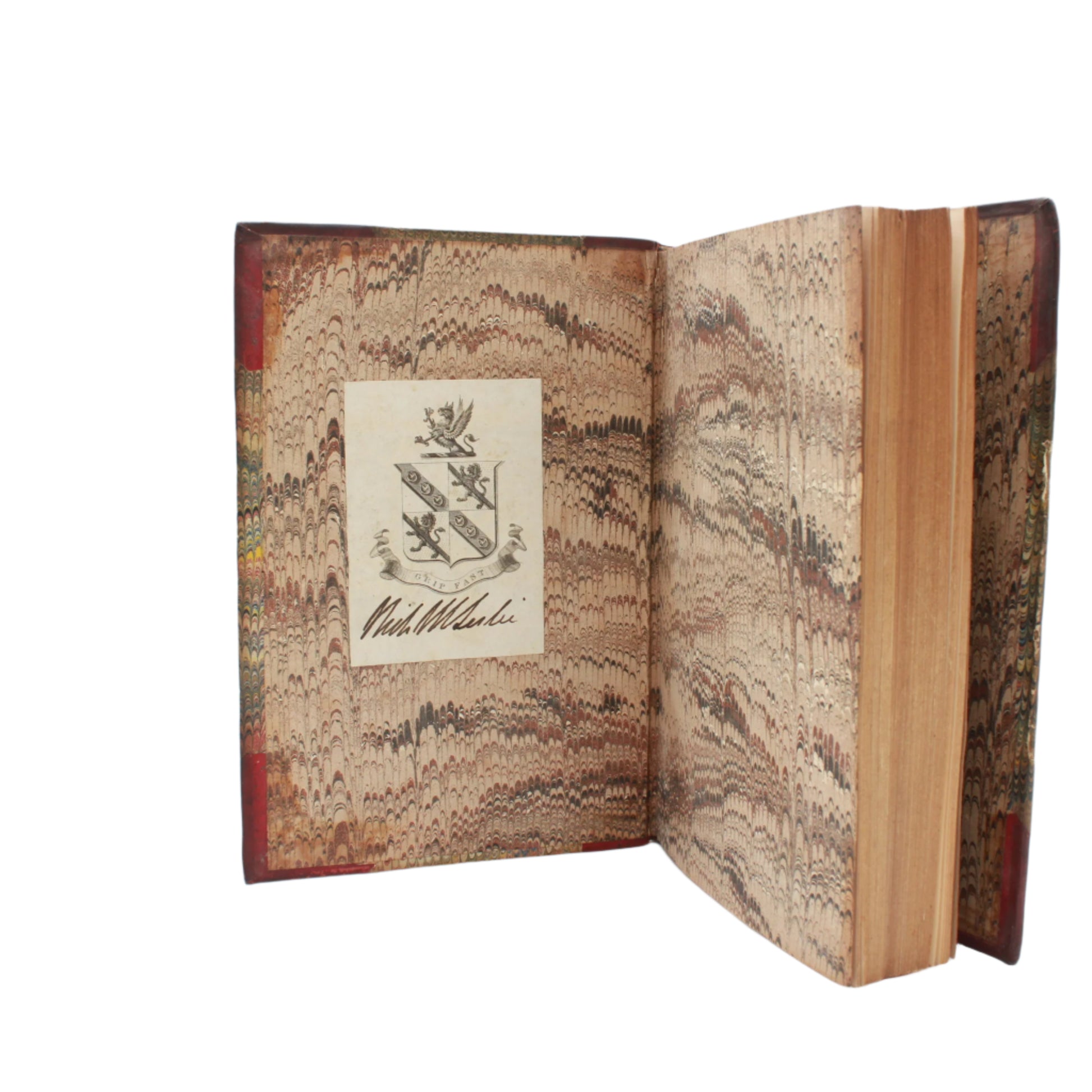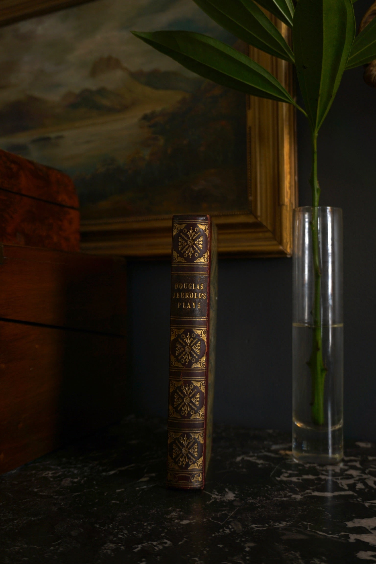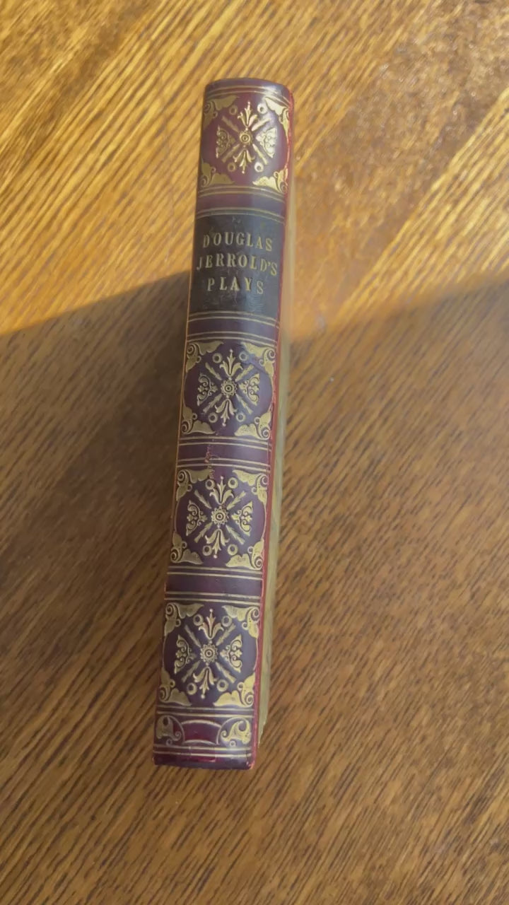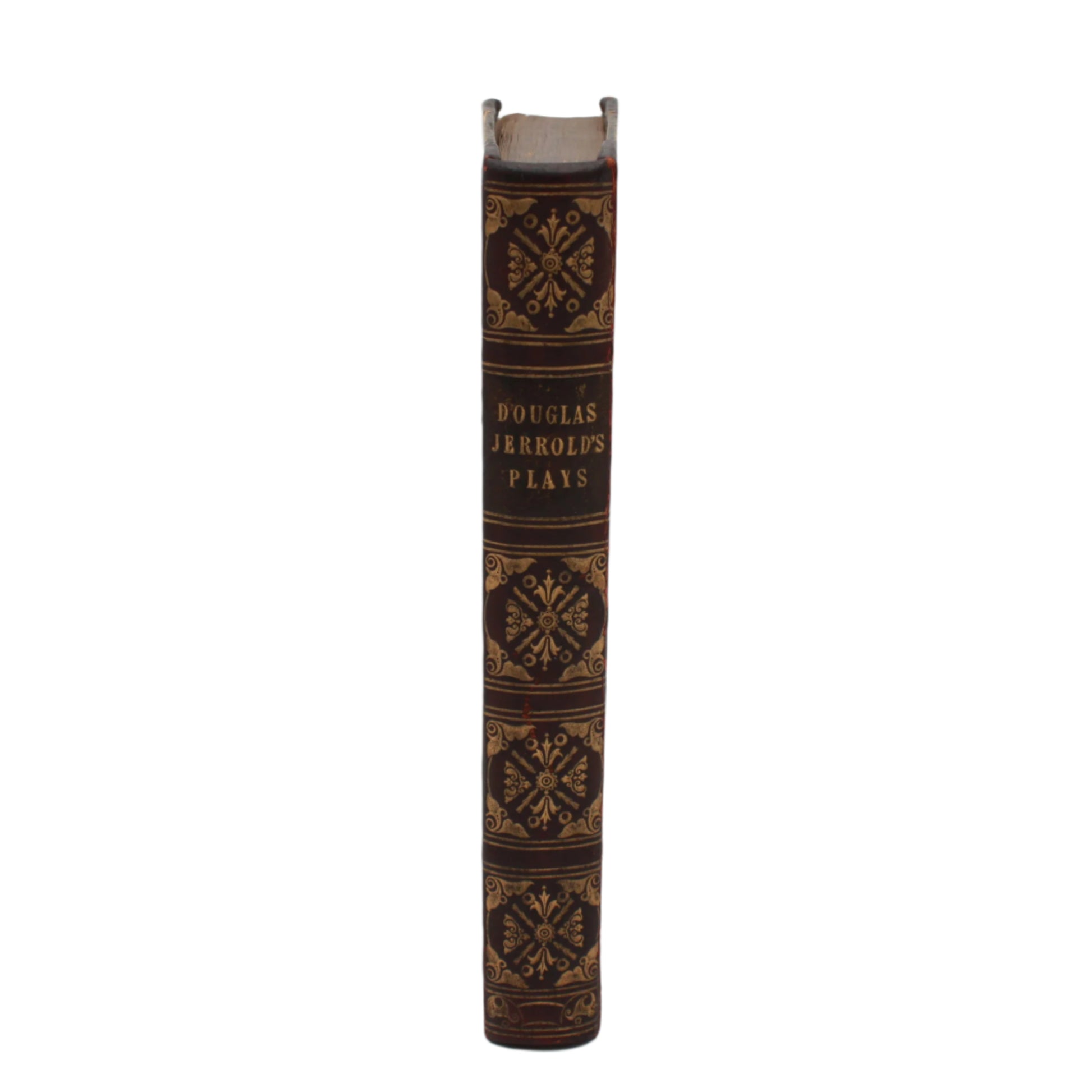 This collection of Douglas Jerrold’s plays, which includes The Catspaw: A Comedy in Five Acts, was published 1809. Douglas William Jerrold (1803–1857) was an English dramatist and journalist known for his sharp wit and satirical commentary on Victorian society. The Catspaw was performed at the Theatre Royal, Haymarket, and its text reflects Jerrold’s knack for blending humor with social critique. He wrote at a time when the British stage was transitioning from the more melodramatic and romantic styles of the early 19th century to a form of comedy that engaged directly with social and political issues, echoing the rising influence of periodicals such as Punch. This volume, bound in red half-leather with marbled boards and endpapers, points to a 19th-century custom or small-run binding, likely undertaken to preserve Jerrold’s dramatic works in a more distinguished format than standard publisher’s cloth. The spine decoration, featuring ornate gilt compartments and the title “Douglas Jerrold’s Plays,” offers a refined touch typical of Victorian-era bindings commissioned by collectors or libraries.