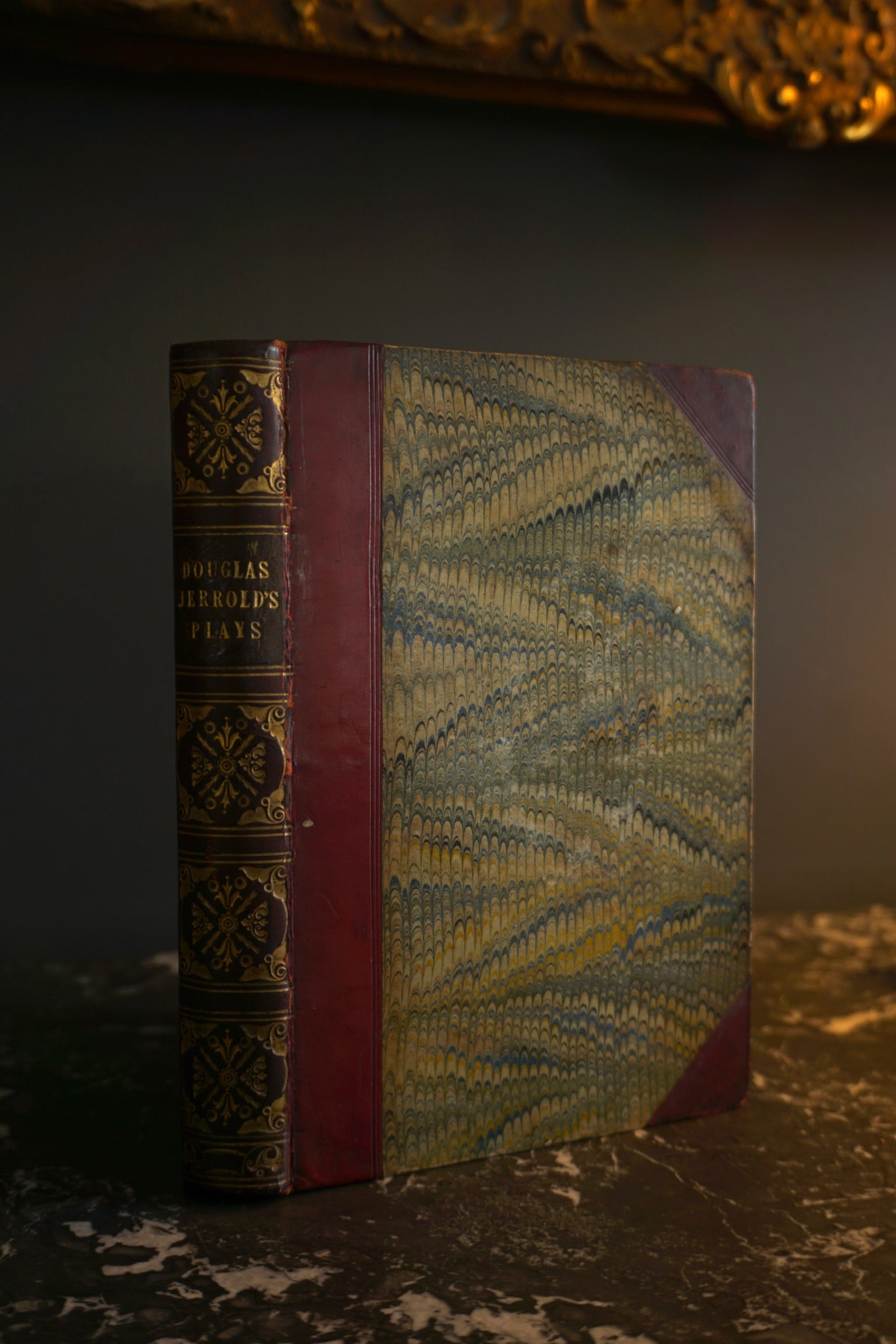 This copy is in good overall condition for its age, with the red leather spine showing minor rubbing along the raised bands and corners, yet retaining bright gilt tooling in the compartments. The marbled paper on the boards and endpapers displays the characteristic swirl patterns with only light wear, while a personal bookplate on the front pastedown adds a touch of provenance. Internally, the pages are mostly clean, showing the typical slight toning or occasional spotting that comes with 19th-century paper. The binding remains firm, suggesting that the volume has been well cared for and stands as both an attractive piece of Victorian bookbinding and a testament to Jerrold’s enduring place in the history of British drama.