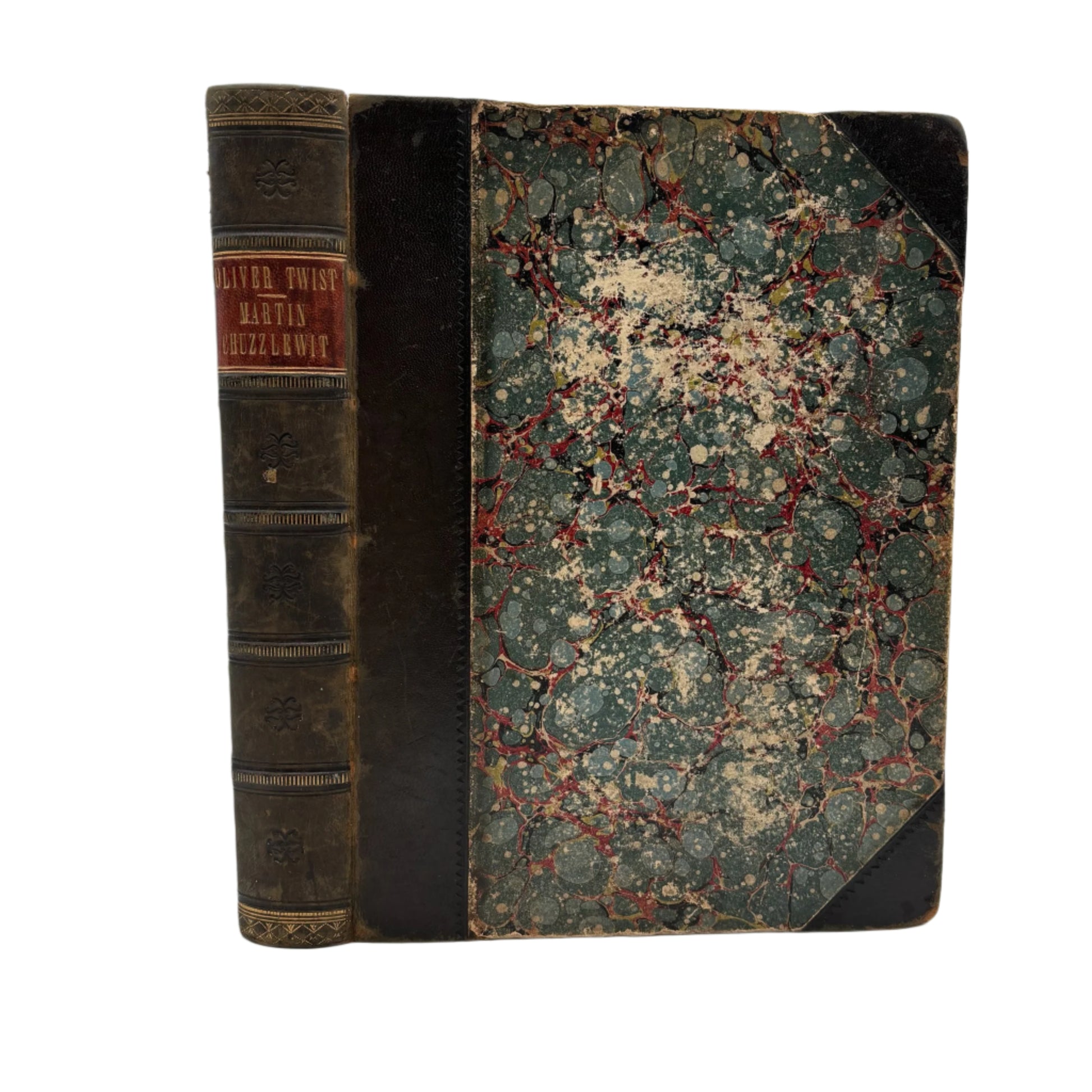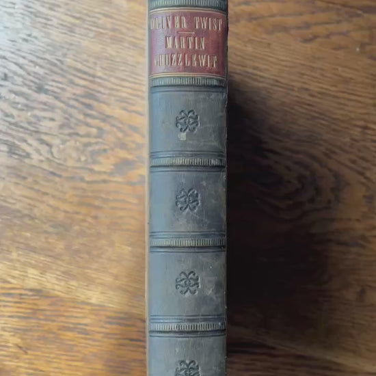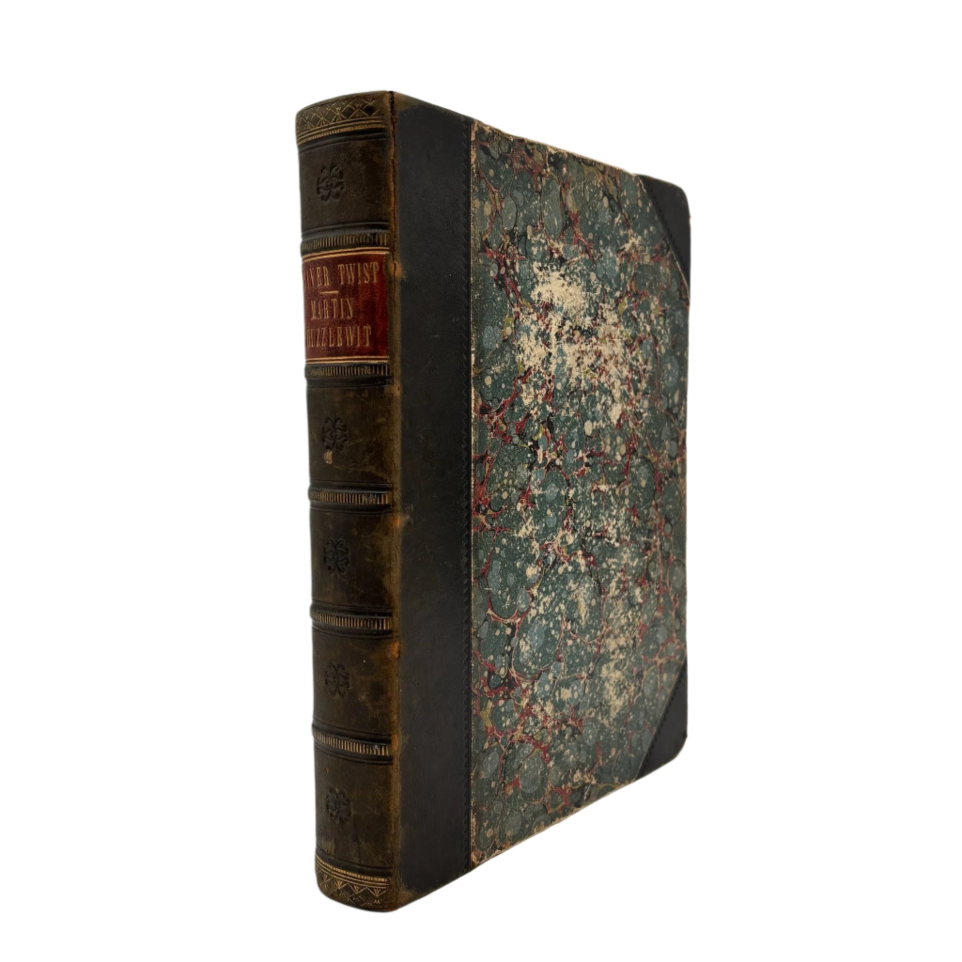 This antique Victorian edition brings together two of Charles Dickens’s most iconic novels, Oliver Twist and Martin Chuzzlewit, in a single beautifully aged volume. Published by Chapman and Hall in the late nineteenth century, this edition features twenty eight detailed illustrations by J. Mahoney that bring Dickens’s characters and dramatic scenes to life. The book is bound in an attractive half calf leather binding with marbled boards, raised bands, gilt accents, and a bold red title label on the spine. It was expertly bound by Maxwell and Miller of London, whose bindery stamp appears on the endpaper. Inside, readers will find the full text of both novels, including the unforgettable story of Oliver’s escape from the workhouse and Martin’s comic journey of self discovery across England and America. This volume is perfect for collectors who appreciate Victorian craftsmanship as well as those who love decorating with classic leather bound books. The combination of its illustrated pages, handsome nineteenth century binding, and the pairing of two beloved Dickens stories makes this a memorable display piece with lasting literary charm.Condition: