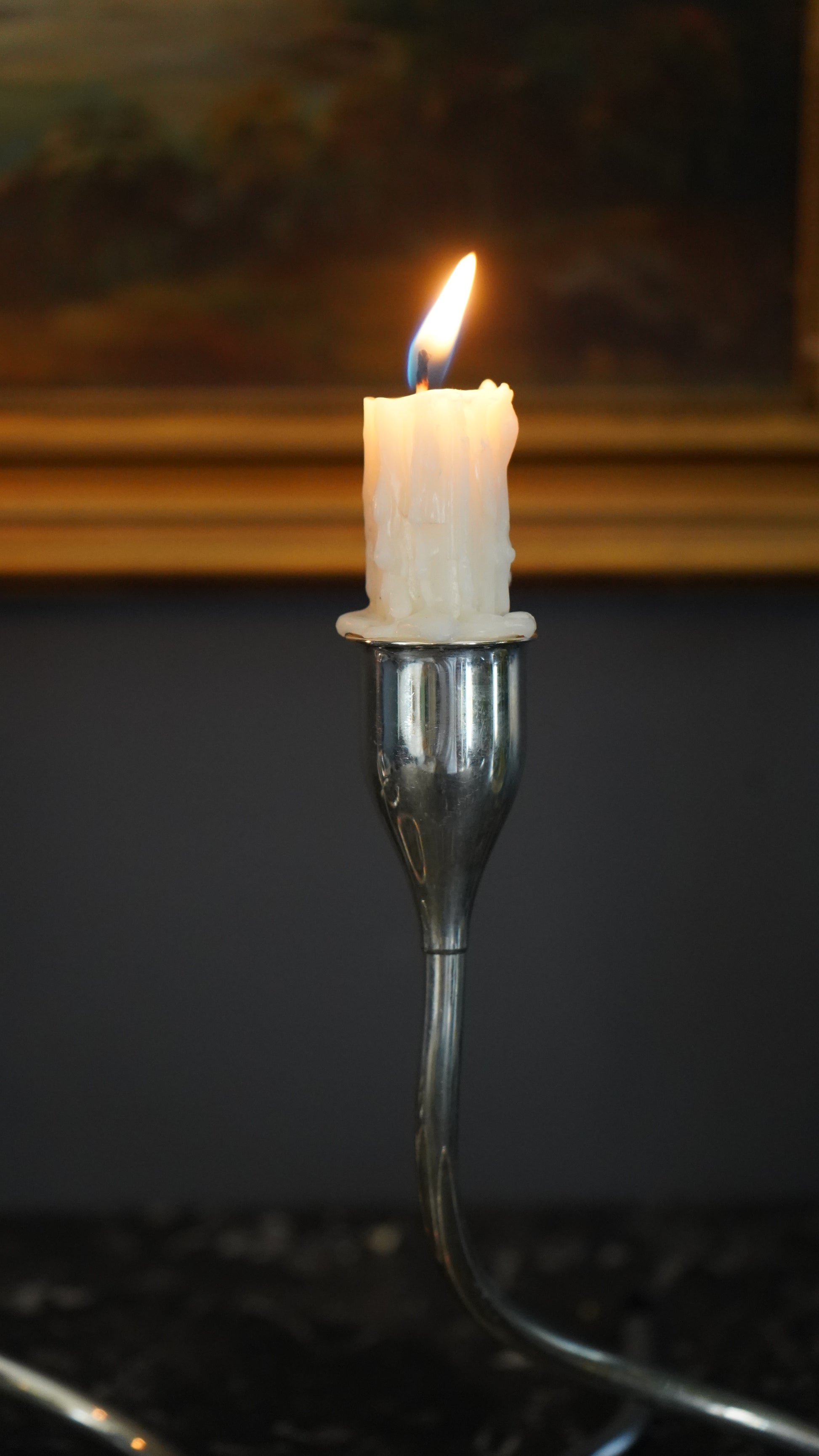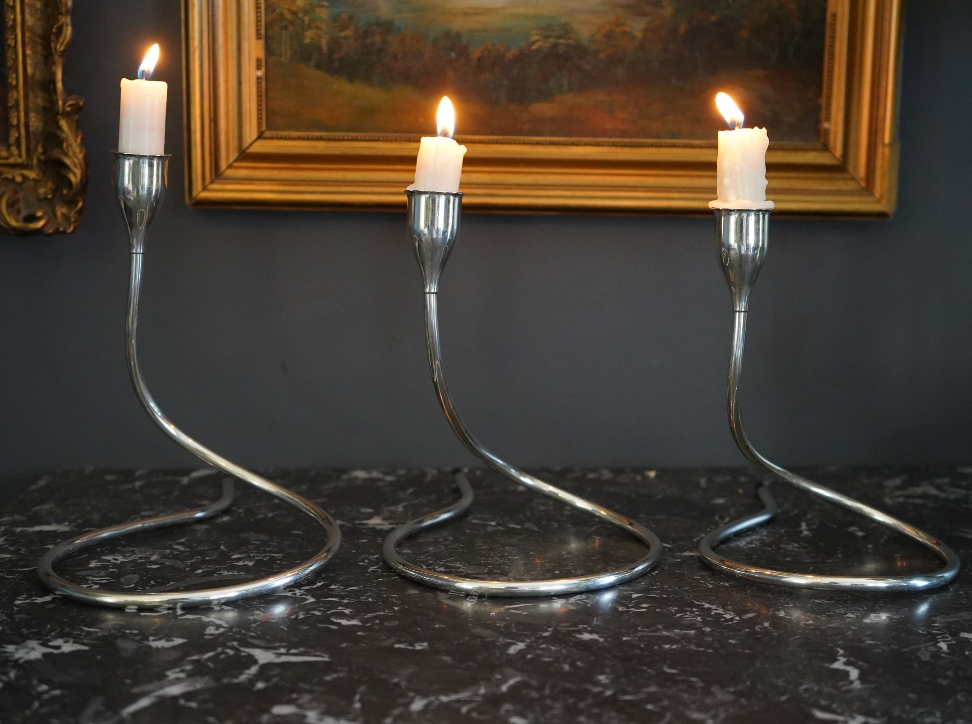 All three candleholders are in excellent vintage condition with rich, even patina throughout that highlights the fluid contours of the design. No breaks or repairs noted. Minor surface wear consistent with age and gentle use. One or more retain remnants of old wax in the holders, adding to their authentic character.