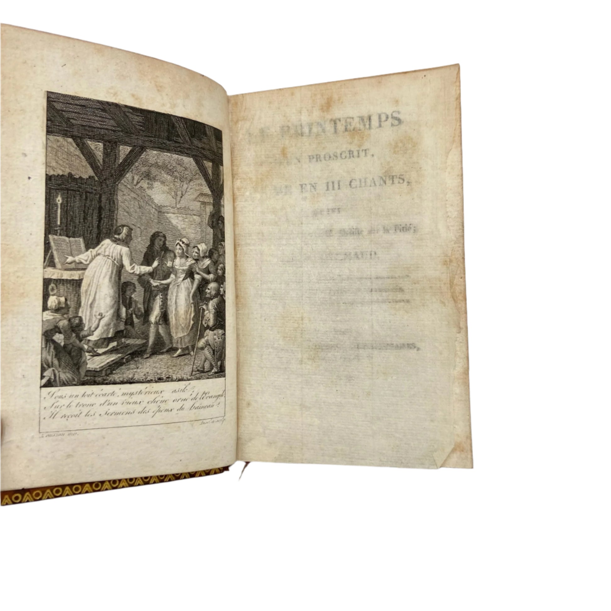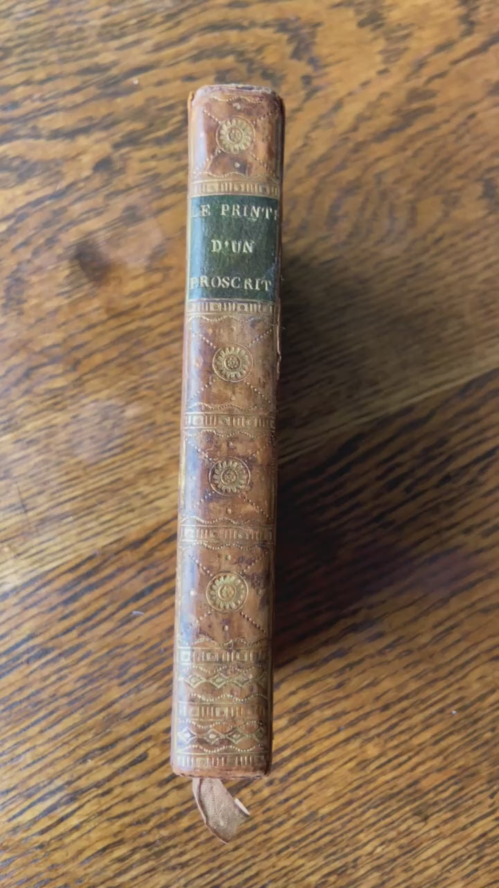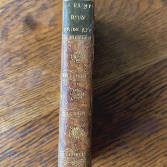 This antique 1803 French poetry book, Le Printemps d’un Proscrit by Joseph Michaud, is a powerful literary reflection on exile, compassion, and redemption written in the aftermath of the French Revolution. Bound in richly mottled calf leather with elegant gilt tooling and a dark green spine label, this early 19th-century edition features a vibrant hand-marbled endpaper design in shades of pink, green, yellow, and black. Gilt page edges add a luxurious finishing touch, and a silk ribbon marker still remains tucked inside. The poem, presented in three moving cantos, is followed by a series of philosophical letters on pity, addressed to the poet Delille. First published during France’s Napoleonic rise, this edition captures a deeply personal and historical moment, blending poetic beauty with emotional and political weight. Ideal for collectors of antique French books, poetry lovers, or anyone seeking a character-rich decorative volume with literary depth.