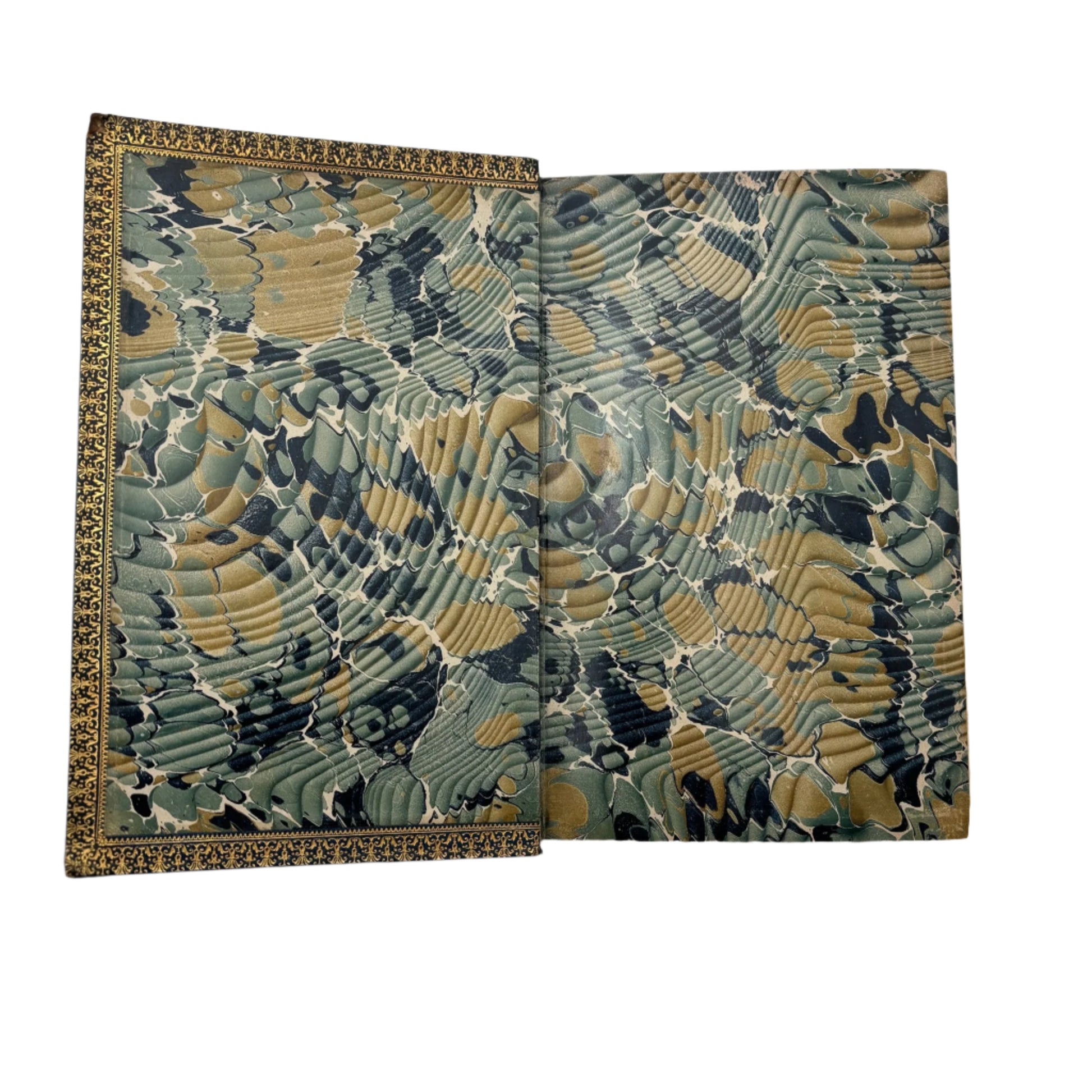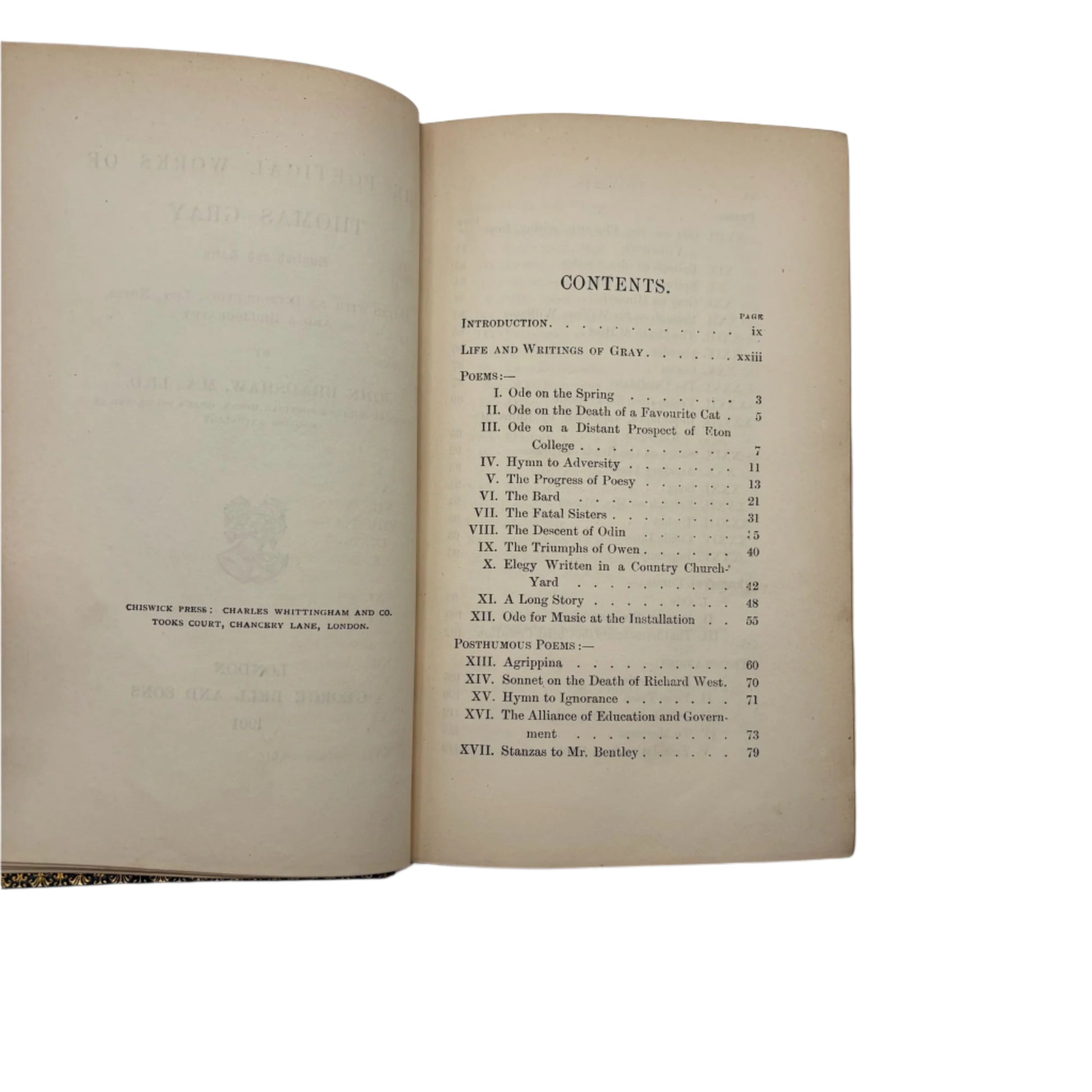 This antique 1901 edition of The Poetical Works of Thomas Gray is a beautifully preserved example of an English school prize book, bound in rich deep blue full leather with bright gilt tooling and the Marylebone Grammar School crest on the cover. Published in London by George Bell and Sons and edited by John Bradshaw, this volume brings together Gray’s most celebrated poems including Elegy Written in a Country Church-Yard, Ode on the Death of a Favourite Cat, and Odes on Spring, Music, and more. The book opens with a steel engraved portrait of Gray with his facsimile signature and features stunning green and gold marbled endpapers, gilt dentelles, and all edges gilt which give it a luxurious feel that makes it perfect for display. Inside, readers will find an introduction, Gray’s biography, and both his English and Latin poems, making this edition appealing not only for decorative collectors but also for poetry lovers who appreciate a classic literary voice. With its elegant craftsmanship and Edwardian charm, this is a standout piece that brings history, poetry, and fine binding together in a compact and collectible format.
