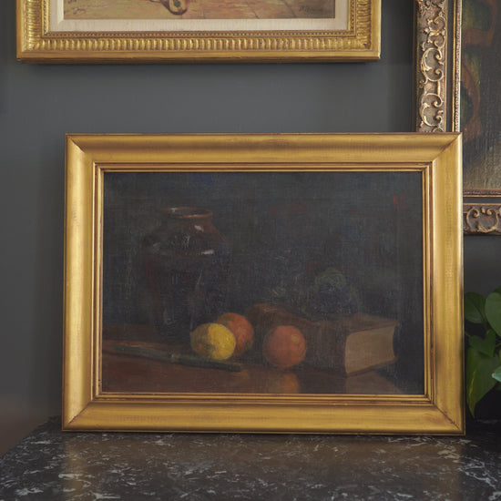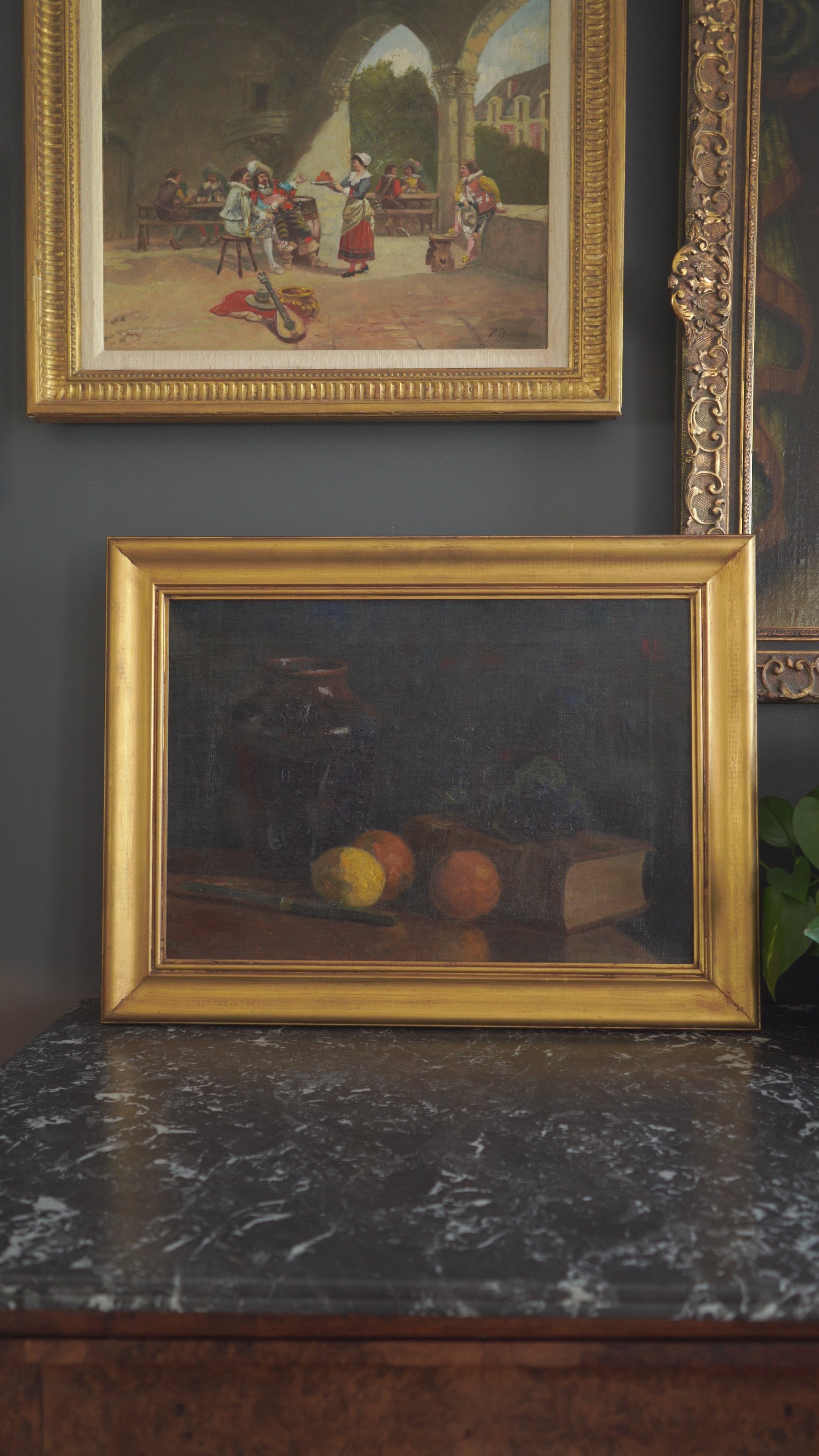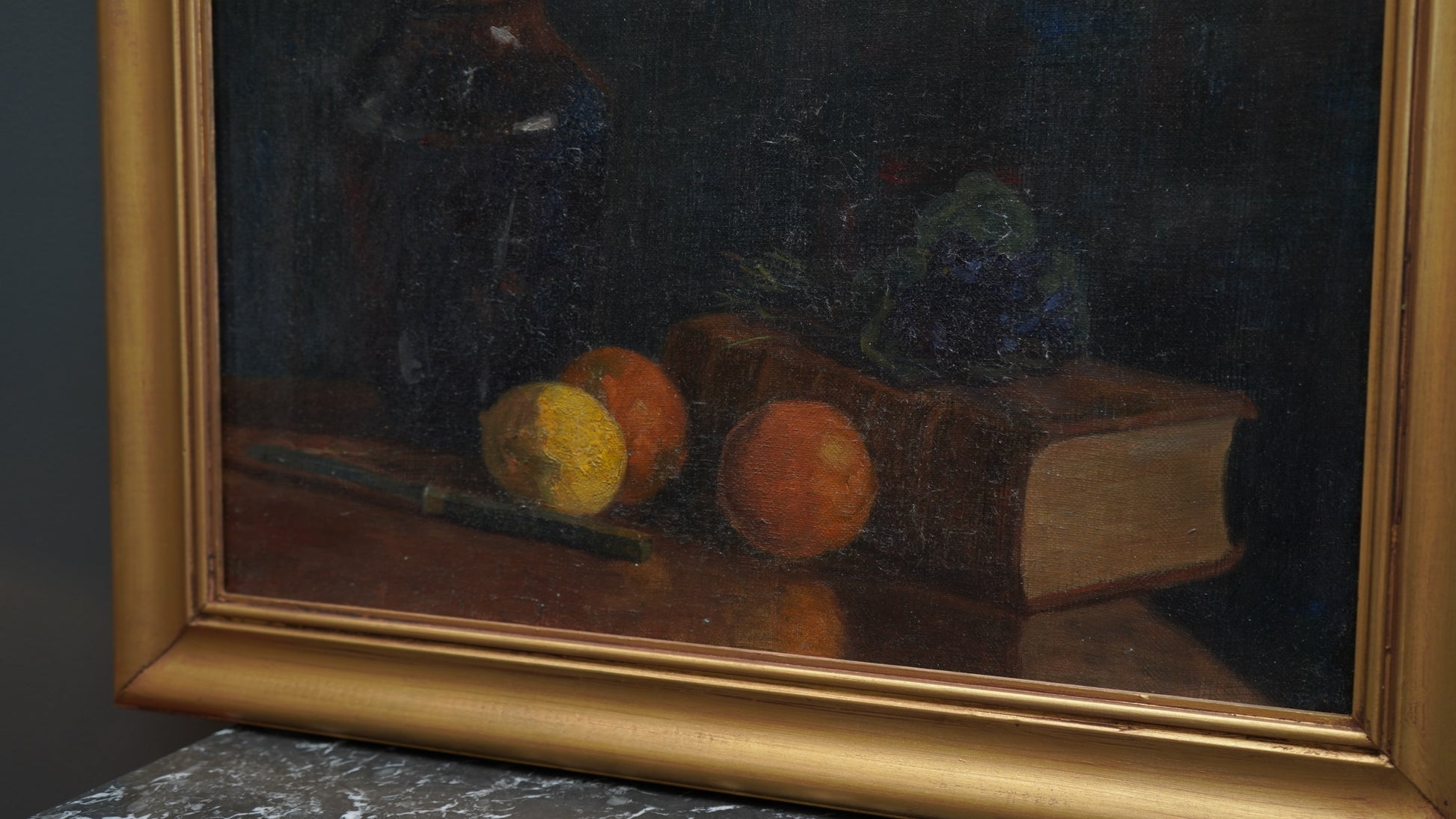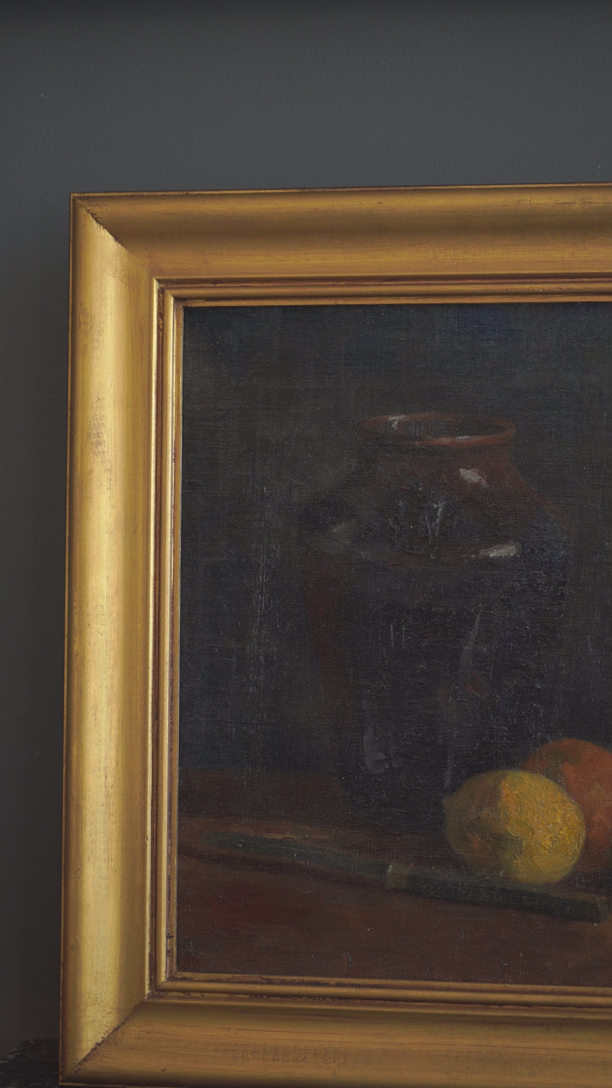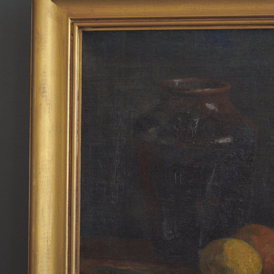 The painting is in good condition for its age, with a naturally aged surface showing scattered craquelure and light wear consistent with its date of 1905. The colors remain strong, particularly in the citrus fruit and earthenware jar, though there is expected darkening of the background from varnish aging. The canvas is securely stretched on its original wooden stretcher, with no evidence of relining. The gilt frame is later and shows minor scuffs and corner wear but complements the artwork well and remains structurally sound. Overall, the piece is stable and displays beautifully.