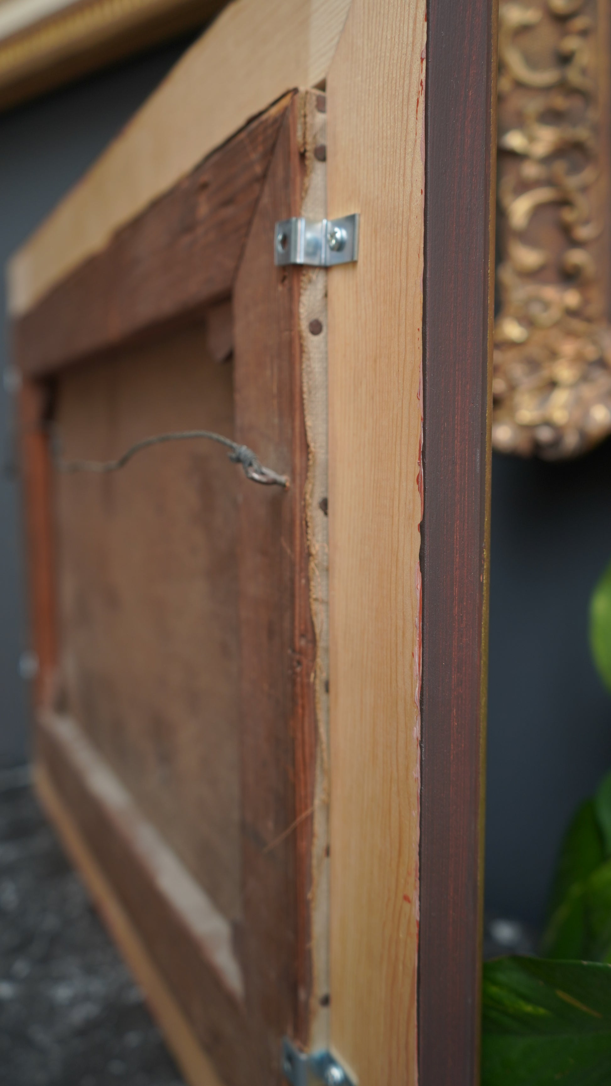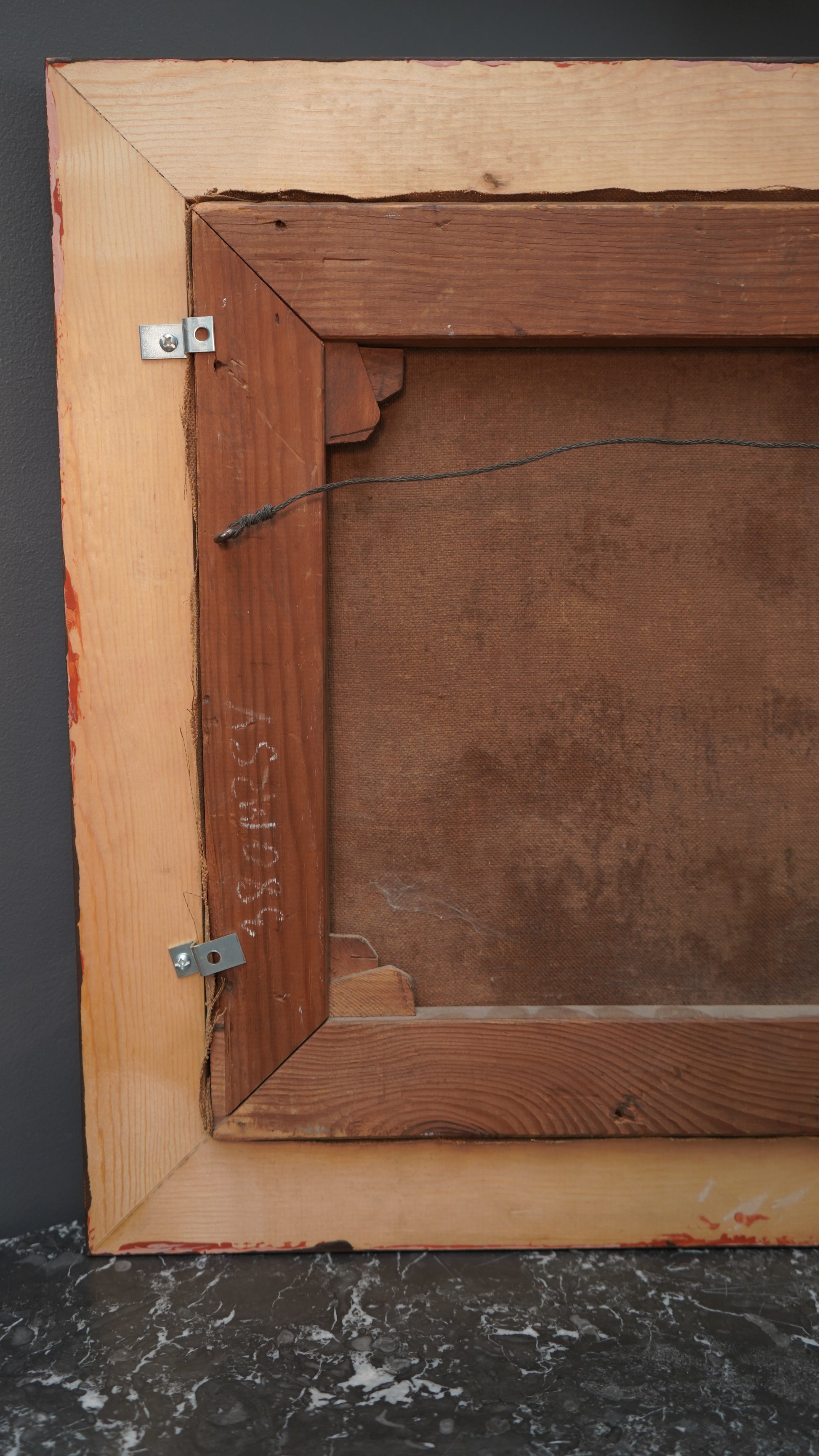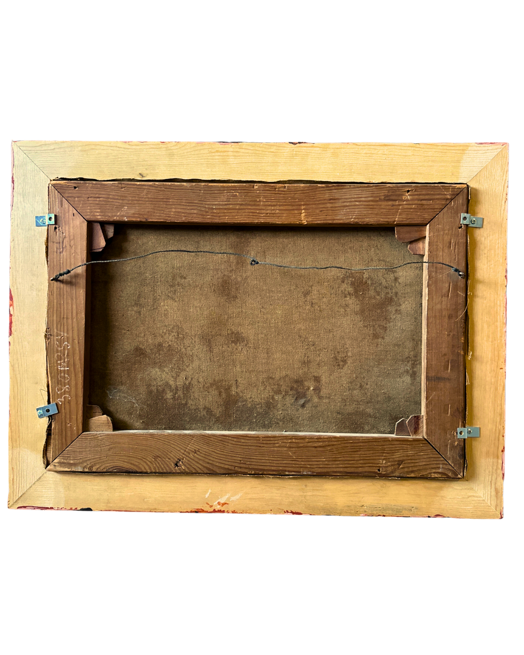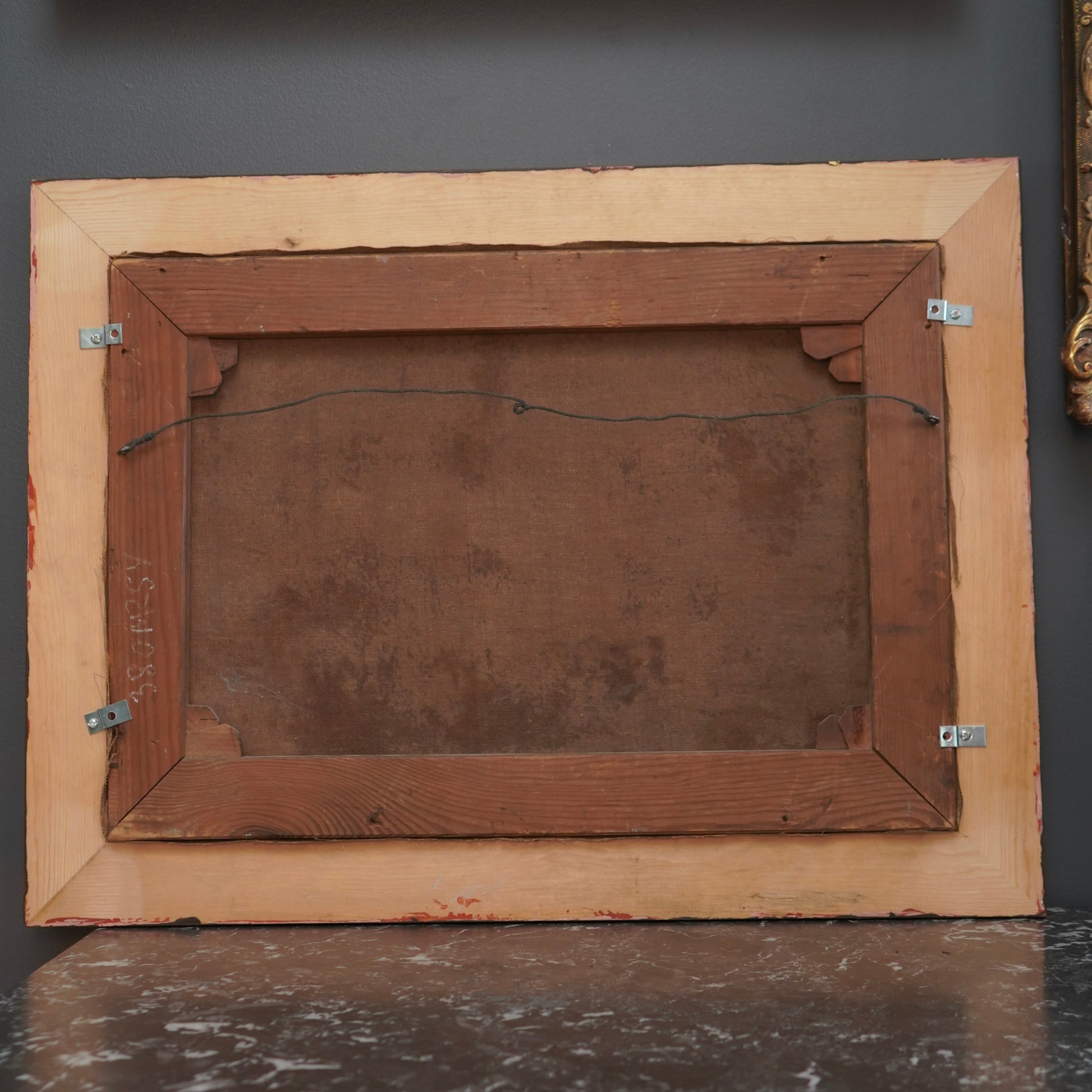 The painting is in good condition for its age, with a naturally aged surface showing scattered craquelure and light wear consistent with its date of 1905. The colors remain strong, particularly in the citrus fruit and earthenware jar, though there is expected darkening of the background from varnish aging. The canvas is securely stretched on its original wooden stretcher, with no evidence of relining. The gilt frame is later and shows minor scuffs and corner wear but complements the artwork well and remains structurally sound. Overall, the piece is stable and displays beautifully.