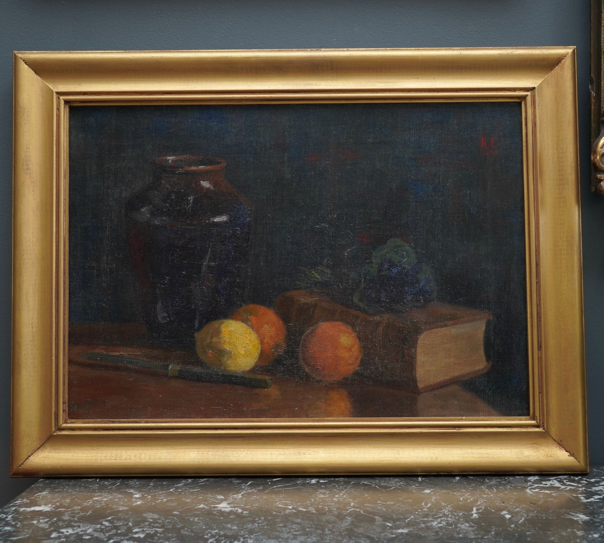 Antique 1905 Oil Painting Still Life with Fruit, Book & Earthenware Jar | Signed K.E.