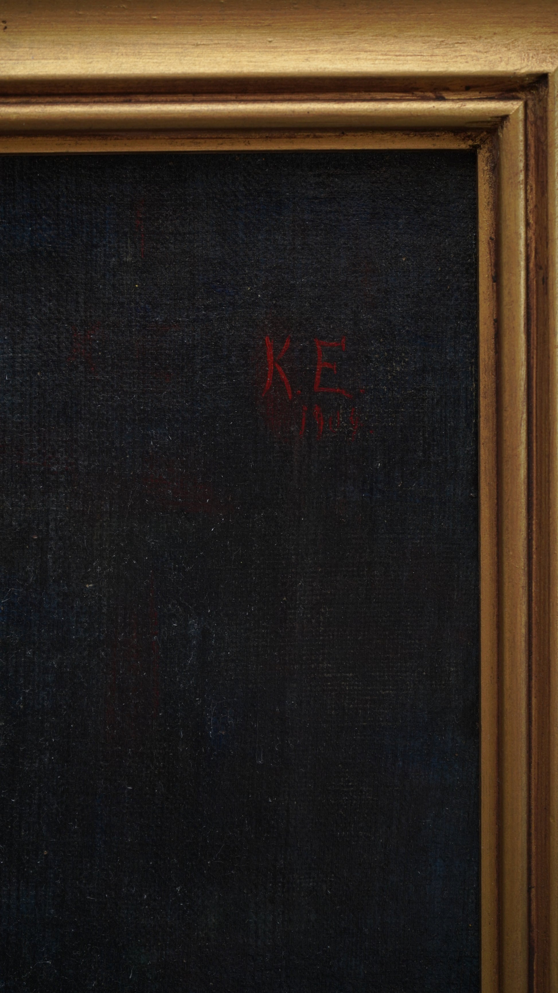 Clearly monogrammed “K.E.” in red with the date 1905 (possibly 1909) beneath. Monogram signatures were common in continental Europe (particularly German, Scandinavian, and Nordic painters).
