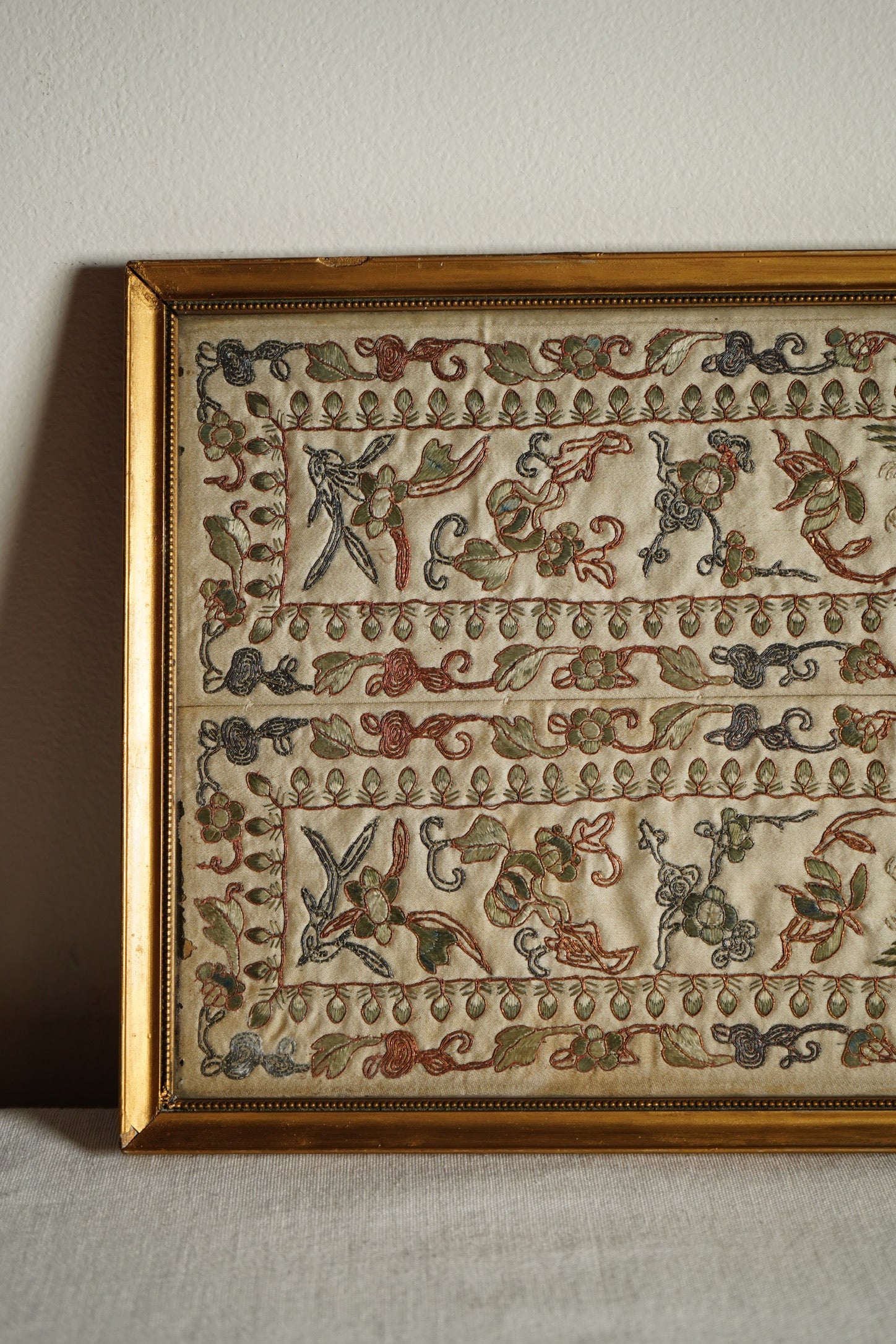 A graceful example of European textile artistry that bridges East and West, ideal for a dressing room, study, or layered gallery wall.
