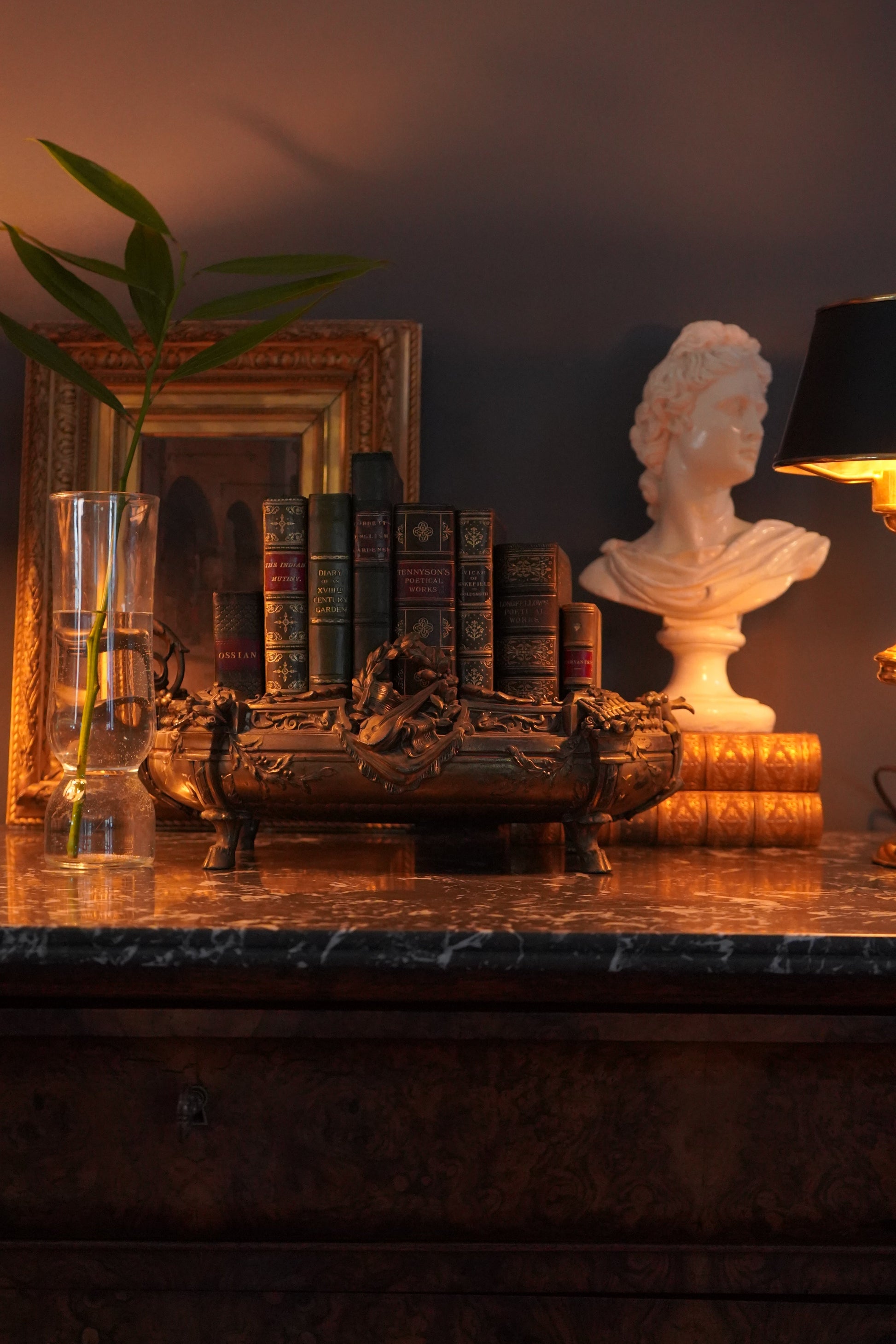 One handle missing, bottom / insert has been removed and the metal has heavy patina. Age-related wear.