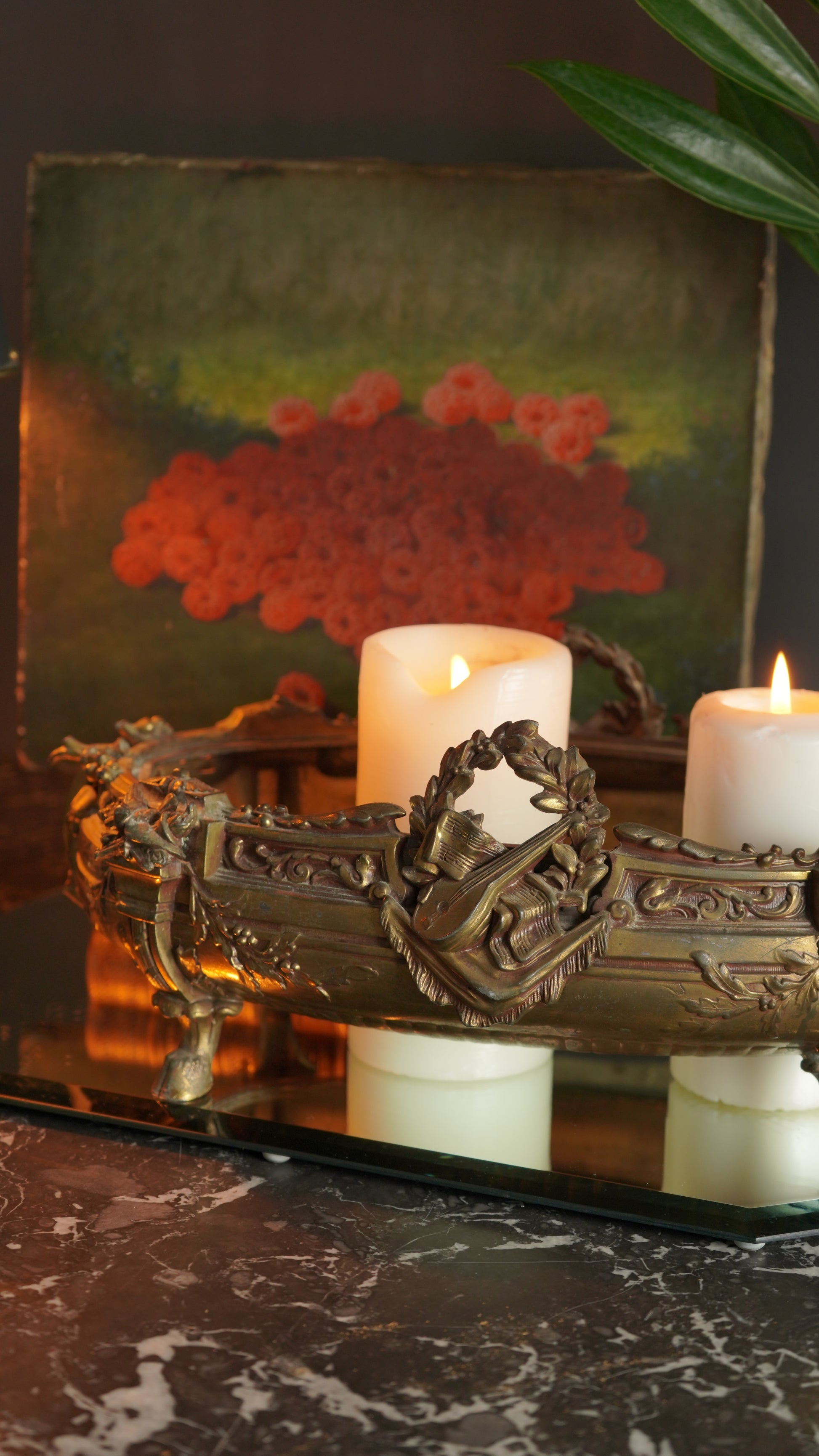 19th century French musical brass bronze jardiniere with mandolin, sheet music, birds and swags.