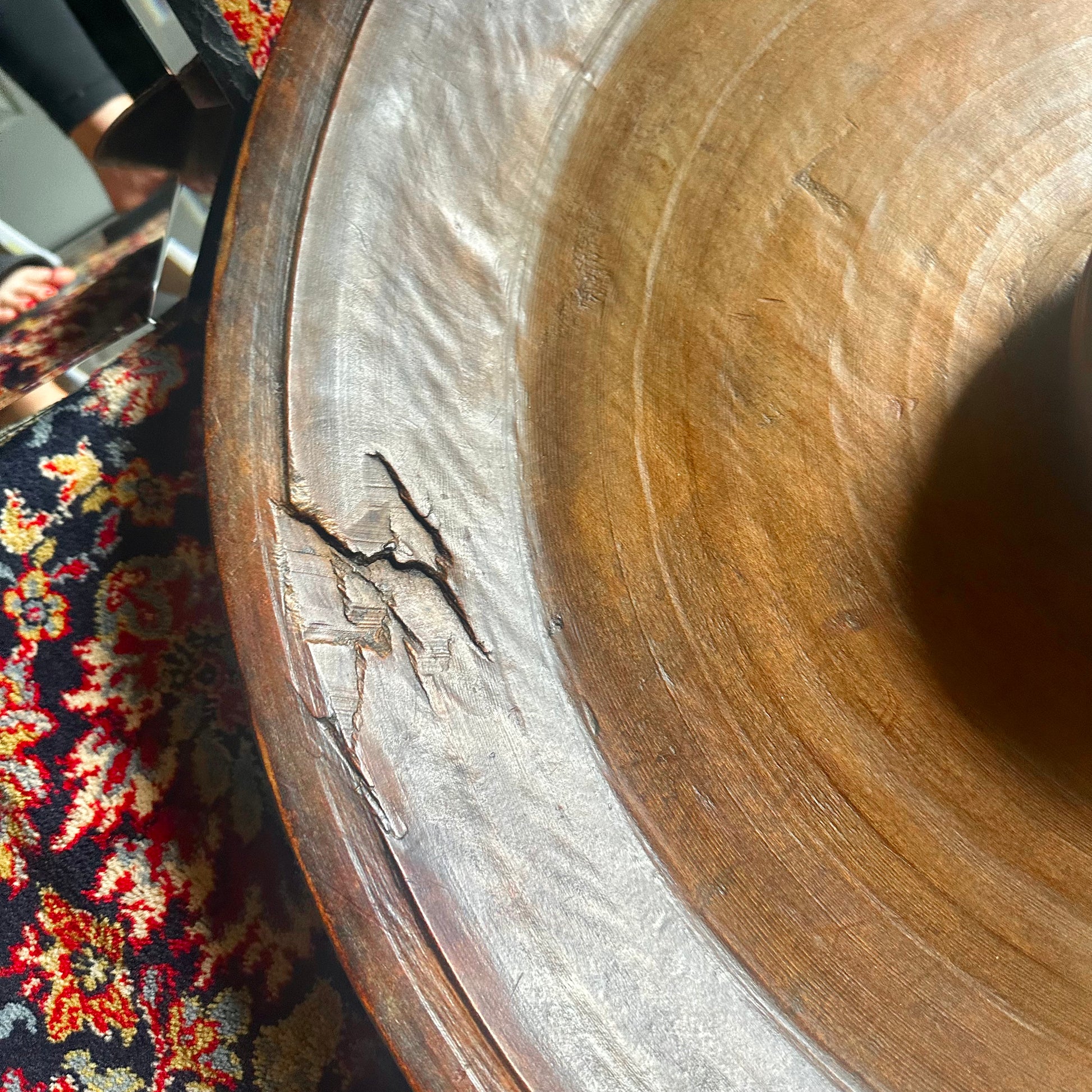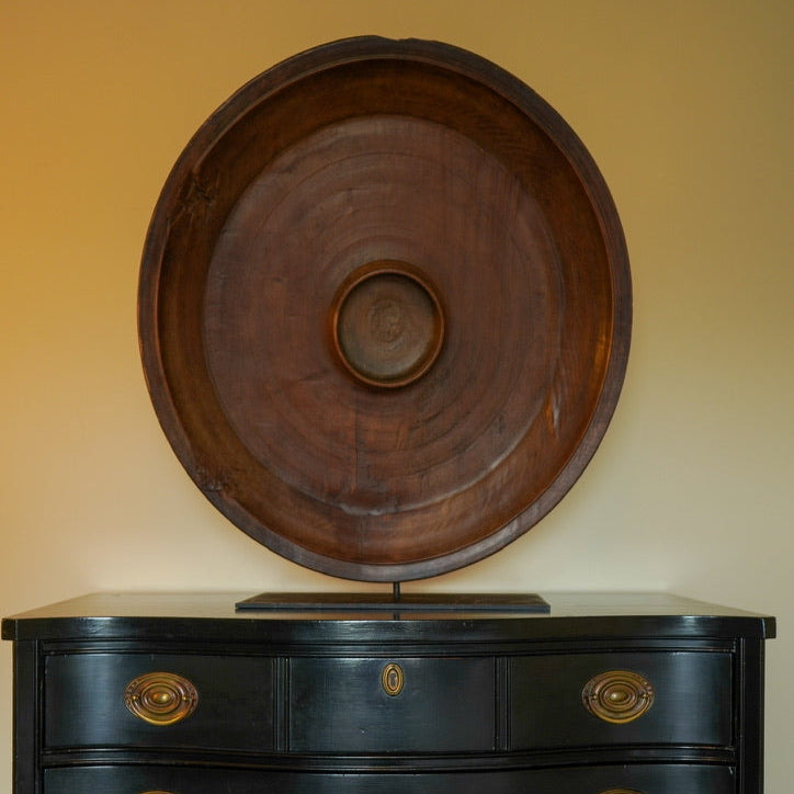 Whether styled as a primitive centerpiece, mounted as wall art, or used as a grounding element in a modern or wabi-sabi interior, this oversized wooden bowl is a true conversation piece. The unusual central well adds intrigue and historical mystery, some speculate it was for fermenting starters or pressing fruit.