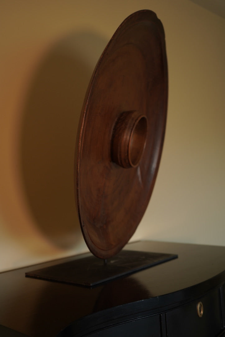 Now displayed on a custom black iron stand, the bowl takes on a sculptural presence that bridges rustic charm and high design. Perfect for interior designers, collectors of early woodenware, or anyone seeking a one-of-a-kind decorative object with a story.