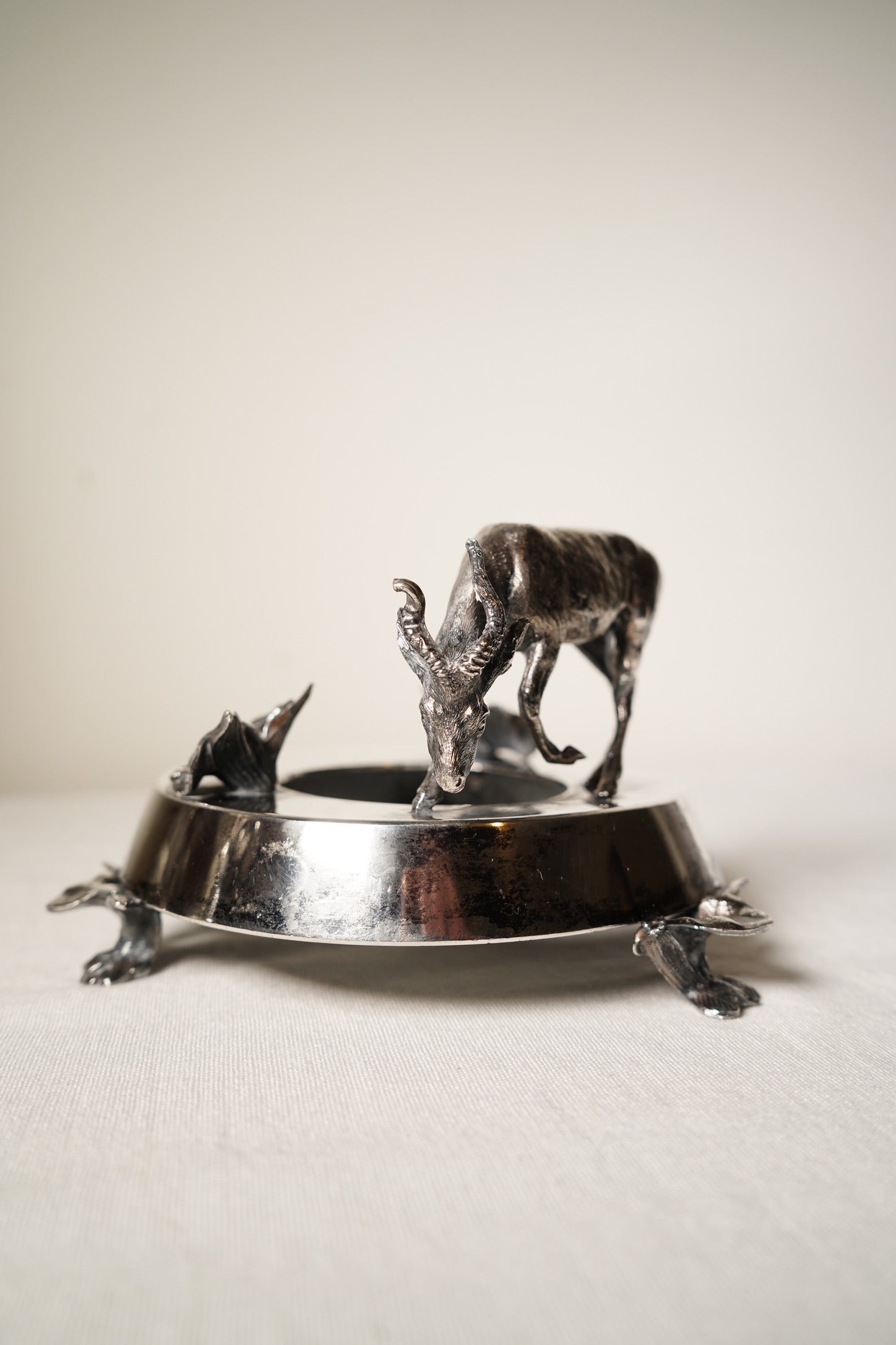 The sculpted mountain goat perched across the top is beautifully detailed, with curved horns and a dynamic posture that reflects Meriden’s fascination with naturalistic wildlife. Botanical leaf mounts form the base and give the stand elegant height and visual balancing. These sculptural touches made everyday table and desk accessories feel ornamental and theatrical, which was central to Victorian design.