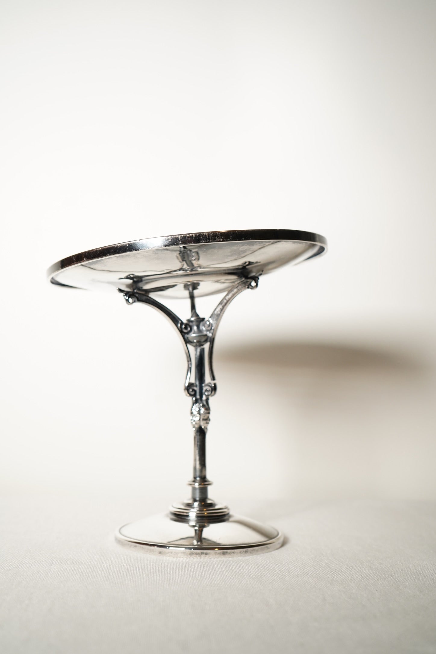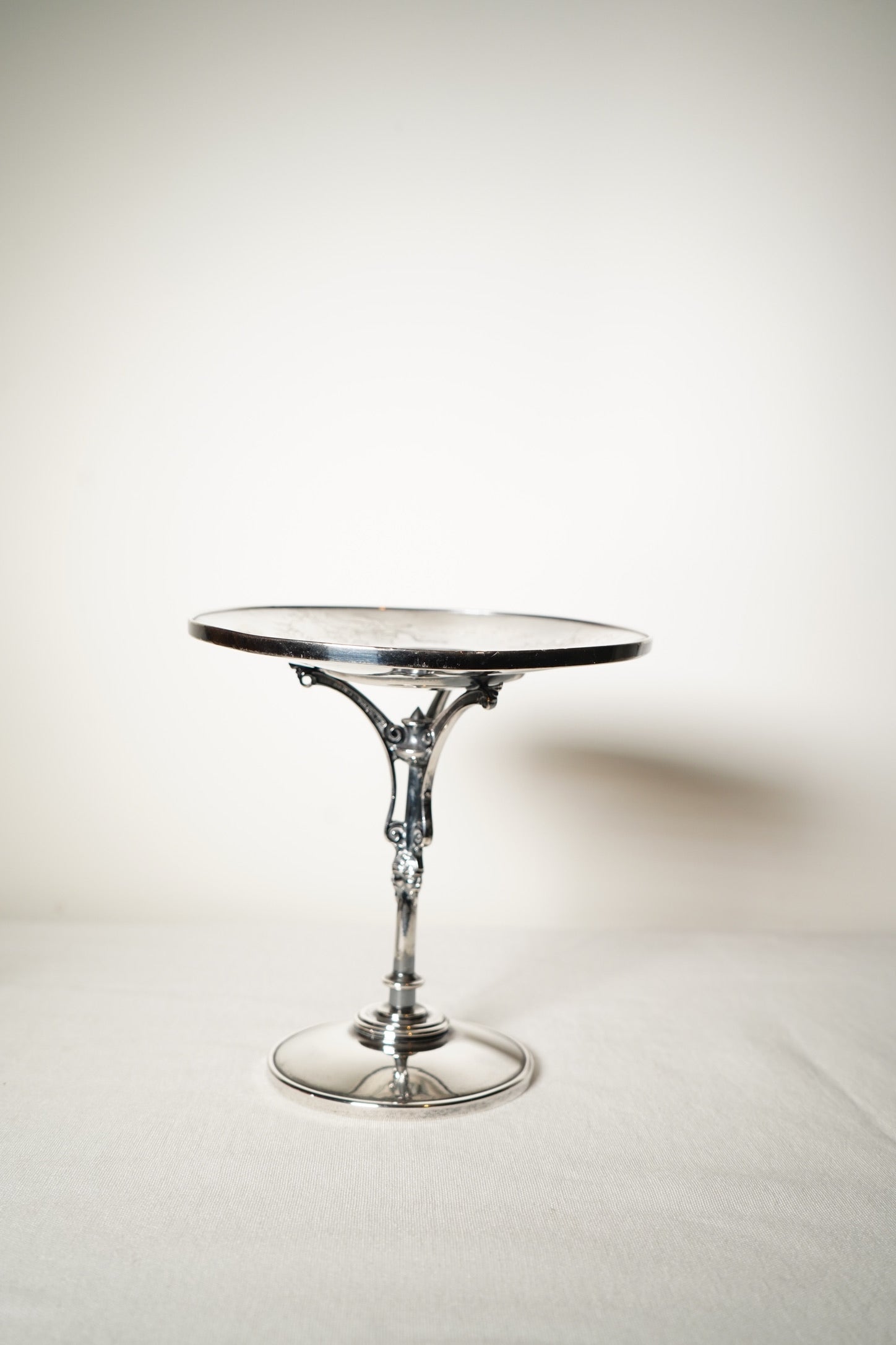 This late-19th-century Meriden silverplate tazza shows expected antique wear. There is gentle bending to the rim, normal surface scratches, and some soft dimpling in the metal from use. The silverplate exhibits patina throughout, and the pedestal metal is characteristically soft with minor signs of age. The piece remains structurally stable, with all three supports intact and beautifully detailed. Presents very well overall with authentic late-Victorian character.