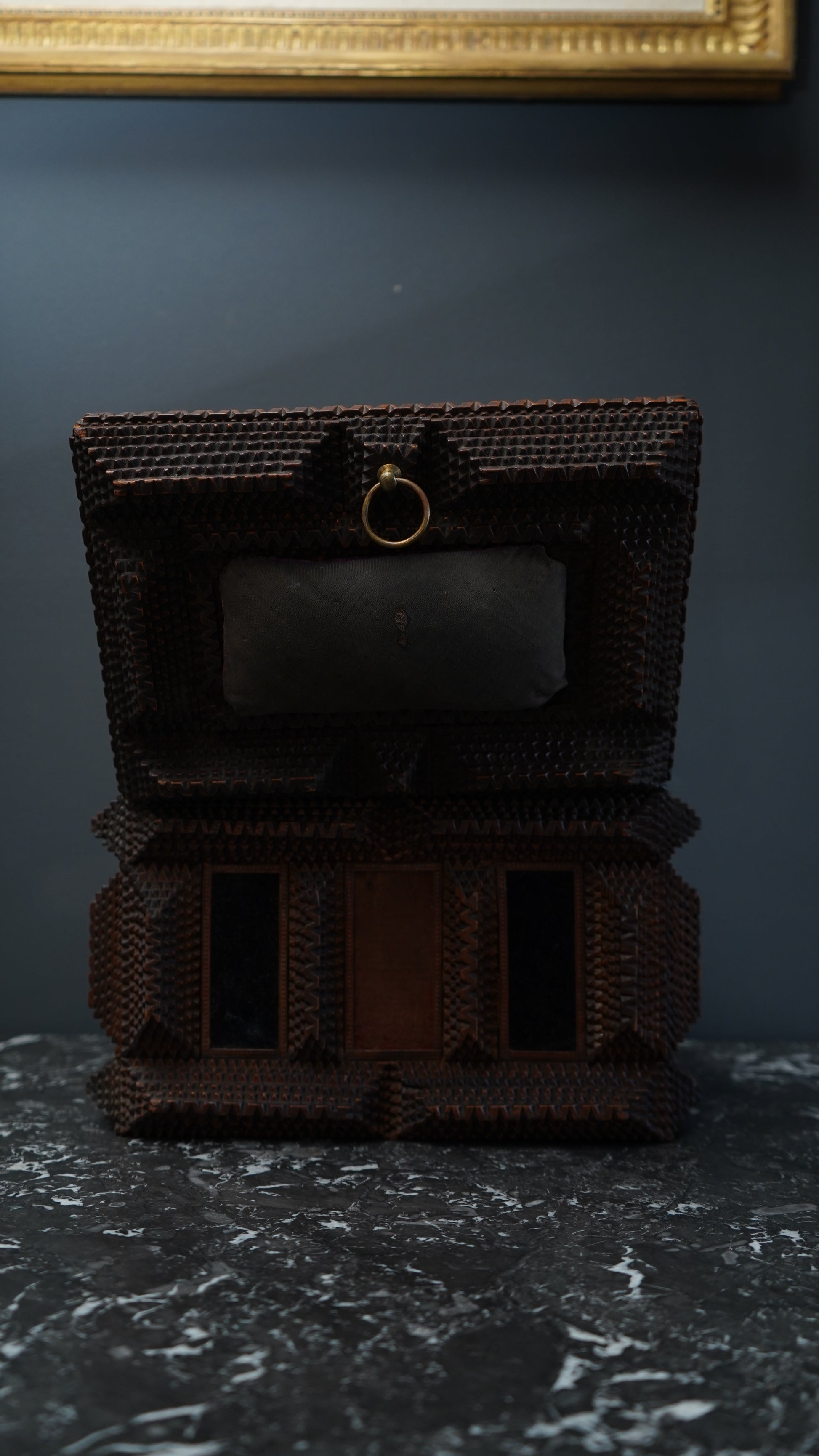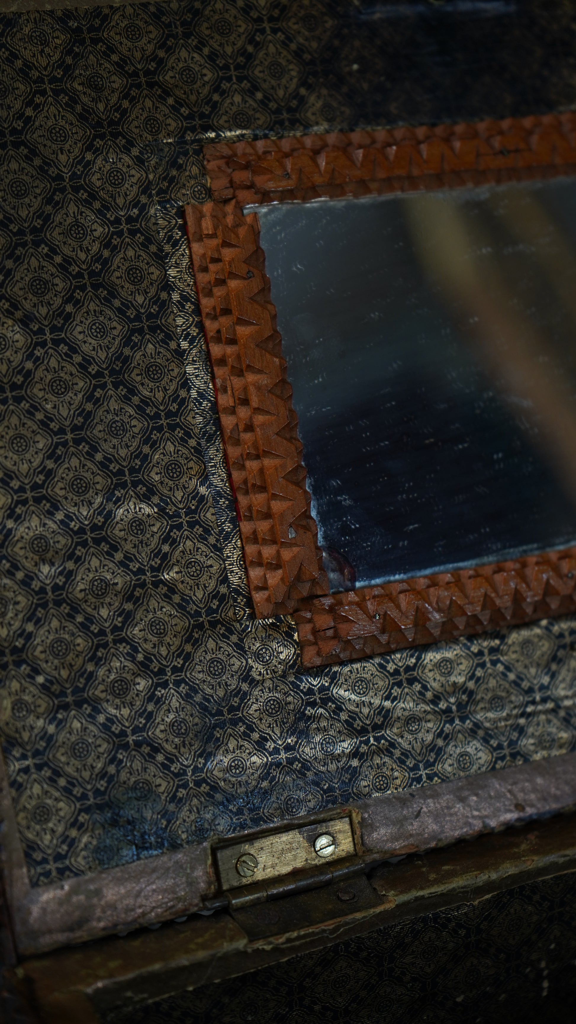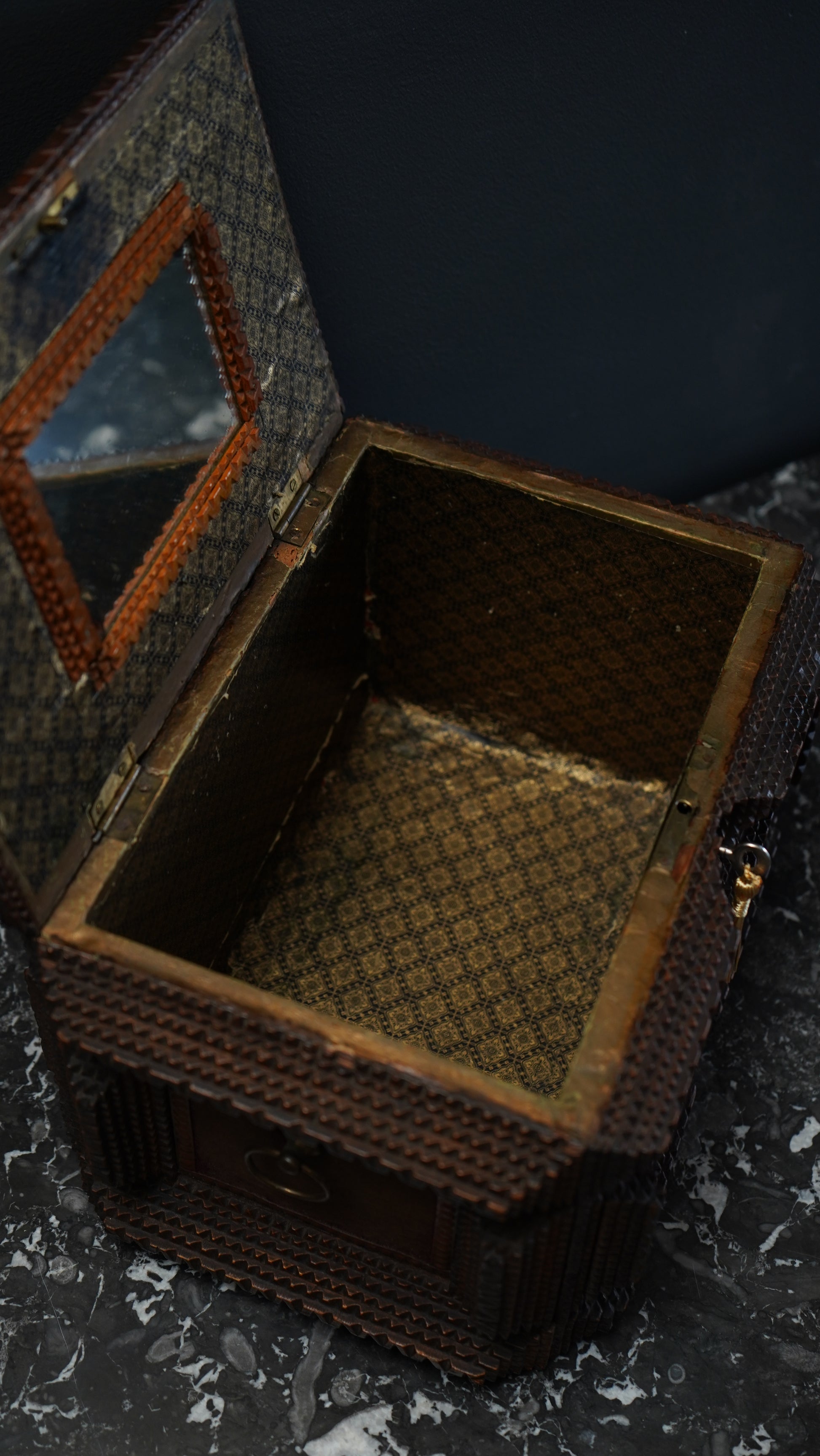 Antique Tramp Art Sewing Box with Drawers and Mirror, Hand-Carved Folk Art Keepsake Chest, Late 19th Century