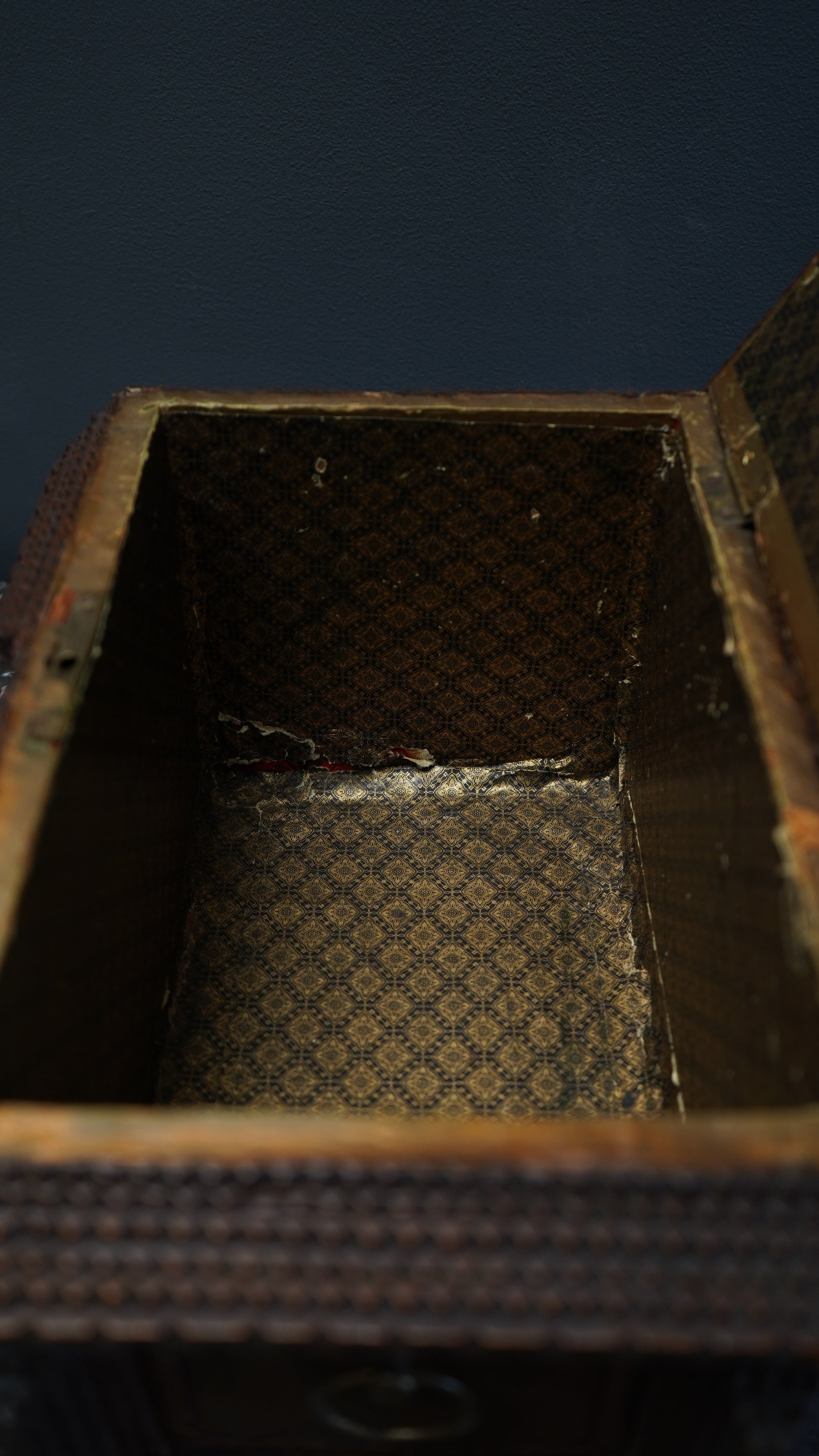 Shows age-appropriate wear including surface scuffs, minor chipping, and paper loss to the base lining. Missing key and portions of the original fabric lining. The mirror and interior paper appear original, showing expected discoloration and wear consistent with use. Structurally solid and displays beautifully. Please review all photos as part of the description.