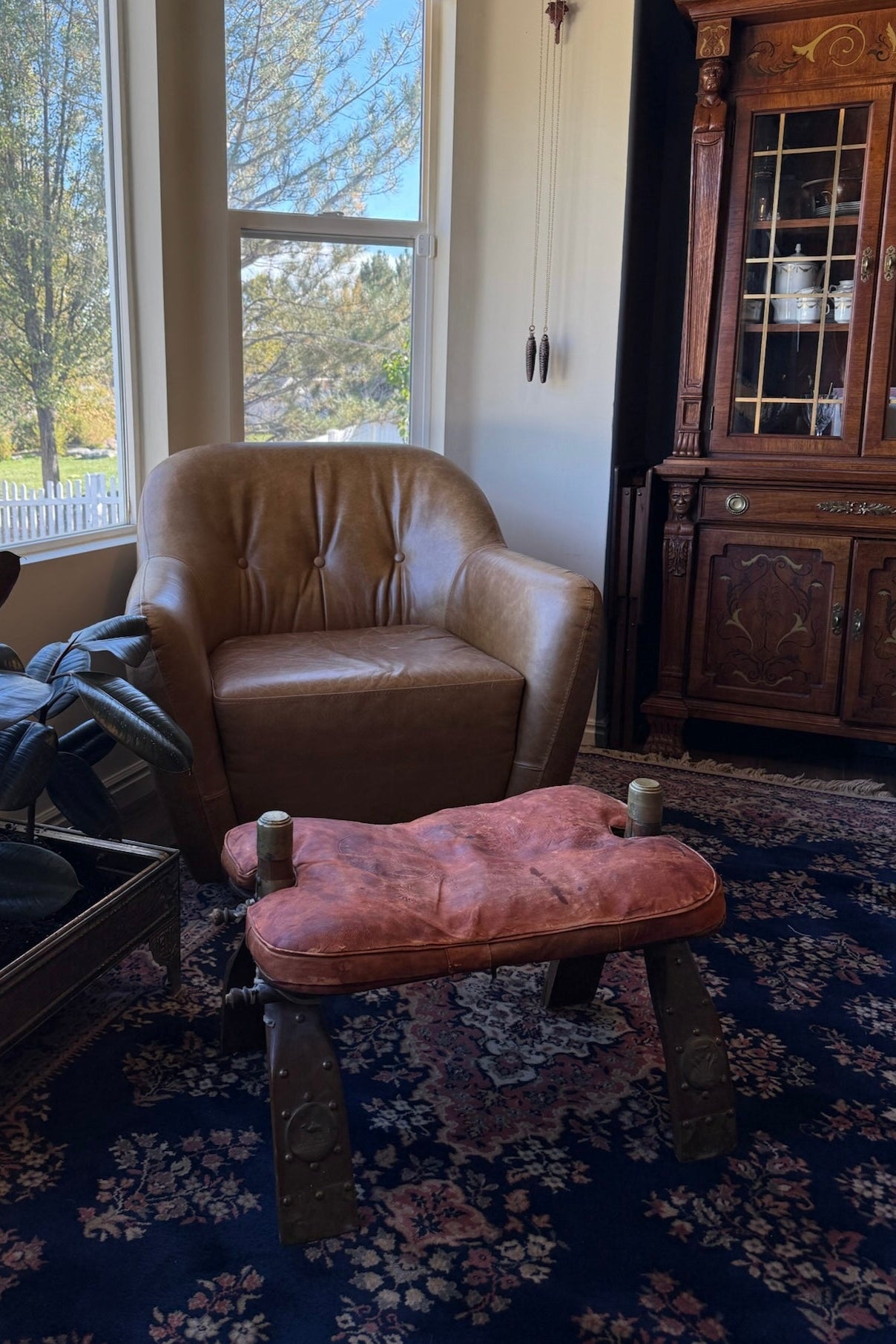 This vintage camel saddle stool, rooted in Middle Eastern tradition, was originally crafted for riding camels across desert terrains. Its distinctive design combines practical function with artistic flair, featuring a wooden frame secured by brass studs and legs decorated with repoussé brass medallions that may draw inspiration from ancient Egyptian or Pharaonic motifs. The hand-tooled leather seat, embossed with symbolic scenes, has aged beautifully, enriching its cultural story. Filled with straw, the reddish-brown cushion offers surprising comfort despite its compact size. Popular among mid-20th-century travelers and British officers in regions like Oman and Egypt, these stools now serve as striking decorative and functional pieces in a variety of settings.