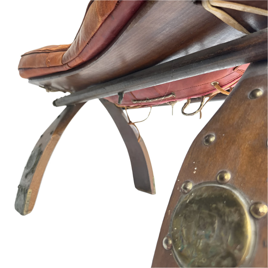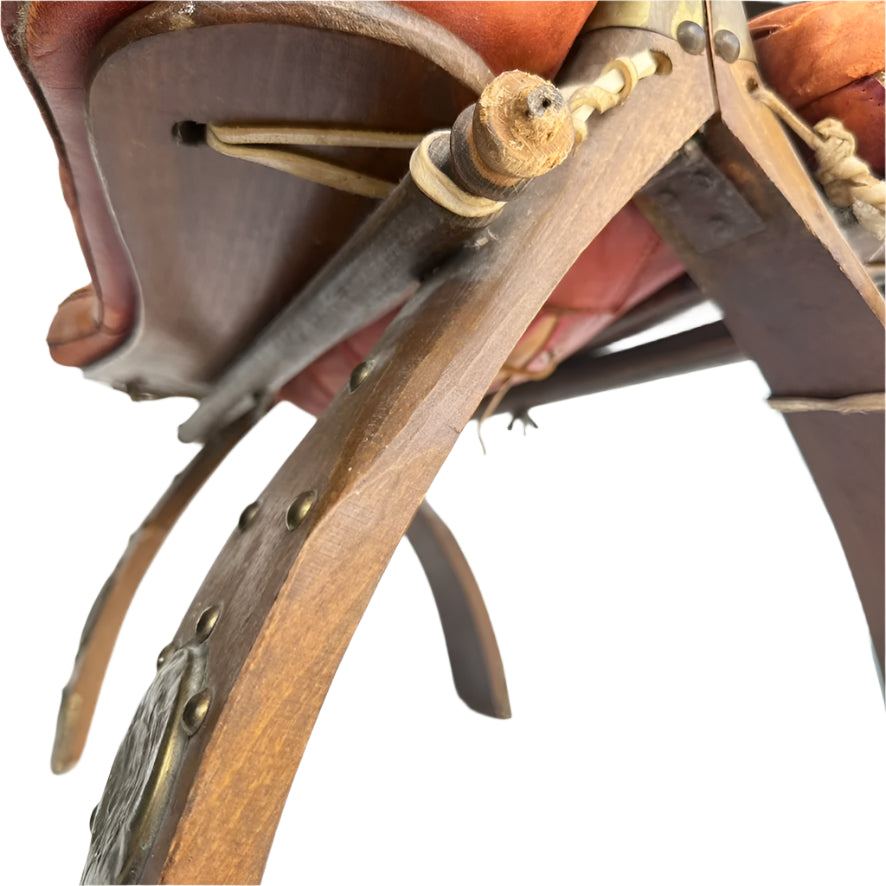 This vintage camel saddle stool remains sturdy and well-built, showing wear that matches its age and use. The hardwood frame has minor surface scratches, but the legs are securely joined, ensuring solid construction. Brass medallions and capped joints are intact, featuring natural oxidation and patina that enhance its vintage charm. The original straw-filled leather cushion boasts a rich patina with clear embossed designs, though one side has a tear revealing the straw inside. The leather shows some cracking and wear, and the underside rope ties are mostly intact, with slight fraying in places.