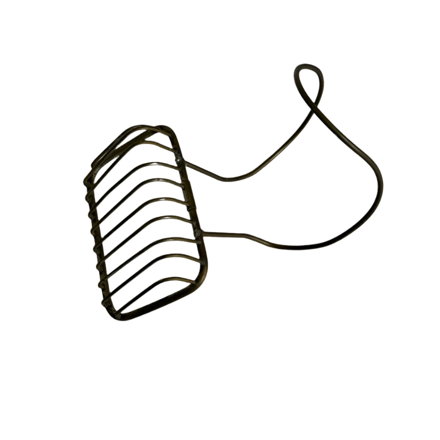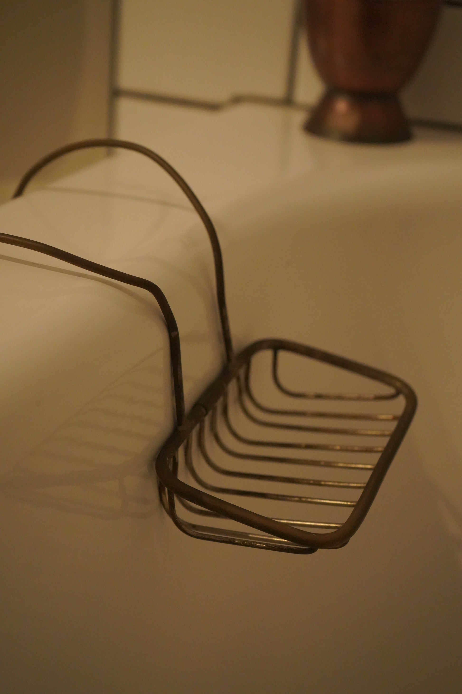 Meet your new favorite bathroom accessory: a genuine late-Victorian brass soap basket (circa 1890–1920) that simply hooks over the rim of your tub and gives your daily routine a dash of old-school charm. Crafted from solid brass wire and left with its mellow honey patina intact, it drains water beautifully so your soap stays firm and lasts longer. Compact enough for any bath—around 5″ wide and 3″ deep—this little basket was once a must-have in homes where soaking was as much about relaxation as getting clean. Originals like this are hard to find (most got swapped for chrome in the 1930s–’40s).