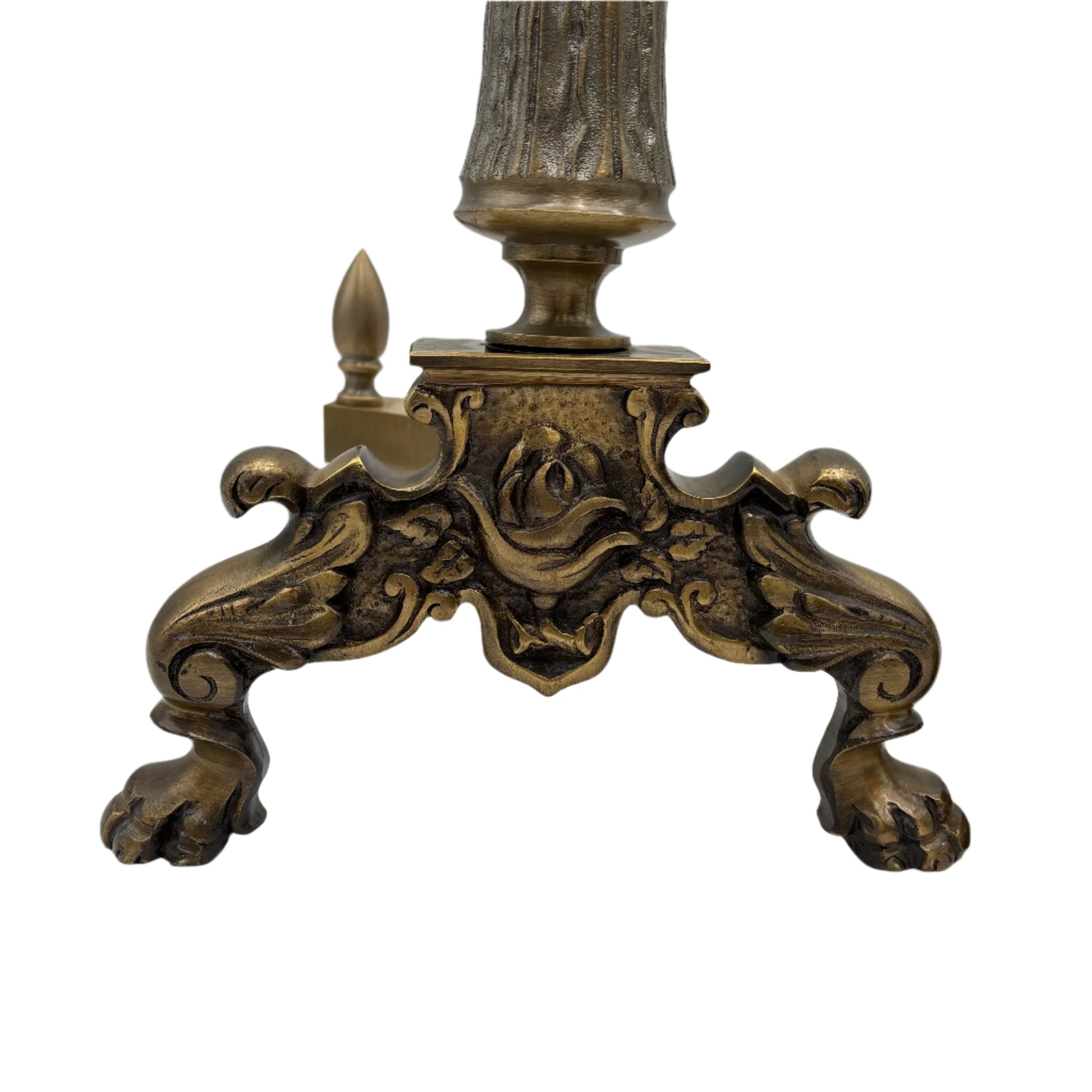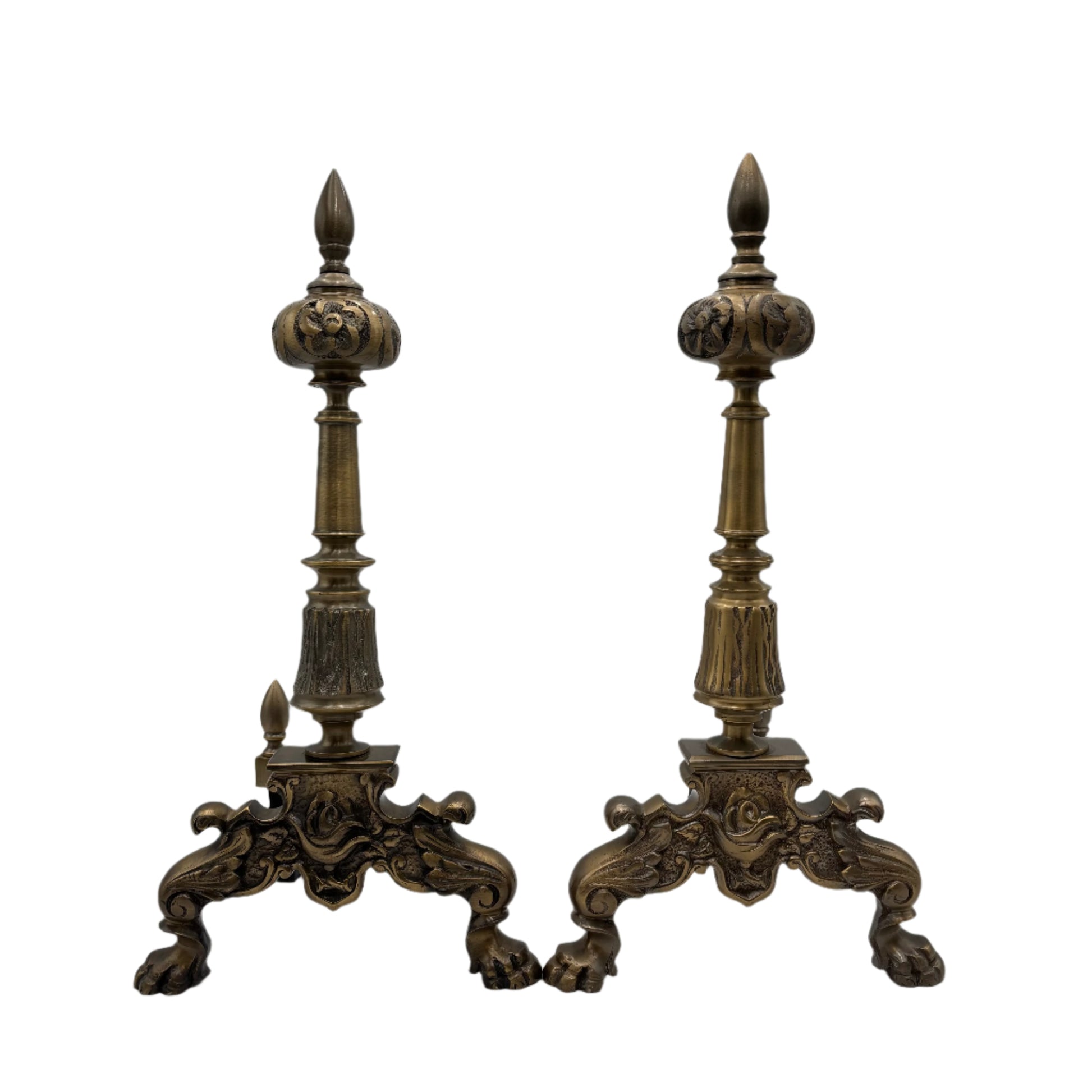 Pair of Late Victorian-Era Brass & Iron Andirons, Rococo Revival Style